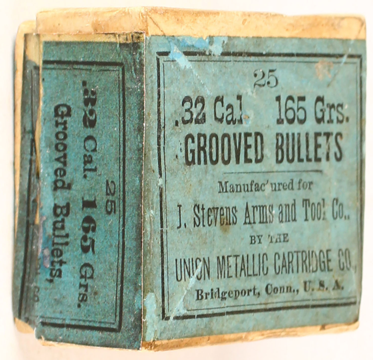 UMC, .32 Cal. 165 Grs. Grooved Bullets, Partial 16rds, 2pc. Buff box with blue wraparound label, box is solid with very good color, some age soiling, minor corner & edge wear, front has been written on, tape on right end, bullets are excellent. Grade: Very Good + - Value: 10 to 50