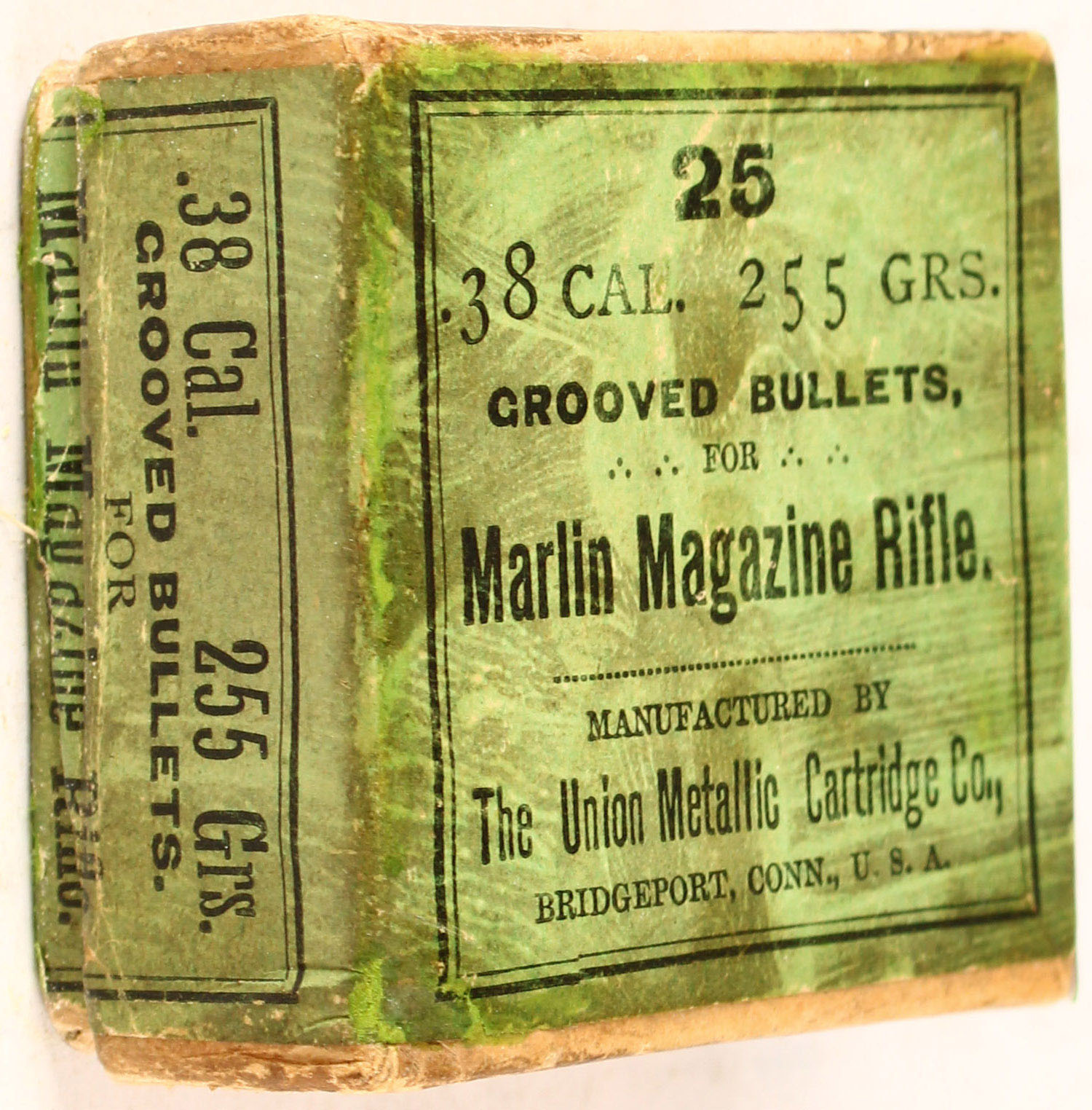 UMC, .38 Cal. 255 Grs. Grooved Bullets for Marlin Magazine Rifle, Full, 2pc. Buff box with green wraparound label, box is solid with very good color, age soiling, some edge & corner wear, front has been written on, label is intact, bullets are excellent. Grade: Very Good ++ - Value: 20 to 60