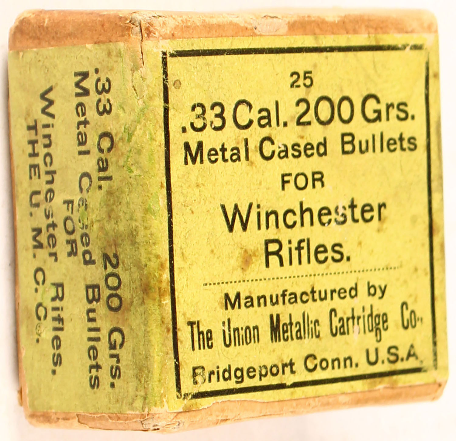 UMC, .33 Cal. 200 Grs. Metal Cased Bullets for Winchester Rifles, Full, 2pc. Buff box with green wraparound label, box is solid with excellent color, minor age soiling, minor edge & corner wear, label is intact, bullets are excellent. Grade: Excellent - Value: 20 to 60