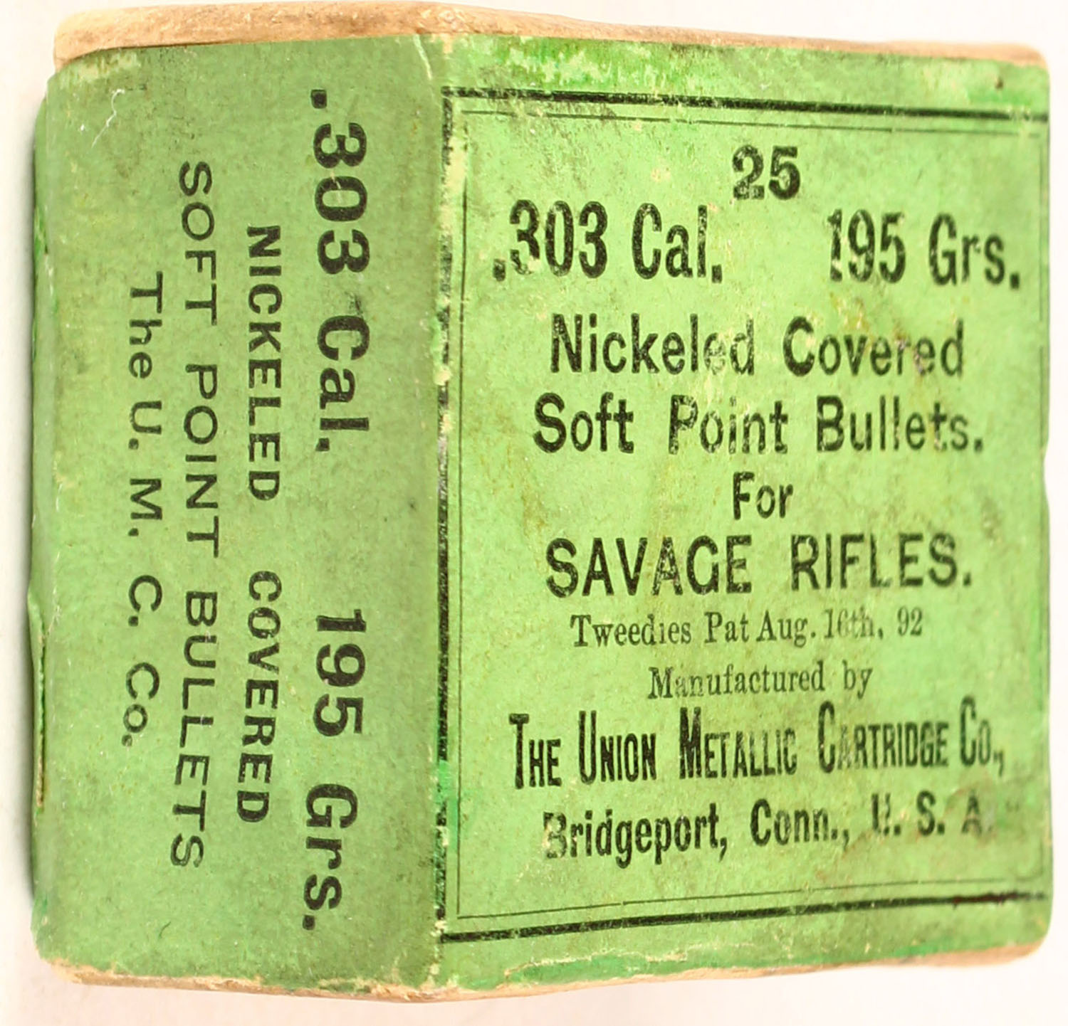 UMC, .303 Cal. 195 Grs. Nickeled Covered Soft Point Bullets, FULL & SEALED, 2pc. Buff box with green wraparound label, box is solid with excellent color, some age soiling, very minor shelf & corner wear, edges are mostly crisp, label is intact. Grade: Excellent - Value: 10 to 60