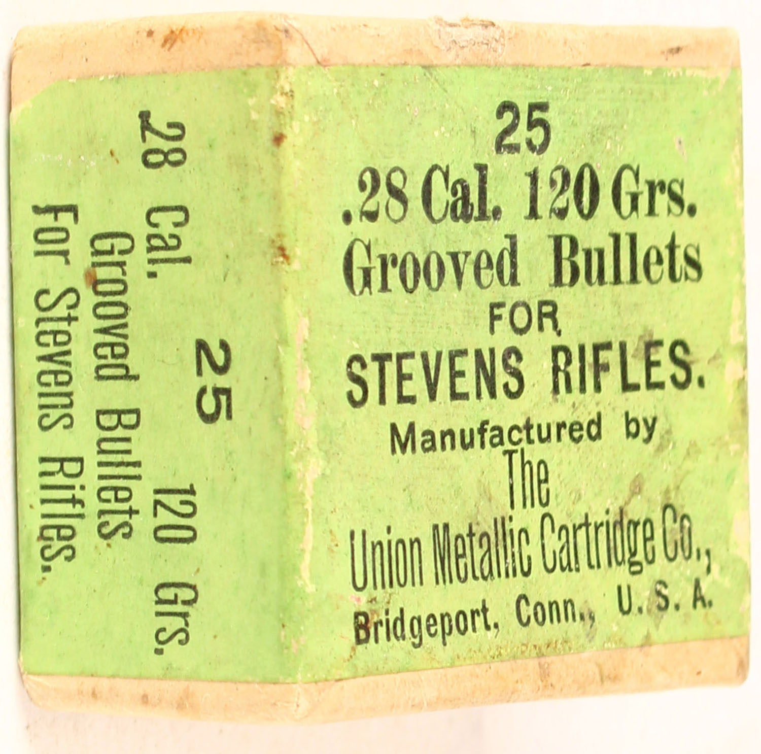 UMC, .28 Cal. 120 Grs. Grooved Bullets for Stevens Rifles, FULL & SEALED, 2pc. Buff box with green wraparound label, box is solid with excellent color, very minor age soiling, very minor edge & corner wear, label is intact. Grade: Excellent + - Value: 20 to 60