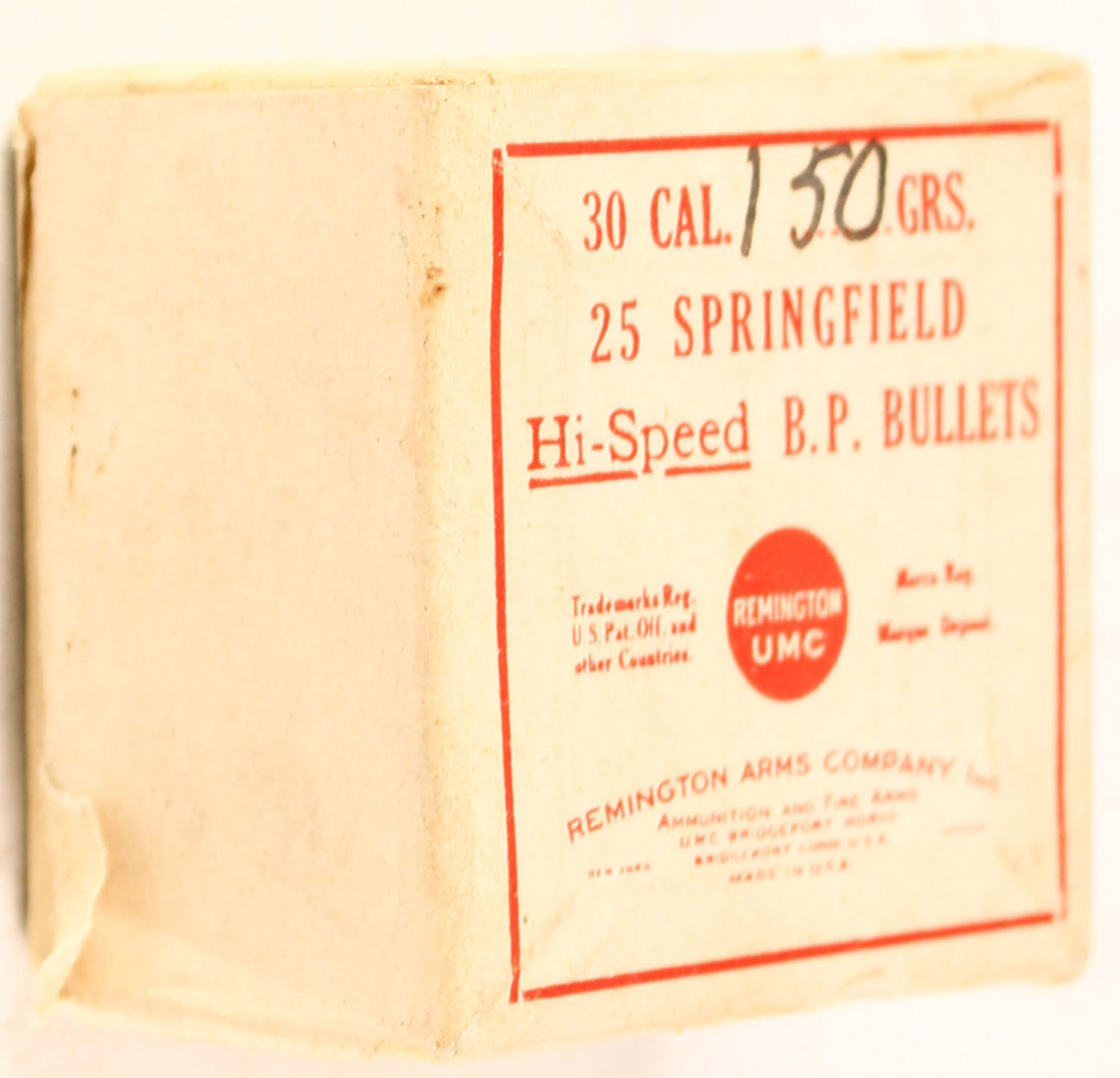 REM-UMC, .30 Cal. Springfield, 150 Grs. Hi-Speed B.P. Bullets, Full, 2pc. Buff box with white & red label, box is solid with excellent color, very minor age soiling, vertical seam splits to both corners of right end of lid, very minor corner wear, edges are mostly crisp, bullets are excellent. Grade: Very Good ++ - Value: 4 to 50