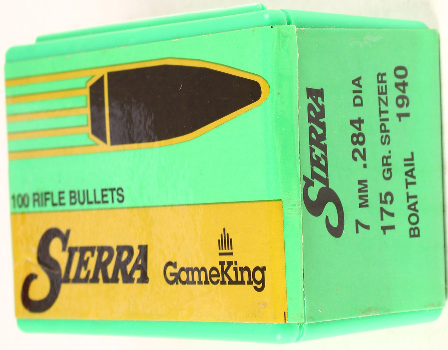 Sierra, GameKing, 7mm (.284 Dia,) 175 Gr. Spitzer Boat Tail, Full, 1pc. Green plastic box, box is near mint, bullets are mint. Grade: Excellent ++ - Value: 10 to 50