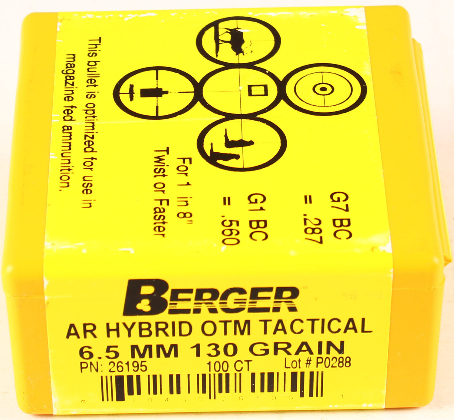 Berger, AR Hybrid OTM Tactical, 6.5mm, 130 Grain J4 Precision Jackets, FULL & SEALED, 1pc., Multi-colored box, box is solid with great color. Grade: Excellent ++ - Value: 20 to 100