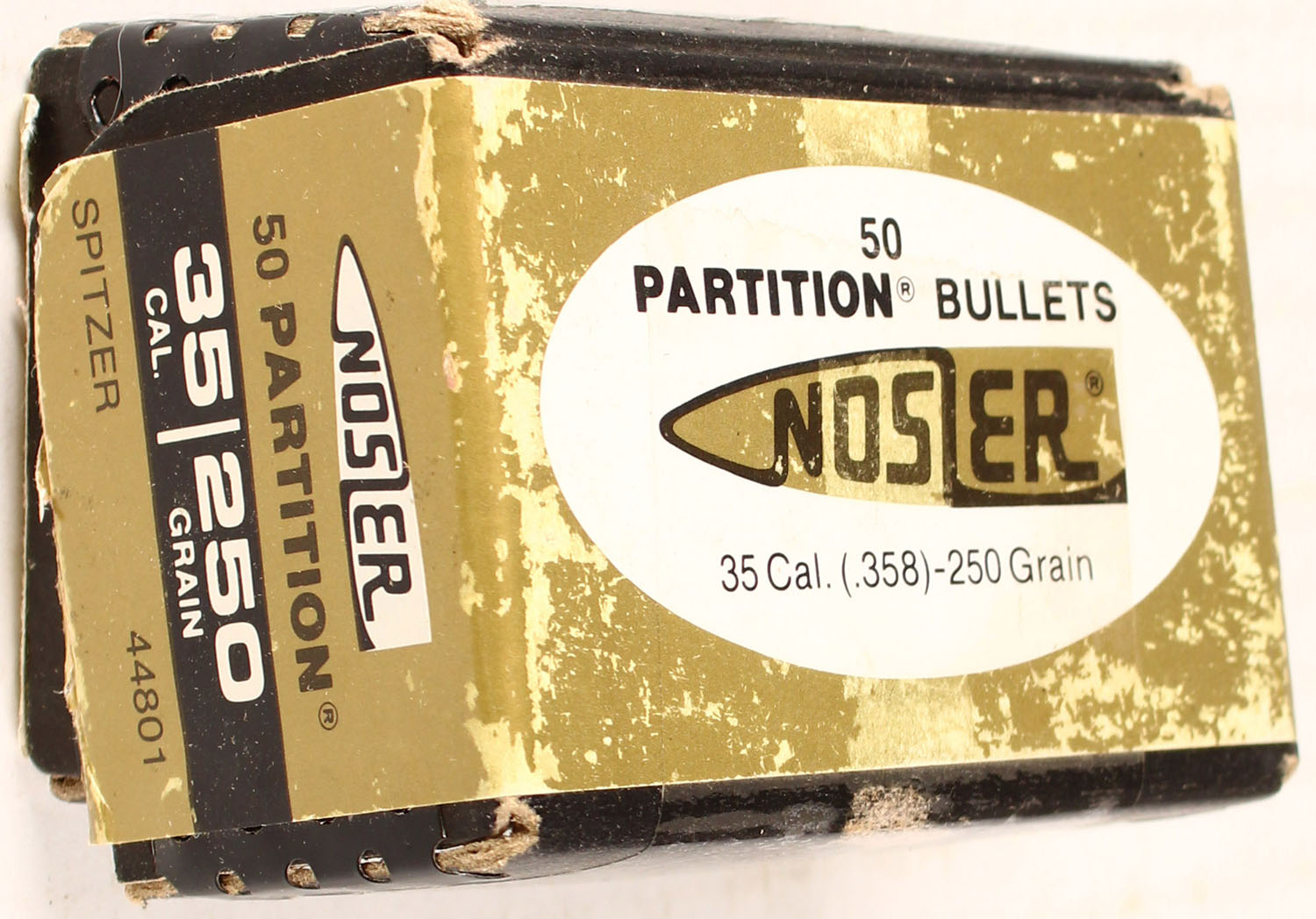 Nosler, Partition, 35 Spitzer, 250 Grain, Full, 1pc., Multi-colored box, box is solid with great color, Bullets are excellent. Grade: Very Good ++ - Value: 20 to 100