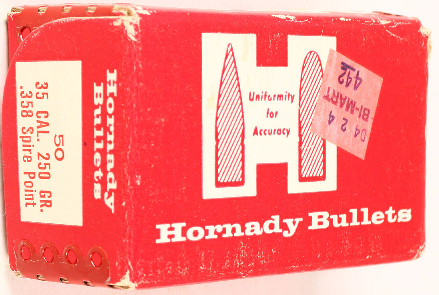 Hornady, caliber 35, 250 Grain Spire Point, FULL & SEALED, 1pc., multi-colored box, box is solid with very nice colors but has light shelf wear & scuffing. Grade: Very Good ++ - Value: 20 to 100