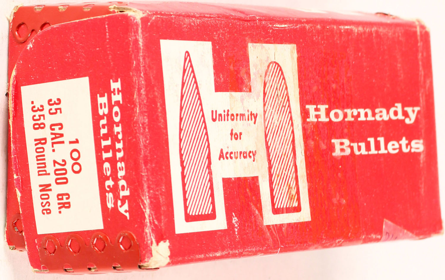Hornady, caliber 35, 200 Grain Round Nose, Full, 1pc., multi-colored box, box is solid with great colors, Ammo is excellent. Grade: Excellent - Value: 20 to 100