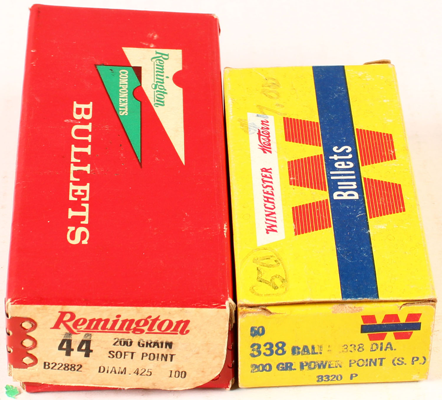 Mixed Mfg., Lot of (2), caliber 44/338, 200 Grain, Full, 1pc., multi-colored box, box is solid with great colors, Ammo is excellent. Grade: Excellent + - Value: 20 to 100