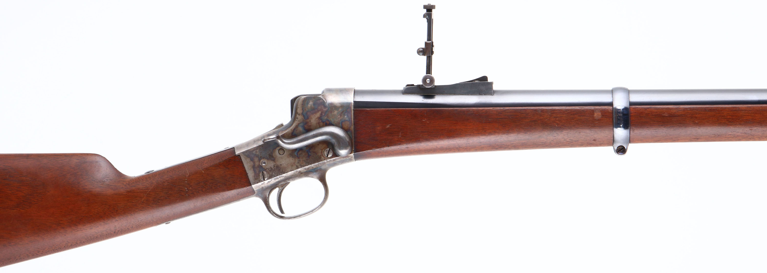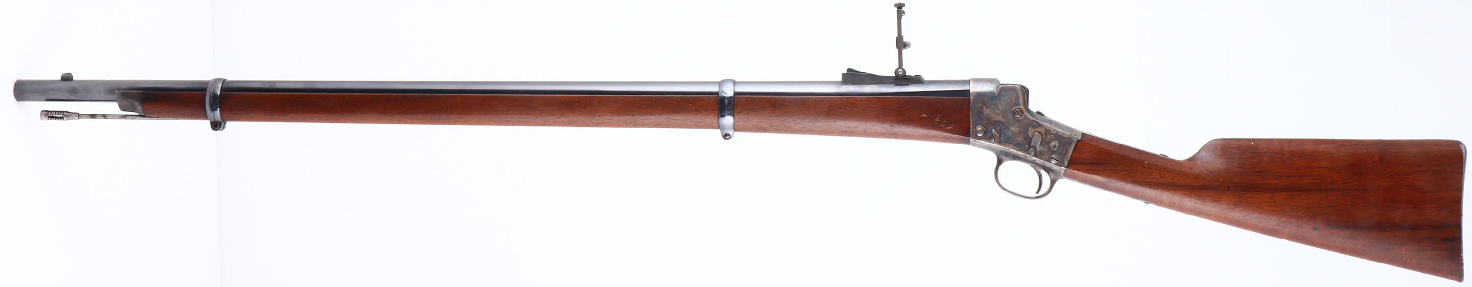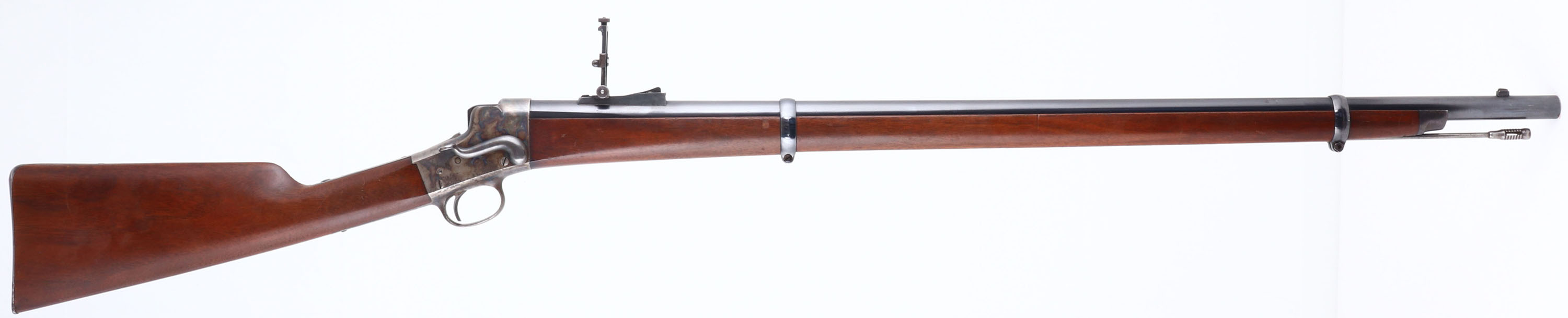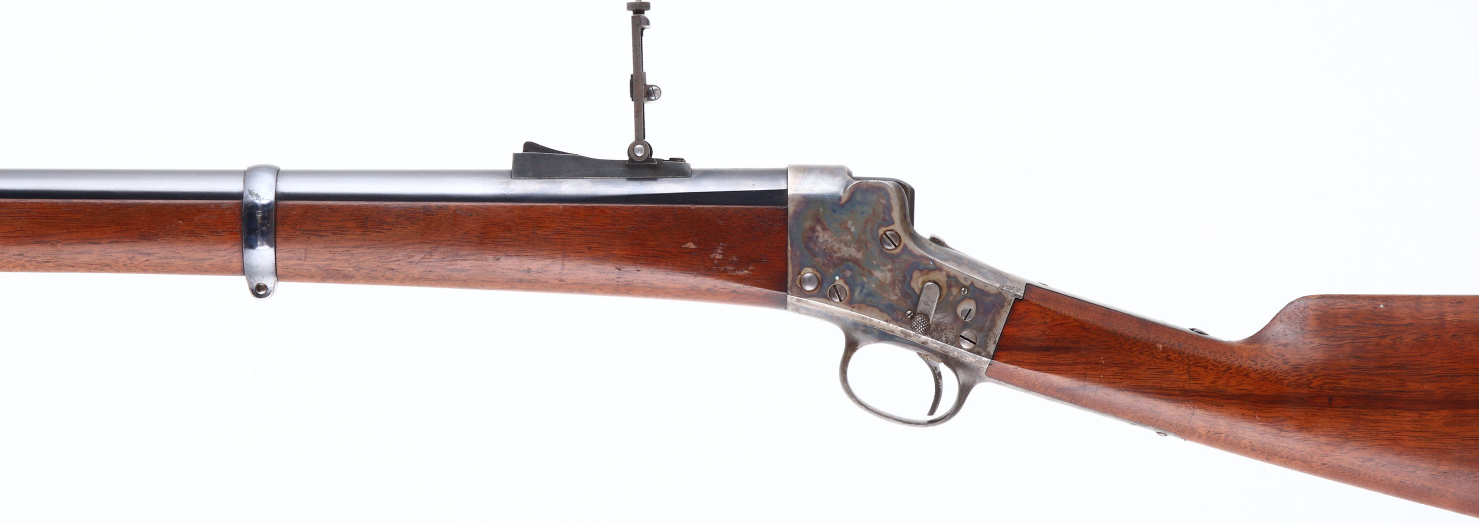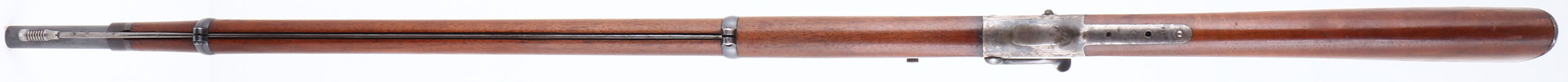 The standard full length straight grip walnut stocks are excellent, with nice grain & excellent finish. There are very few minor contusions & scrapes. The barrel carries the makers address ''E. Remington & Sons, Ilion N.Y.'' No caliber marking. The metal finish on the barrel is excellent, retaining approximately 90% coverage, with a couple of splotches where the finish has worn or rubbed. The case-hardened receiver & drop lever display fabulous & strong original case-colors. Bore is excellent & bright, with crisp rifling. Due to the electric firing system, the rifle no longer has a hammer spur. It also carries the addition of a safety lever on the left side of frame. The barrel carries a military style level spirit ladder rear sight & a box small blade front sight. The barrel has an additional original threaded rear sight hole. The upper tang is factory tapped, with two sight hole provisions for potential mounting of a tang sight. The lower lang has two open holes. There is the original cleaning rod secured within the forend & under the barrel with two forend barrel bands which aid in securing it to the rifle. Buttstock carries a widows peak metal buttplate. We have included below pictures & a diagram of the modifications done to the rifle & to explain how it works. There is also a YouTube video made by the consignor which talks about Captain Selden Allen Day, his rifles & goes into greater detail the modification & functionality of this Electric Rifle. It is titled ''Creedmore Rifles owned by Col. S.A.Day, 1879 & 1897'' *& this is the link: https://www.youtube.com/watch?v=7pytmB0dTi8. We highly recommend watching the video. This is a very unique piece of custom engineering, on an extremely nice condition Remington-Hepburn rifle. Antique, No FFL Req
