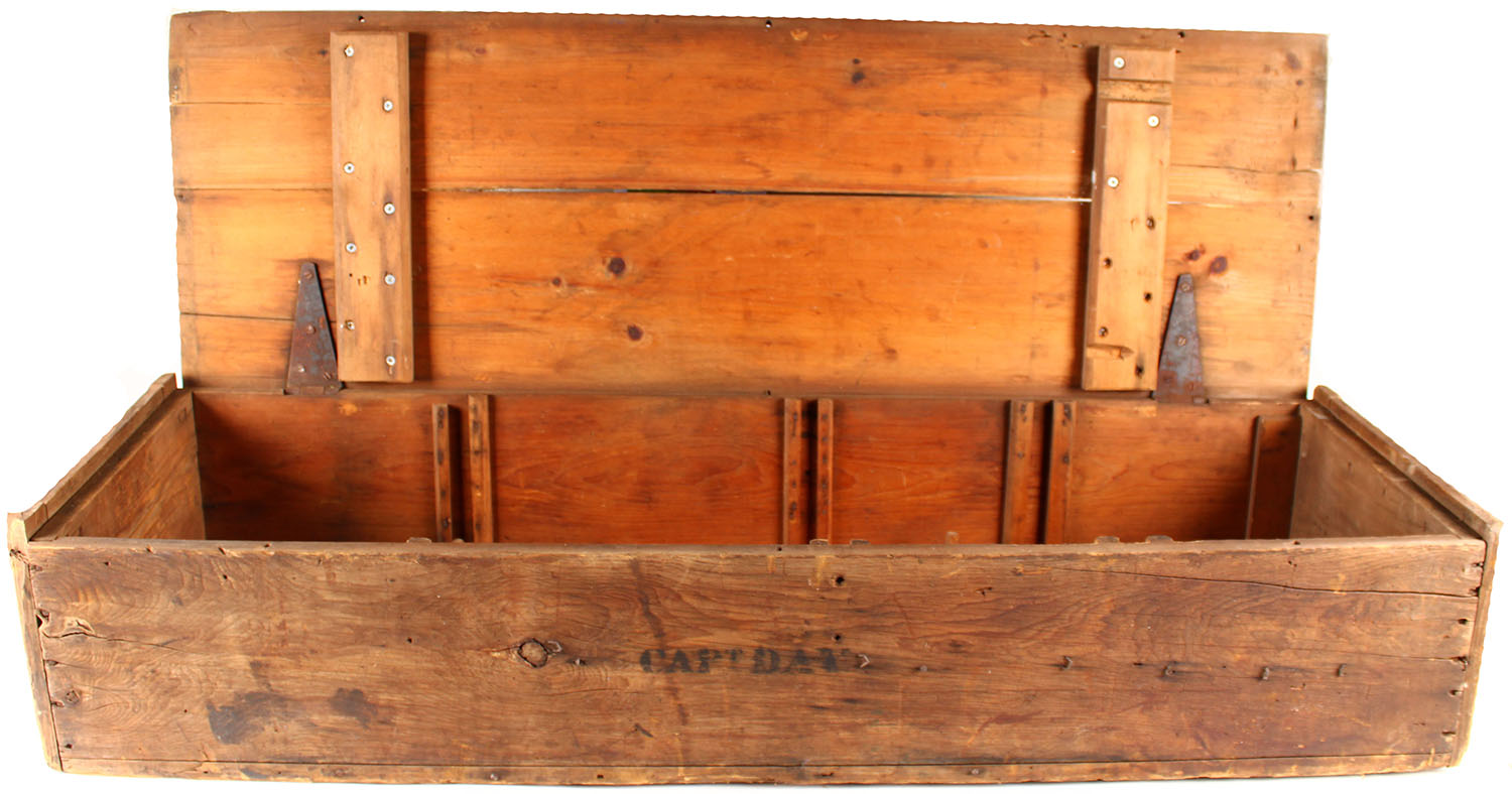 Being sold with the Electric Rifle in this lot is the wood crate that S.A. Day used to store, carry & travel with his target rifles & accessories to the various competitions & particularly The Creedmoor. The crate is 55 1/2'' X 17 1/2'' X 11''. It is set up with dowels & slat dividers on the bottom of the crate which held his various rifles. On the front of the crate is stenciled ''CAPTAIN DAY''. This is the crate which held the five rifles in this auction, which S.A. Day pack the last time.
