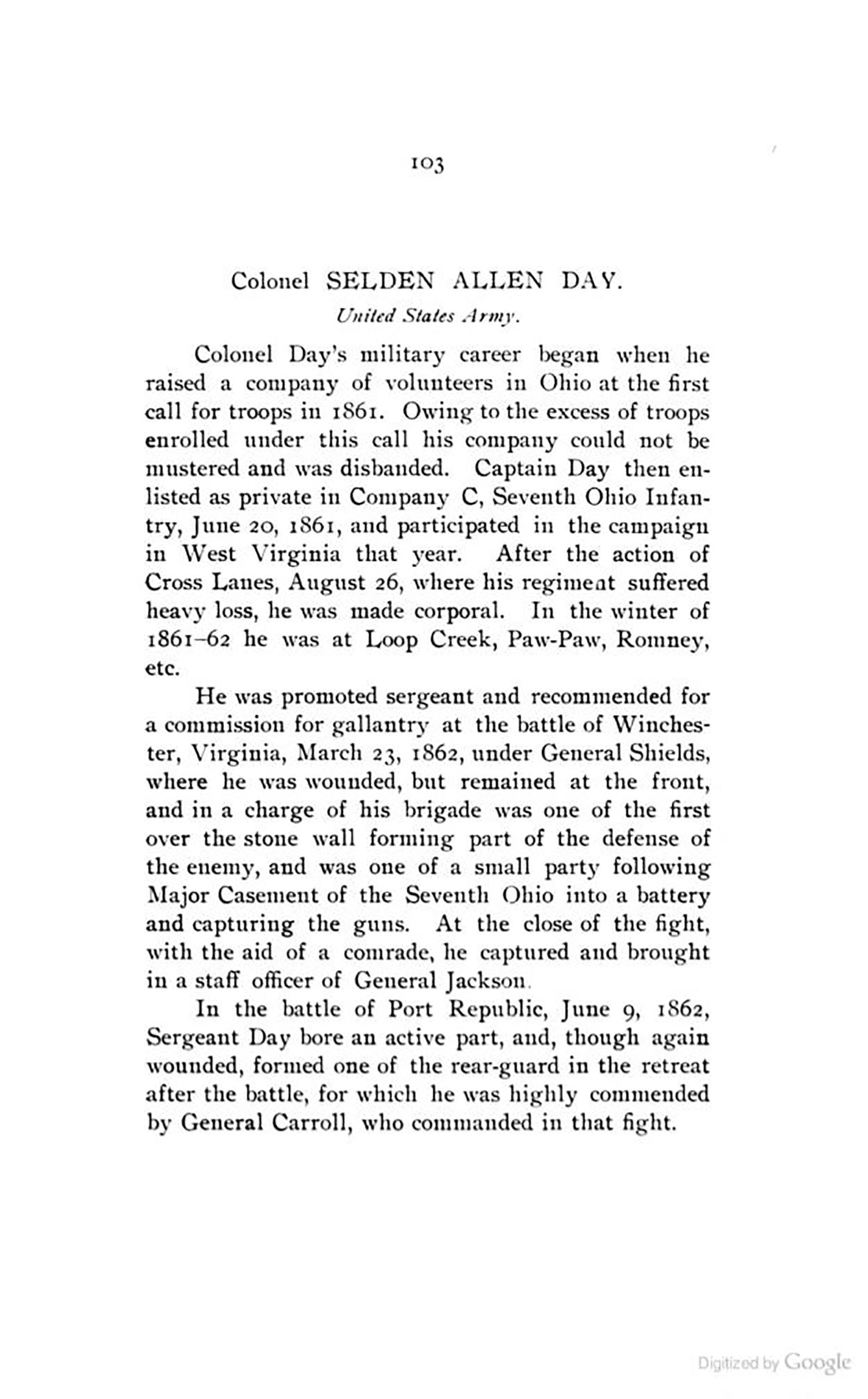 Captain Selden Allen Day was born in Ohio, July 22nd, 1838. Not much is known about his childhood, there than he was extremely bright, inquisitive & was able to fix or repair most things. In his early 20's his military career began on June 20th 1961 when he enlisted in the Civil War as a Private in Company ''C'', 7th Ohio Infantry. His military career last until his retirement in 1902. In the pictures below we have included a military bio & some highlights of that exemplary career for you to read in more detail. There is also much more to read about this special man as found on the internet.