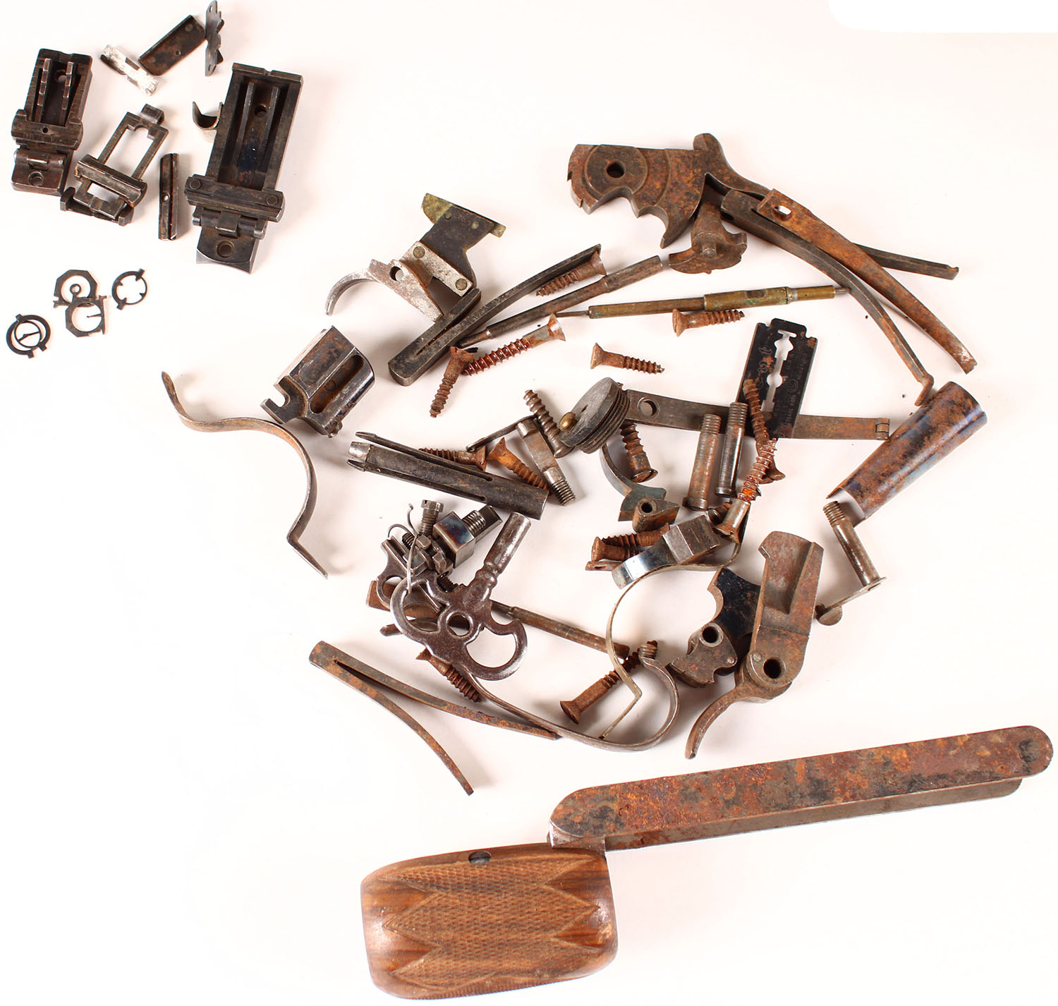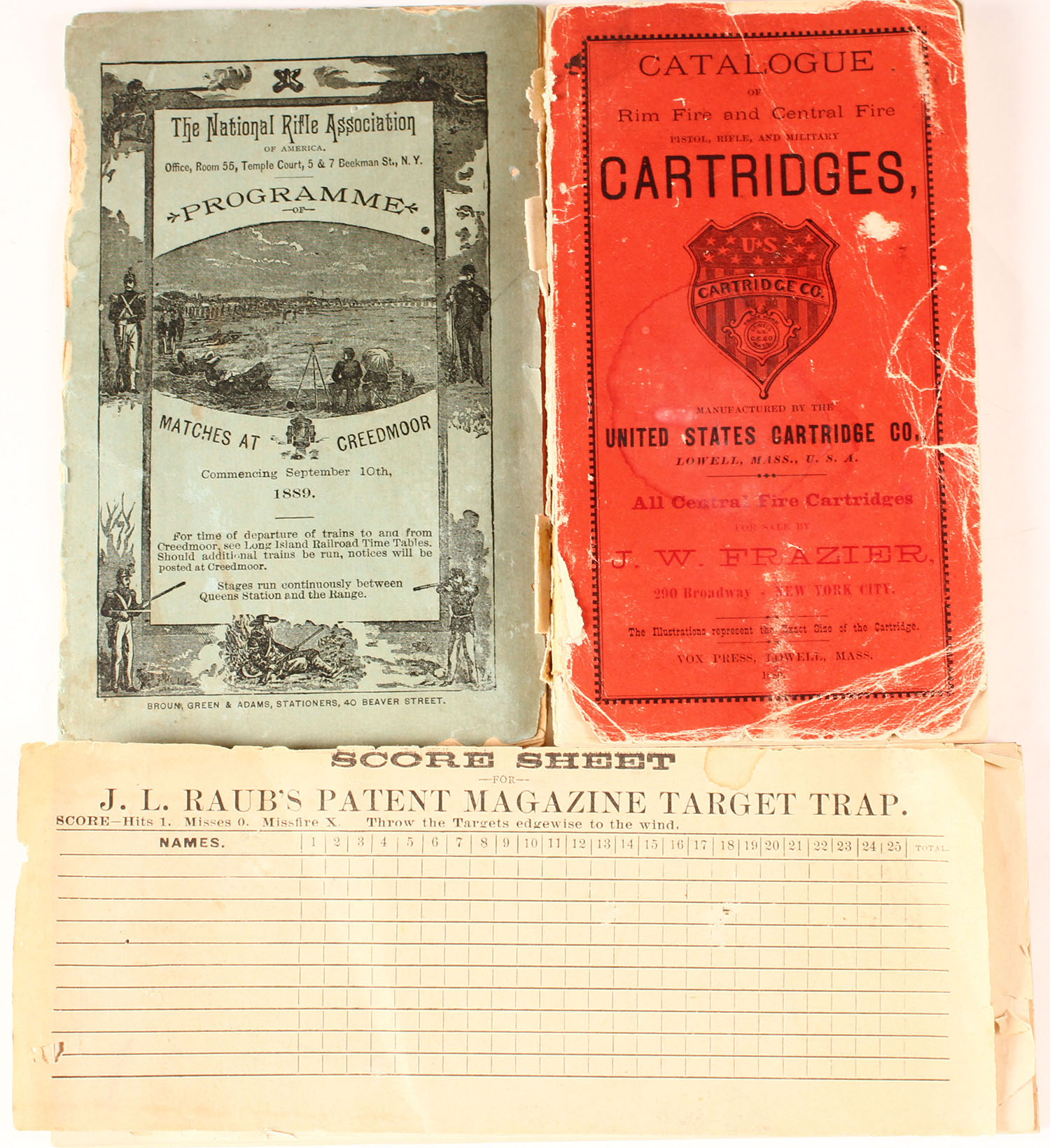 Within the crate was also a large assortment of his records books & various part & accessories. Included are 7 ''SOLDIERS TARGET RECORDS'' books, with the hand written notation of his various shots, placements & sores. There are also two Kneelands Score Books, one with scores from 1878 & the other one signed & dated by Capt. S.A. Day at Fort Hamilton New York Harbor 1884. There is also an official Creedmoor leather bound score book from 1879, with lots of advertising of Target firearms, local hotels & of course records of shot & scores. Coincidentally, The featured rifle advertised was for the Remington, No. 1 LONG RANGE ''CREEDMOOR'' TARGET RIFLE & the expert Creedmoor shooter who used them, which is the third rifle being offered in this collection. There is an additional black leather bound scores book & a tab of score sheets. There is also a '' Programmed'' from the 1889 matches at the Creedmoor. Also included is a 1880 U.S. Cartridge Co. CARTRIDGE catalog. These is a large bag of empty brass of various calibers, most of which match the rifles being offered. There is a pile of various rifle parts & sights. There is also a checkered forearm from a Spencer arms 1882 shotgun. There are several old wooden cigar boxes, in various states of completeness, which once held the accessories & parts.
