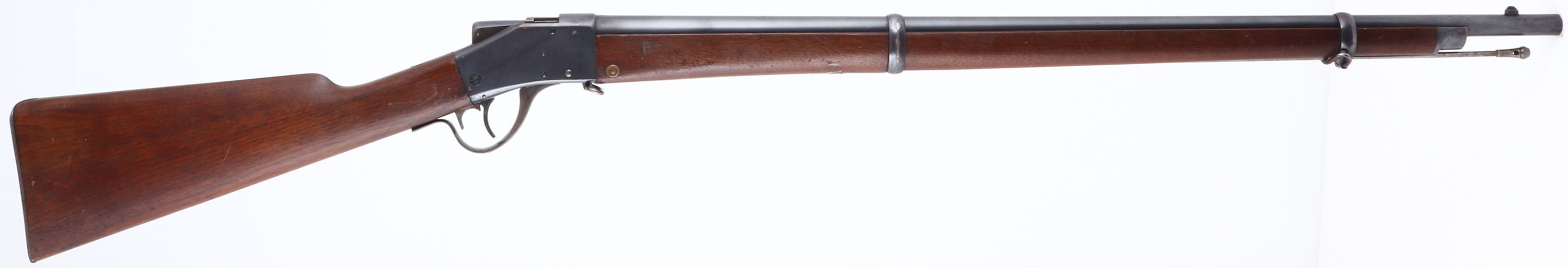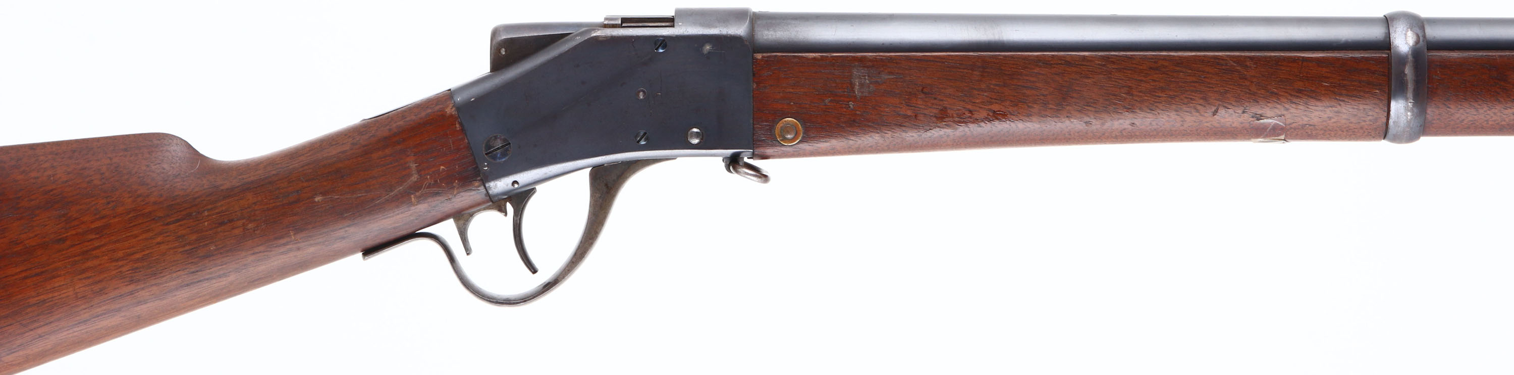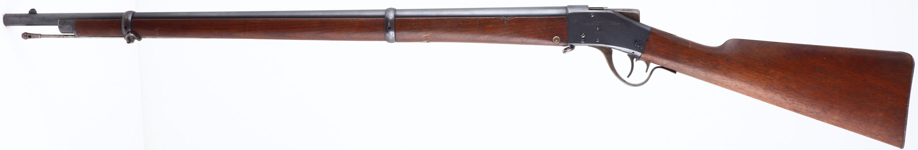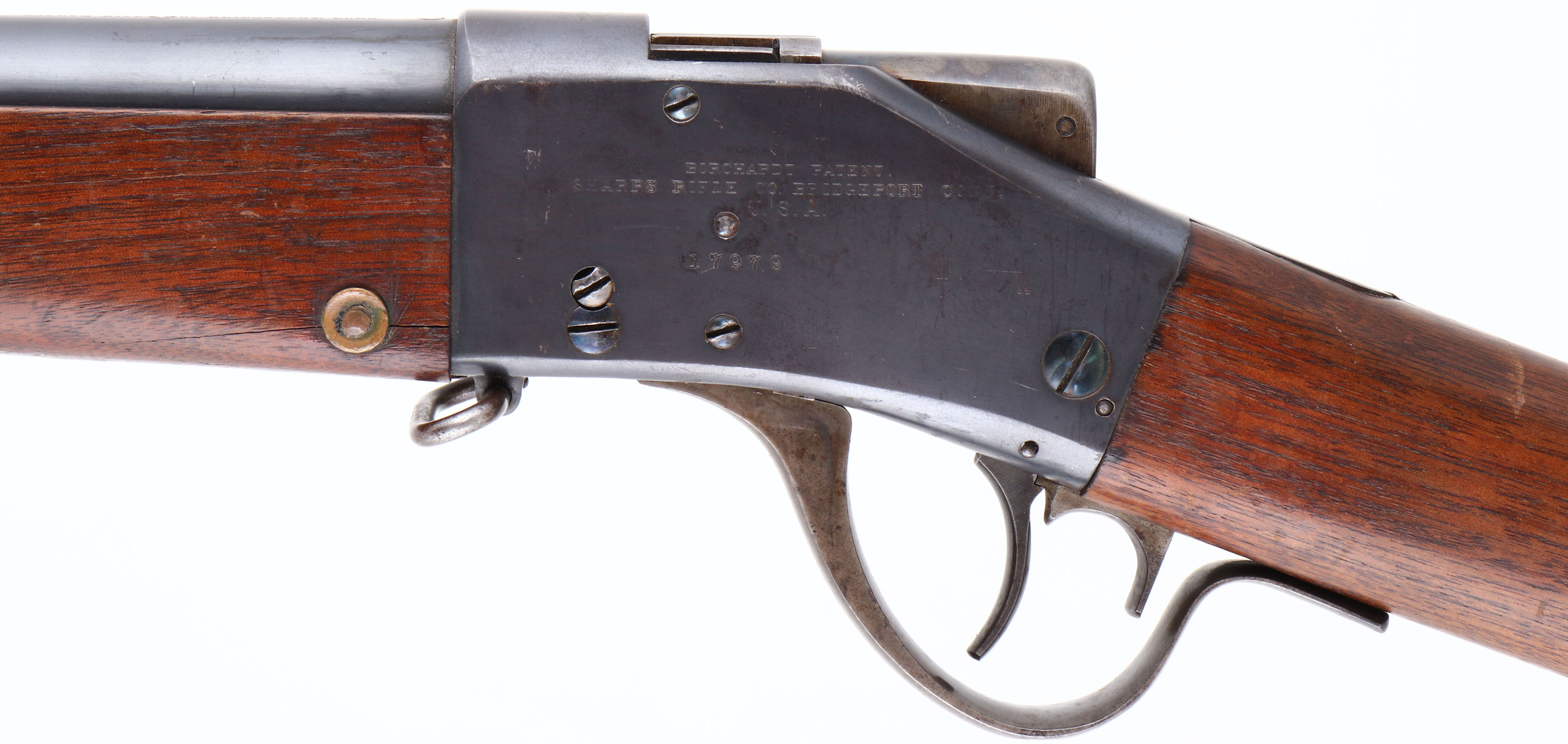 Sharps Borchardt, Model 1878 Old Reliable, CAL: 45/70, MFG: late 1880's, SN:17979, Lever Falling Block Rifle, 32'' Round barrel. This is the fifth & final rifle from the prestigious collection from Captain Selden Allen Day, The Sharps-Borchardt Model 1878 is a single-shot hammerless falling-block action rifle designed by Hugo Borchardt & made by the Sharps Rifle Manufacturing Company. It uses a hammerless striker rather than a hammer & firing pin like the old Sharps Rifle. It was the last of the Sharps single-shot rifles, and the Borchardt did not sell very well. According to company records 22,500 rifles were made in all models & just 10,000 in military from 1877 until the Sharps Rifle Co. closed down in 1881. Not withstanding its lack of commercial success the Sharps-Borchardt is admired for its strength and accuracy: reputed to be one of the strongest if not the strongest rifle action ever built before the latter 20th century. The gun was revolutionary at its time for its use of coil springs as opposed to flat springs. The Military Sharps-Borchardt was made only in .45-70 with 32'' round barrels & was purchased by the militias of the states of Michigan, North Carolina, & Massachusetts. This rifle appears to be one of those military rifles. The rifle carries the full military length walnut stock & forend, with two barrel bands. The stocks are excellent, with very few handling marks, scrapes or contusions to the original finish. There is an 8'' repaired stress crack at the receiver end of the forend which has been glued & a copper saddler's rivet has been added for extra stability. The original metal blue finish on the barrel & receiver rates 90%. The top of the barrel is marked ''Old Reliable'' in script and ''SHARPS RIFLE CO. BRIDGEPORT. CONN.'' behind the rear sight. The left side of the receiver is marked ''SHARPS RIFLE CO. BRIDGEPORT CONN.'' with the serial number 8086 stamped below. Bore is excellent & bright. The rifle carries the original front box sight, but has no rear sight. There are the two open holes in the barrel from the sight removal & two additional holes that were not factory in the barrel near the receiver. Original sling loops. Sliding trigger safety. Original cleaning rod stored in forend & under barrel. Checkered metal buttplate. These guns were popular among long-range shooters & Creedmore Match competitors & it makes sense that S.A. Day would have acquired one of these fine military rifles. Many of these rifles were rechambered for use as small bore varmint rifles. Therefore surviving examples are highly prized by collectors, especially unmodified examples chambered for heavy .45 & .50-caliber Sharps big-game cartridges. This rifle remains in fantastic original condition & is highly collectible, especially as one of the fine rifles owned by Captain Selden Allen Day. Antique, No FFL Req - Value: 2500 to 6500