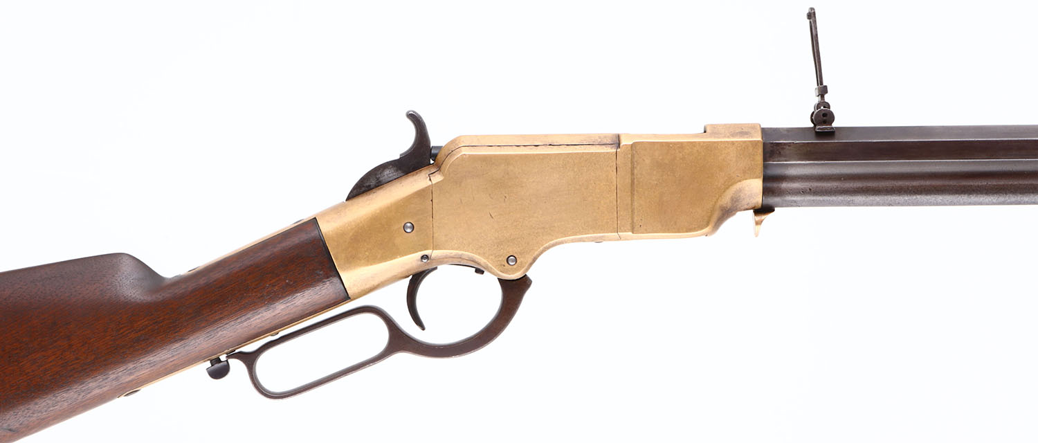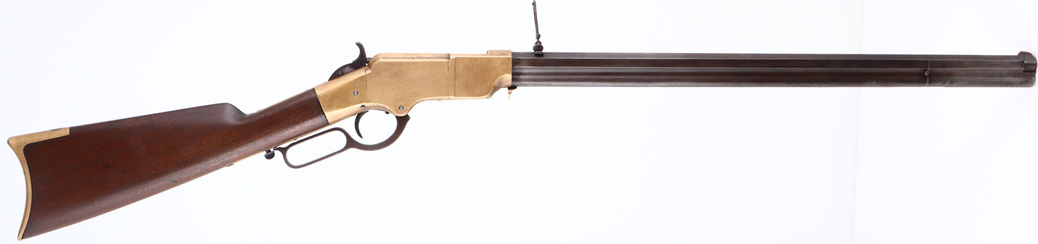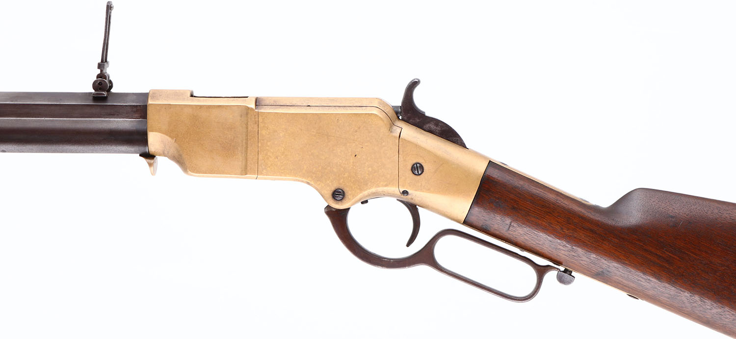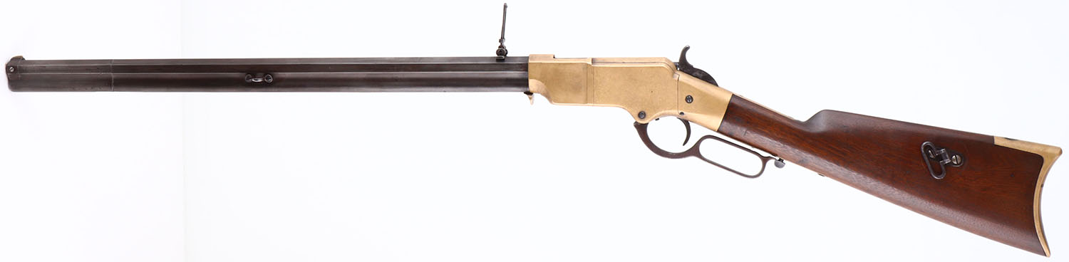 FANTASTIC Henry Repeating Rifle, First Variation, .44 Henry Cal., MFG: 1864, SN: 6550 Lever Action Rifle, Designed by Benjamin Tyler Henry & produced by the New Haven Arms Company. Henry's were used in the Indian Wars & by the Union during the Civil War. They were favored for their greater fire power than standard issue carbines, though at $30 to $40, they were a very expensive option in their day. This mid SN rifle still retains first variation rifle characteristics such as the pronounced ''Henry Drop'' profile on the rear of the receiver & the three flats on the receiver ring (receiver bridge) immediately behind the receiver & barrel joint. On this example, the original wood stock is very good to excellent & solid. The stock has been cleaned & lightly sanded & reoiled, displaying numerous small & minor dings, scratches & contusions consistent with period use. There are a couple of short & tight hairline cracks near the toe. The wood fit is very good with some shrinkage. The metal finish on the 24'' barrel has worn & toned to a thin brown patina, with a mix of added finish & with edge wear & areas of thinning worn to a gun metal gray. There are some small nicks, contusions or abrasions, & surface freckling, but no real pitting or rust. The barrel has a professionally filled 2nd rear dovetail approximately 6'' from the receiver ring. The brass frame & buttplate have both likely been cleaned in the past, but have developed nice aged color. Buttplate has a hinged trapdoor were an original 4pc hickory cleaning rod would be originally stored, although not currently present. Bore is fair, with areas of pitting amongst strong rifling. The rifle has a nickel silver front sight blade & third style folding leaf rear sight with 900 yard notch at the top of the leaf. Present are the typical sling attachments on the left side of the stock & barrel, & the faint remains of the ''Henry Bump'' can be seen below the sling provision on the stock. The top barrel flat is roll-stamped with the slightly larger style legend: ''HENRY'S PATENT. OCT. 16. 1860 / MANUFACT'D BY THE NEWHAVEN ARMS CO. NEWHAVEN. CT.'' in two lines forward of the rear sight. The serial number is stamped on the top of the barrel between the rear sight & the receiver. Matching SN's are stamped on the inside of the buttplate & on the left side of the lower tang beneath the wood. The hammer, lever & trigger are case-hardened, although the case-color has mostly worn away & developed a brown patina. There is the remains of a ''W'' proof stamping on the lower tang, which has been speculated was the inspection stamping of Oliver Winchester. The hammer has borderless knurling on the spur. All screws fit & line up correctly, are mostly unbuggered & appear original. While it is reported that as many as 14,000 Henry rifles were produced. Production of the Winchester 1866 rifle was SN intermixed starting around 12,000, so some speculate fewer that 14,000 were actually produced. With such a low production total & their heavy use during the Civil War, Indian wars & Western frontier movement, any Henry rifles is always highly collectable, but especially when found with all SN matching parts & in relatively unmolested condition such as this rifle presents. Antique, No FFL Req. - Value: 20000 to 35000