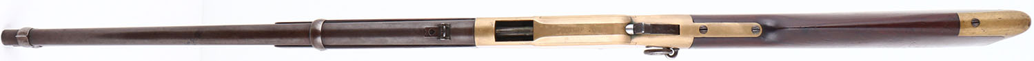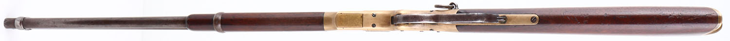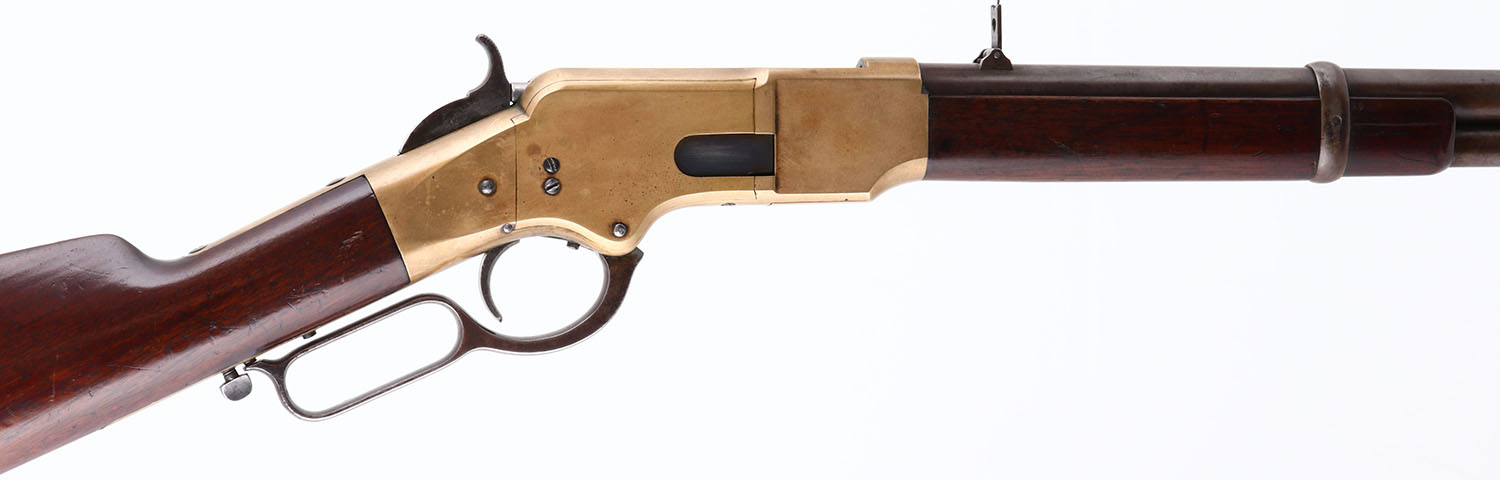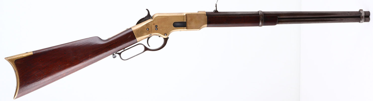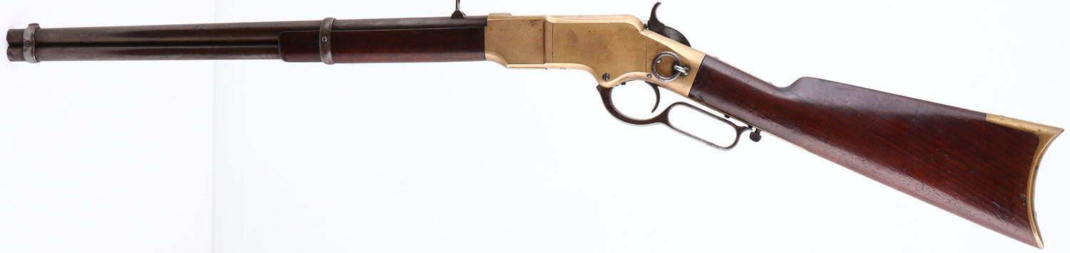 FANTASTIC Winchester, Model 1866 Saddle Ring Carbine, Early First Variation, .44 Henry Cal., MFG: 1866, SN: 14412, Lever Action Carbine, This is a FIRST YEAR carbine. Its generally accepted that serialization for the Model 1866 started at 12,000, with earlier SN's allocated to the Henry rifle. If that is correct, this is the 2,412th the 1866 produced. Like all early first variations, the SN is stamped on the inner left side of the lower tang, displays the flat sides, ''Henry Drop'' contoured receiver, the two upper tang screws, early screw layout on receiver, flat loading gate, & early short length forend. It also carries the early 20'' Round ''HENRY'' stamped barrel, Full mag. The original wood stocks are excellent & solid, retaining the majority of the original finish. The stock has a tight 2'' hairline crack emanating from the upper tang & a small missing chip at the corner of the lower left tang. The stock carry minor handling marks, scrapes & small contusions. Barrel, mag, lever & hammer have toned to a thin brown patina, with a couple of spots of rust pitting. The brass receiver has a nicely aged patina. The early variation flat loading gate displays excellent factory blue. Bore is very good, with spotty areas of roughness amongst strong riffling. The barrel carries the original flip-up rear sight, with marking at 100, 300 & 500 YDS & standard pinch blade barrel band front sight. Stock carries a smooth trapdoor crescent brass buttplate. A staple mounted saddle ring is located on the left side of the receiver. Tight smooth action & all appears mechanically sound. This is a very rare, all original, high condition & very collectible First Year 1866 SRC.* Antique, No FFL Req. - Value: 20000 to 30000