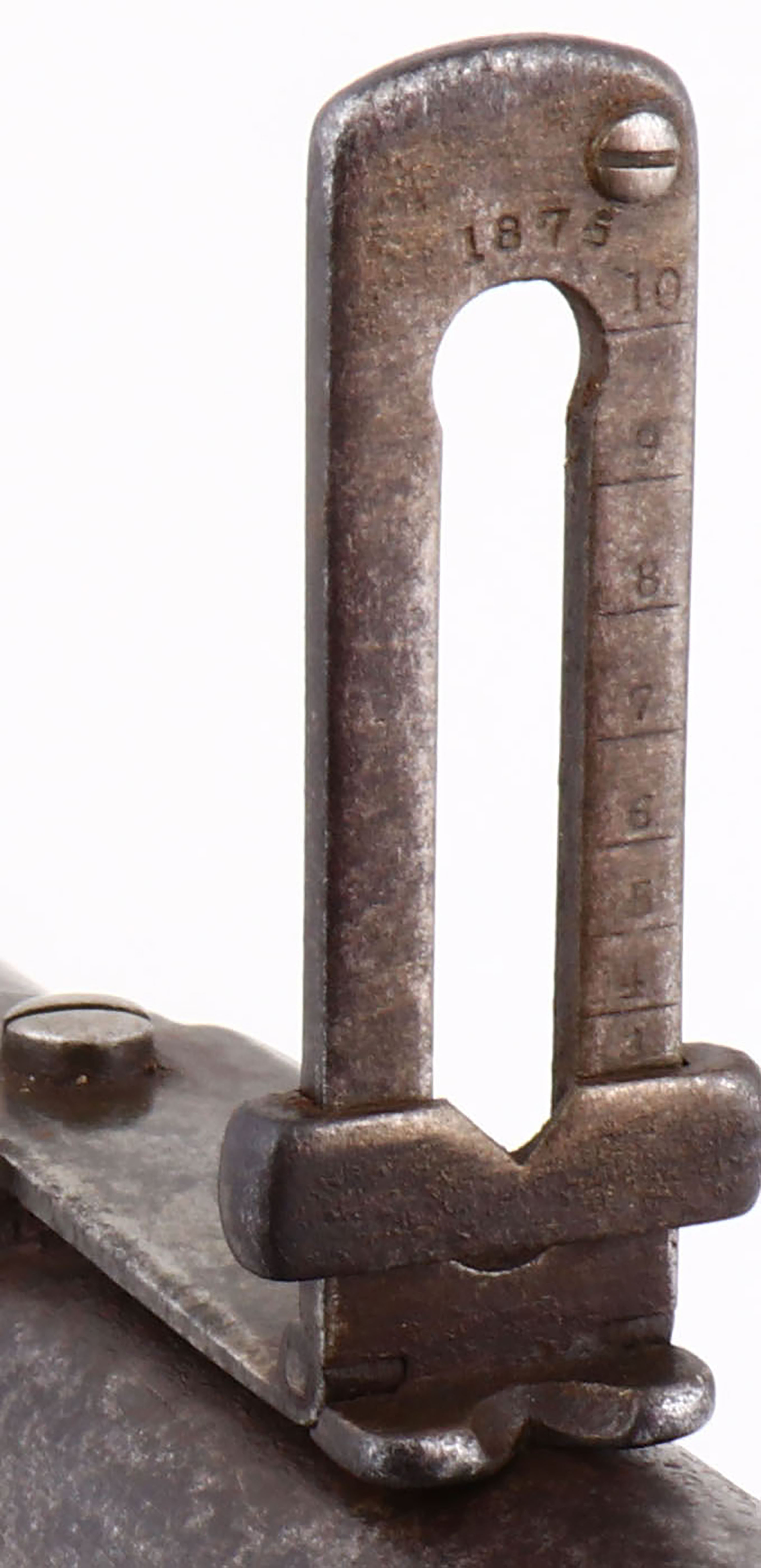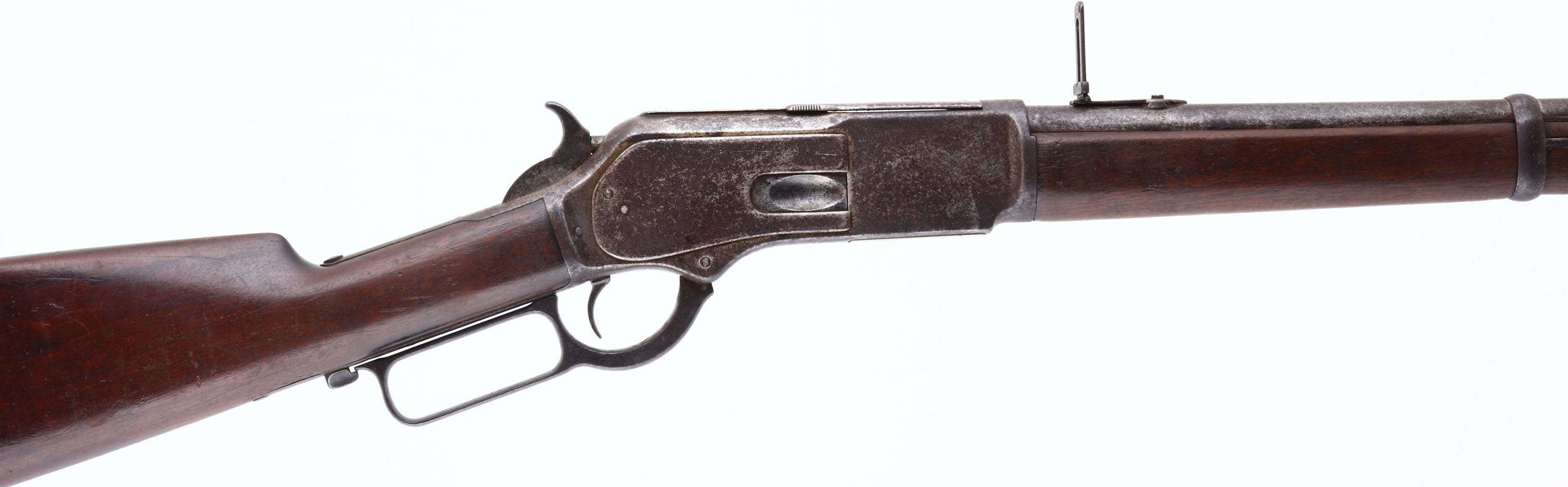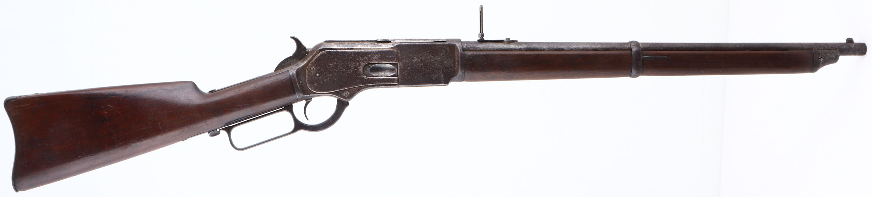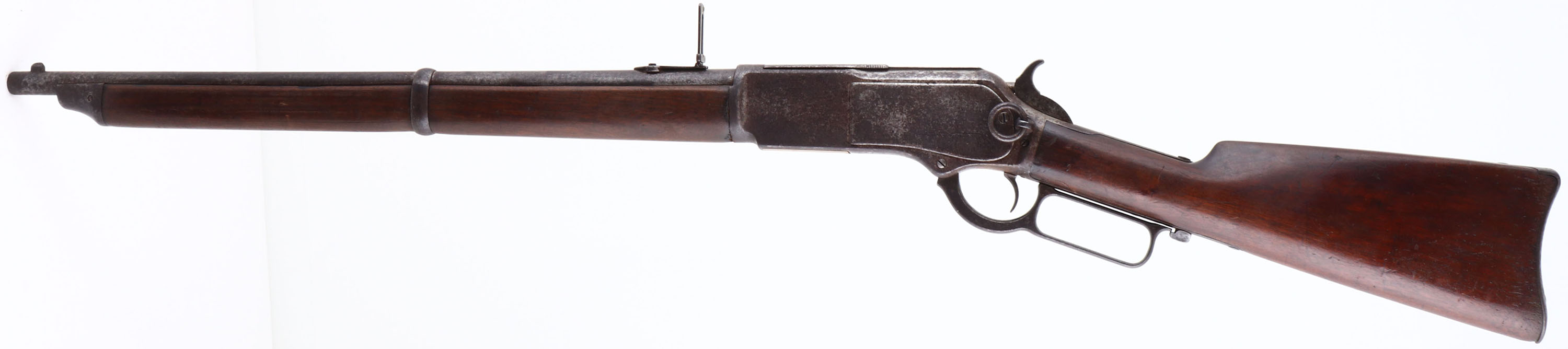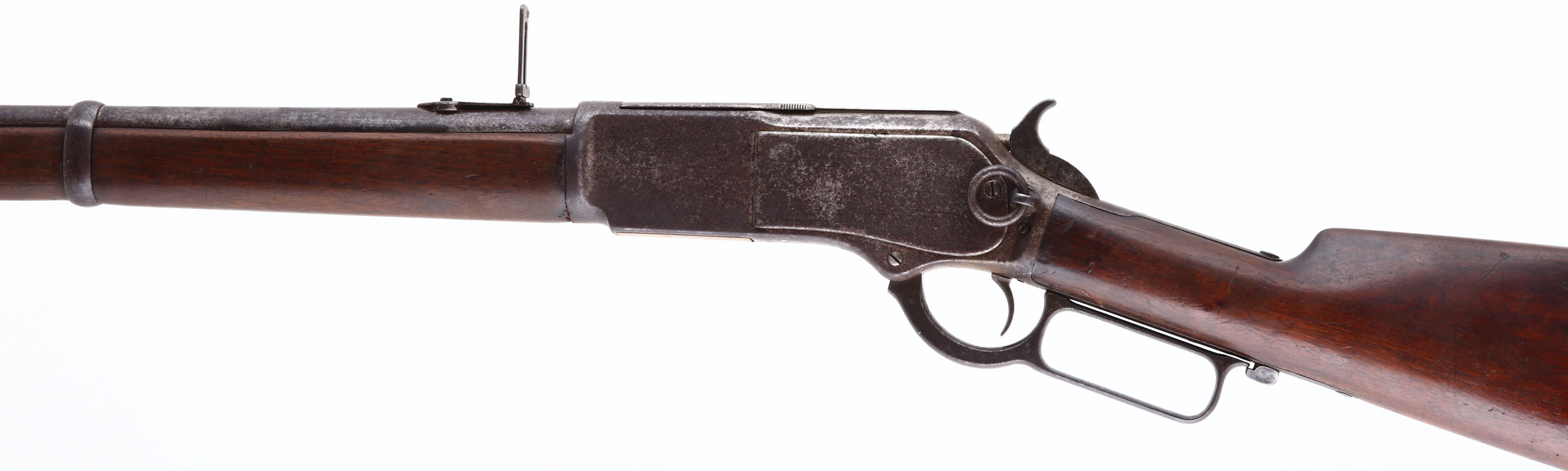 RARE Winchester, Model 1876 ''Centennial Rifle'', Saddle Ring Carbine, 3rd Variation, CAL: 45-75, MFG: 1884, SN: 43428, Lever Action Carbine, 22'' Round barrel, Full mag. The Model 1876 was originally referred to as the Centennial Rifle due to its introduction in the same year as America's Centennial anniversary. Nearly the entire production of the big Model 1876 Winchester was devoted to rifle manufacture. There was a considerable contract for carbines from the Canadian Northwest Mounted Police, but aside from these historic arms, Winchester made carbines for the civilian market on a very limited basis. Total production of all Model 1876's from 1876 to its discontinuance in 1888 (with about 300 additional arms made intermittently to 1898) was a mere 63,871. In comparison, Winchester produced 323,926 of the smaller Model 1873's from 1873-1889. By the end of production of the Model 1873, 720,609 had been produced, More than 10 fold that of the 1876. For this obvious reason, all Model 1876 Winchesters are scarce. The 1876 Saddle Ring Carbines are seldom encountered today as so few were made. Northwest Mounted Police carbines (Mountie Carbines) were a special variant used by the Canadian Northwest Mounted Police. They had a 22'' (56 centimeters) round barrel, were chambered in .45-75 Winchester, with a full length forend & a military style folding ladder rear sight calibrated in meters. This carbine is configured the same, but carries the standard ''1876'' marked folding ladder rear sight, with slide marking from 2 to 10. This carbine was built for the civilian market & is much rarer. The original straight grip wood stocks are excellent, displaying the original finish. They display several minor contusions, scrapes & scratches, with a few little edge nicks to the back edge of the forend. The metal blue finish has entirely tone to a mix of speckled brown patina, gray darkened finish & areas worn to gun metal gray. Bore is very good, displaying light spotting & pitting amongst strong rifling. In addition to the flip-up rear ladder sight, the barrel carries a box small blade carbine front sight. Buttstock carries a carbine metal buttplate. Orignal saddle ring. A rare & all original 1876 SRC collectible. Antique, No FFL Req. - Value: 7000 to 12000