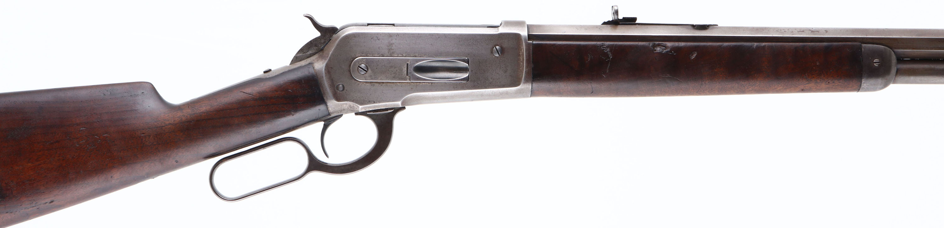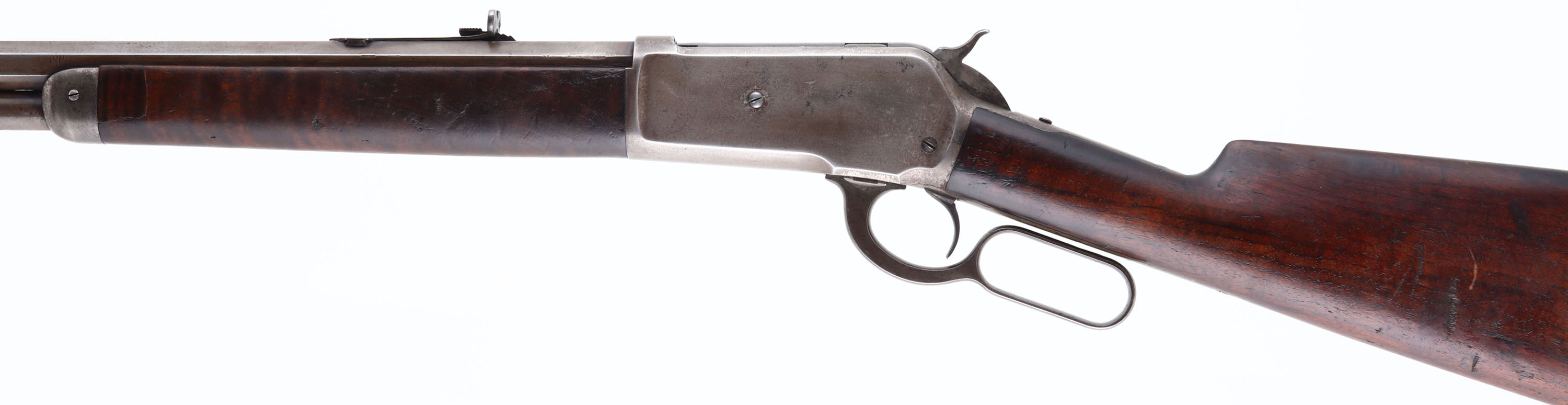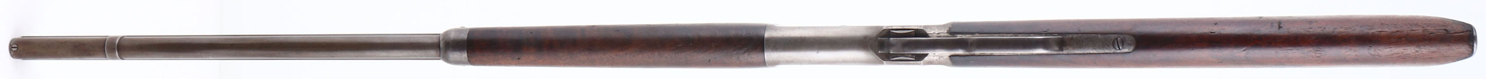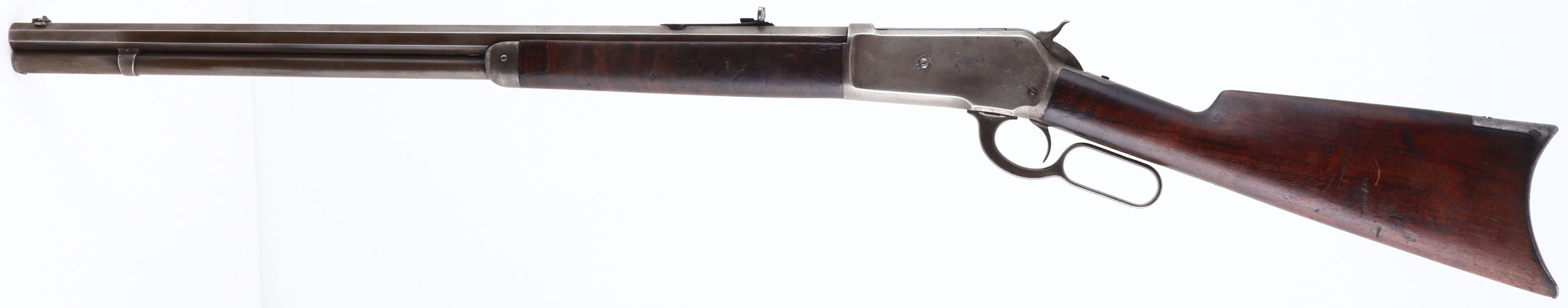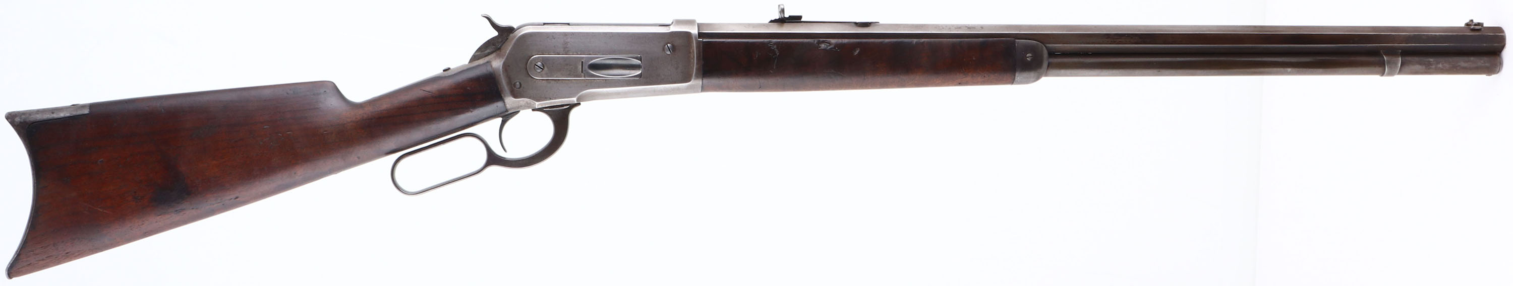 Winchester, Model 1886, CAL: 38-56 WCF, MFG: 1893, SN: 81120, Lever Action Rifle, 26'' Octagon barrel, Full mag. The original straight grip wood stocks are good & solid, with the original thinning finish. The stocks display several contusions & handling marks, with two larger line contusions on the left side of the stock & few small gouges on the right side of the forend. There is a 2 1/2'' hairline grain crack at the forward end of the underside of the forend. There is also a 1'' square chip repair on the left front tip of the forend. The metal blue finish on the barrel has worn mostly gun metal gray, with a thin layer of brown patina & some remaining blue in protective areas. The receiver has toned or worn gun metal gray. Bore is good, with spotting & roughness amongst strong rifling. The barrel holds an adjustable rear sight & flip globe front sight with an ivory bead. Buttstock carries a crescent metal buttplate. Smooth tight action. A nice & original 1886 rifle. Antique, No FFL Req. - Value: 2000 to 4000