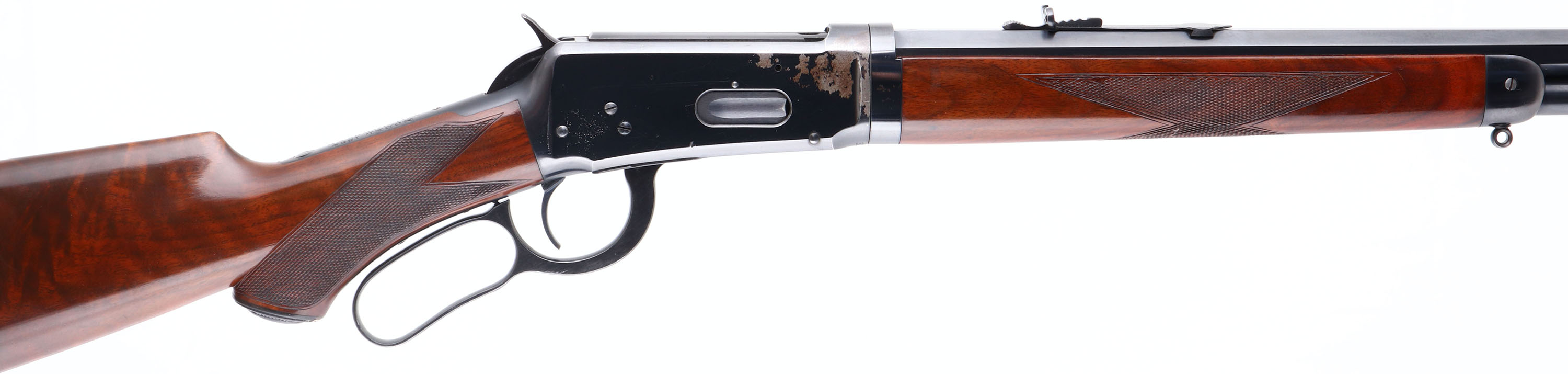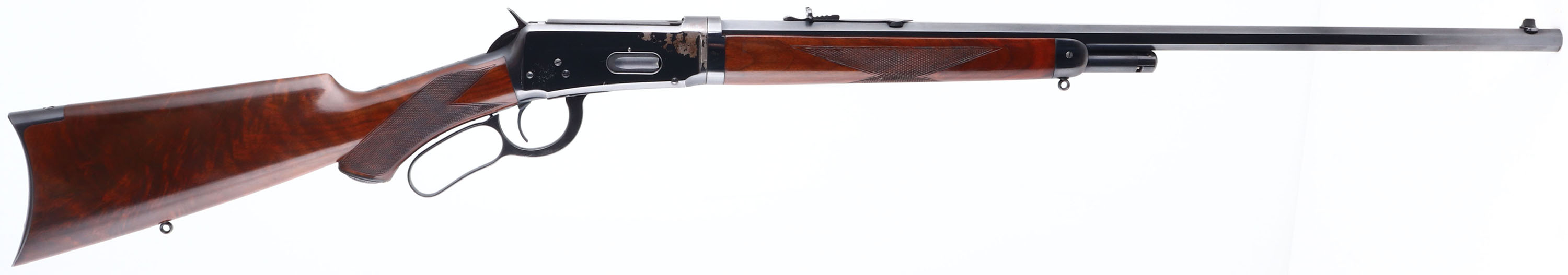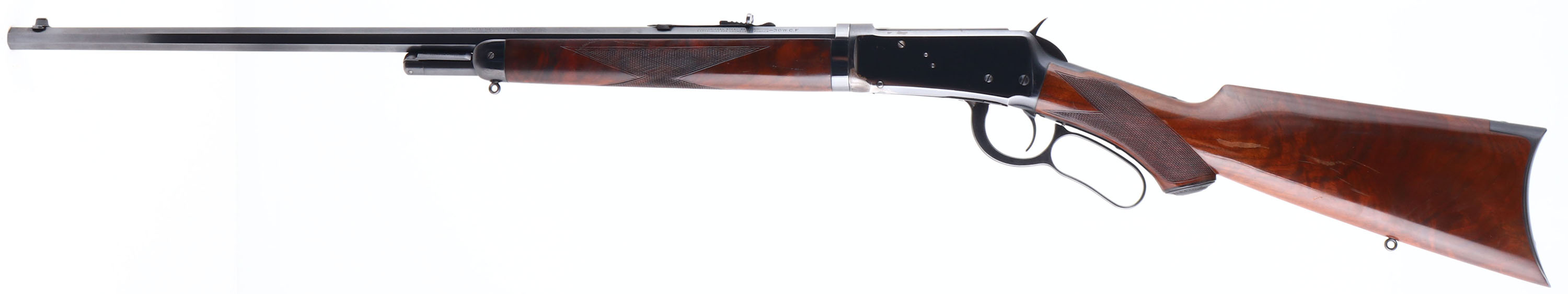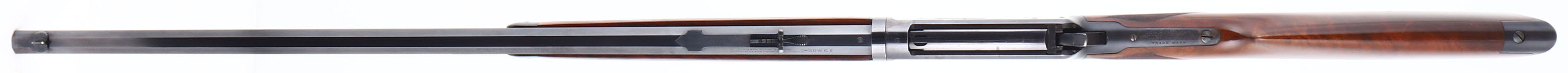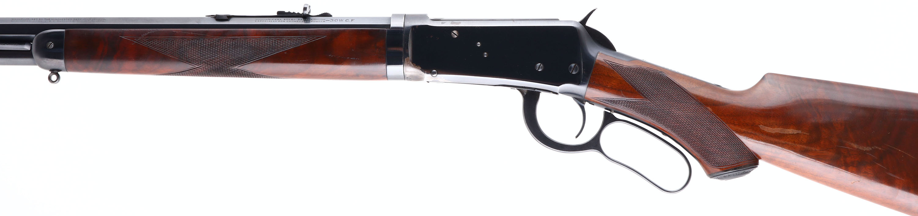 FANTASTIC DELUXE Winchester, Model 1894 TAKE-DOWN, CAL: 30 WCF, MFG: 1911, SN: 524767, Lever Action Rifle, 26'' Octagon Barrel. 2/3rds Mag. The factory deluxe checkered & capped pistol grip wood stocks are excellent, with wonderful feathered grain. They carry excellent original finish, with a few tiny handling marks & two smaller finish level surface scrapes on the left side of the stock. The original metal blue finish on the barrel & mag rates 99%, 90% on the receiver, with loss due to spots of flaking on the right upper side & on the belly. The blue is excellent on the buttplate, forend cap, lever & hammer. Bore is excellent, with defined rifling. The barrel holds the original adjustable rear sight & Lyman ivory bead front sight. Buttstock carries a crescent metal buttplate. Factory sling eyes. This is a very sharp looking deluxe rifle, in all original condition & highly collectible.* FFL or C&R Req. - Value: 8000 to 12000
