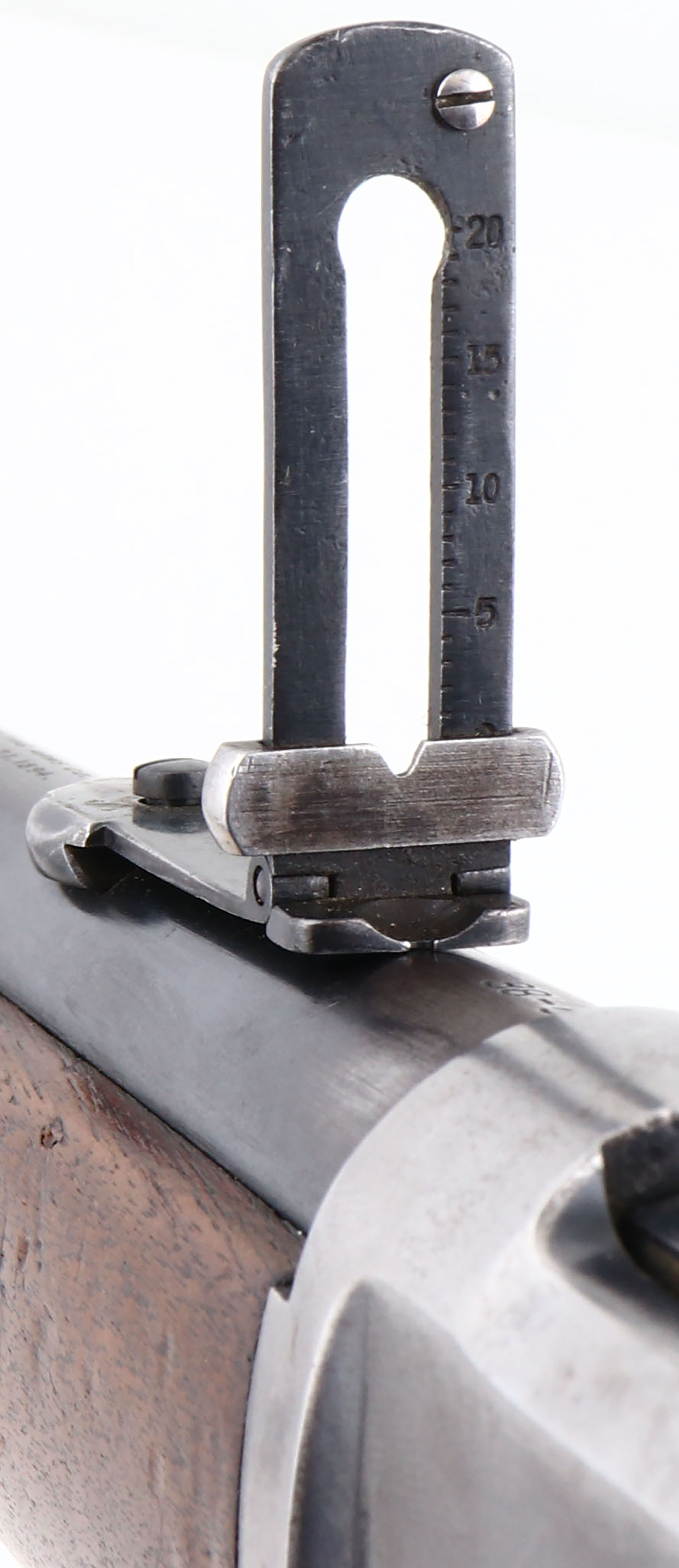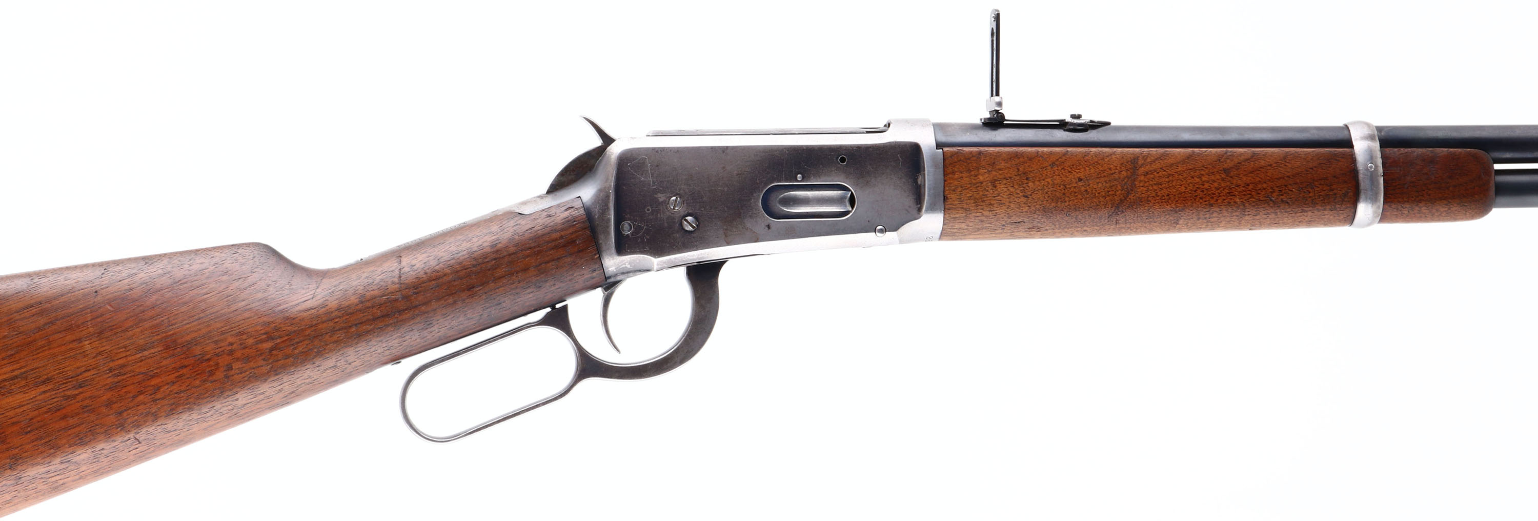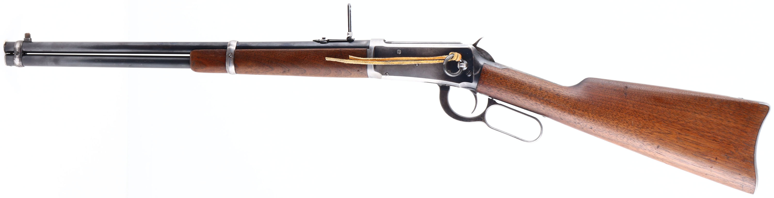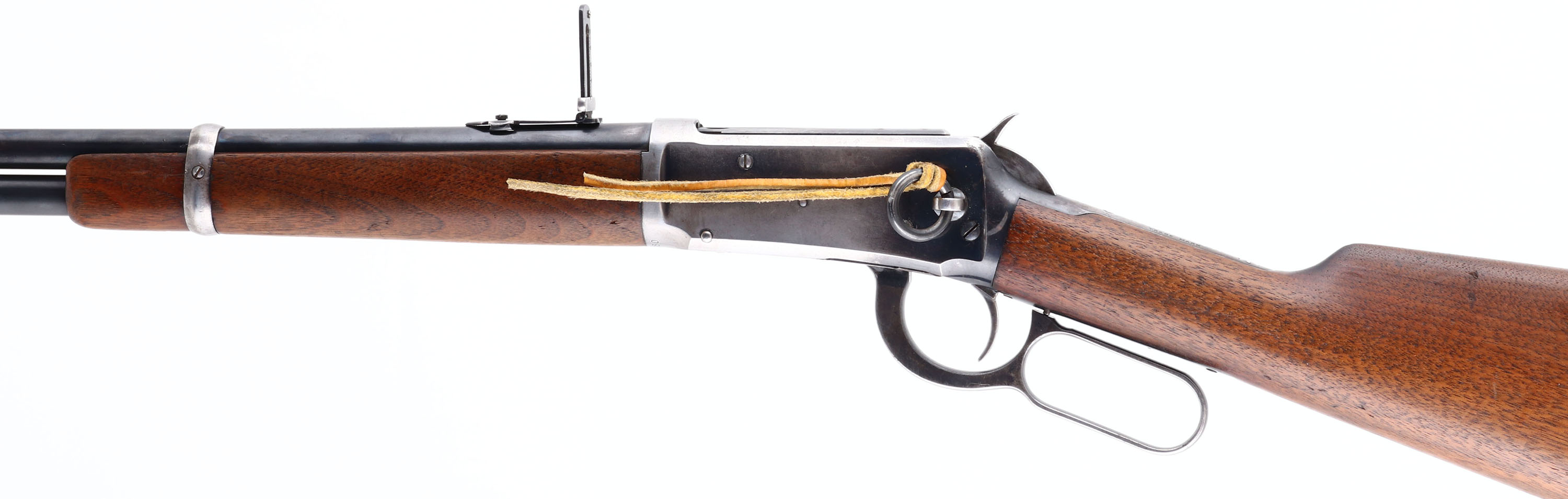 Winchester, Model 1894 SRC, CAL: 38-55, MFG: 1902, SN: 259280, Lever Action Rifle, 20'' Round barrel. Full mag. The straight grip wood stock & forend are excellent, with minor surface scrapes & small contusions to the original finish. The metal blue finish on the barrel & tube rates 85%. The receiver has mostly worn or faded to a gun metal grey, with about 20% of original blue remaining in more protected areas. Bore is excellent. The barrel holds a flip-up rear ladder sight & carbine block blade front sight. Buttstock carries a smooth carbine metal buttplate. Original saddle ring, with leather lash. Smooth tight action. A very nice original SRC in the most desired caliber. FFL or C&R Req. - Value: 1500 to 3000