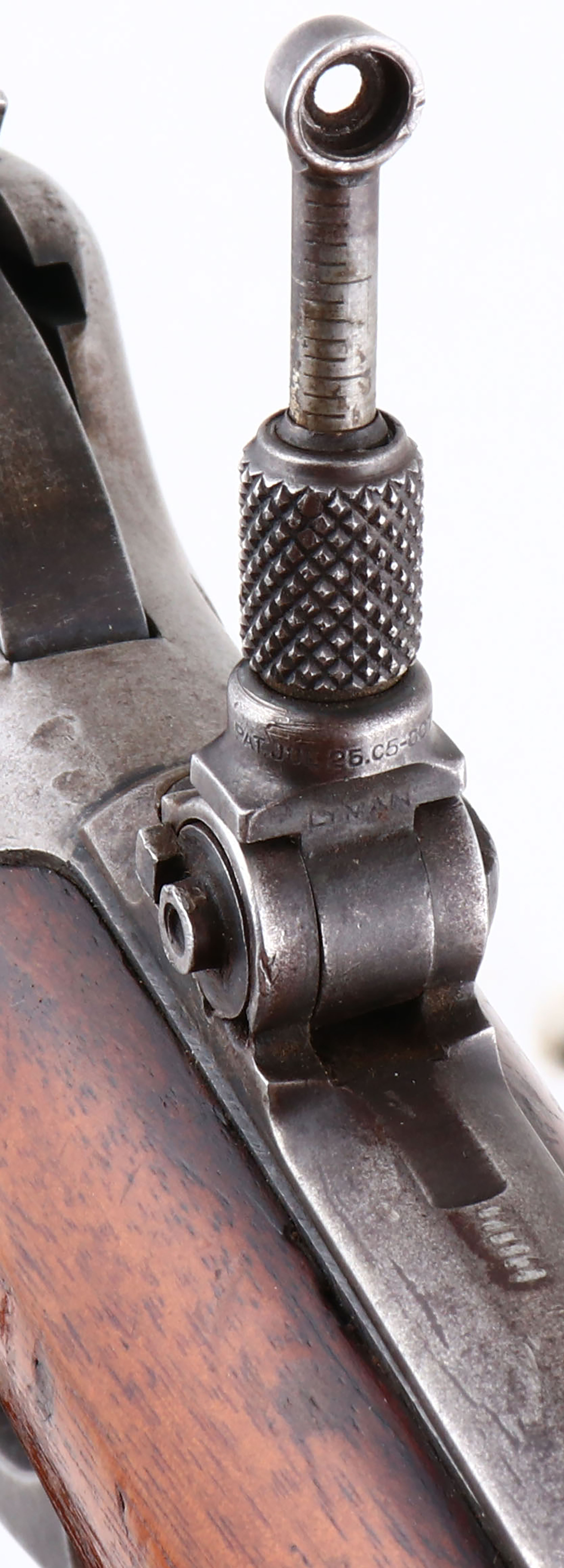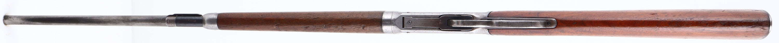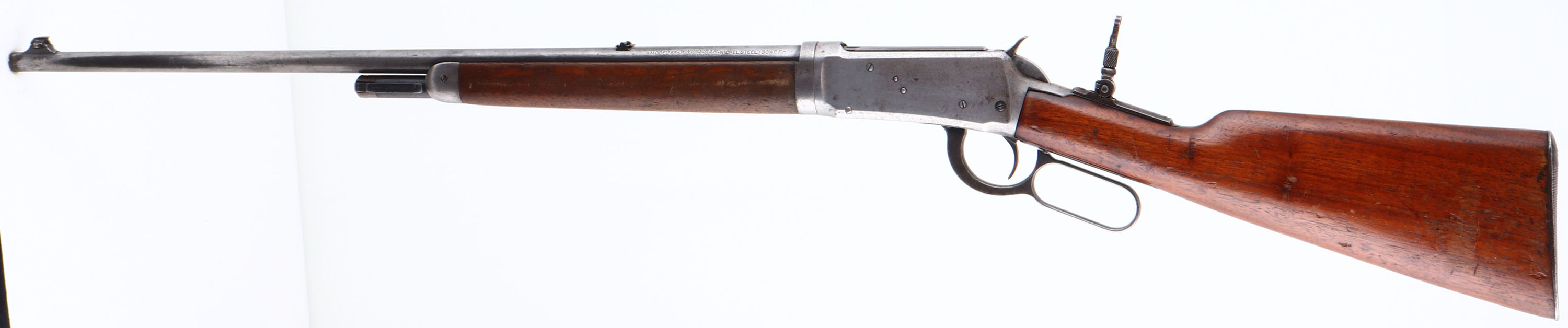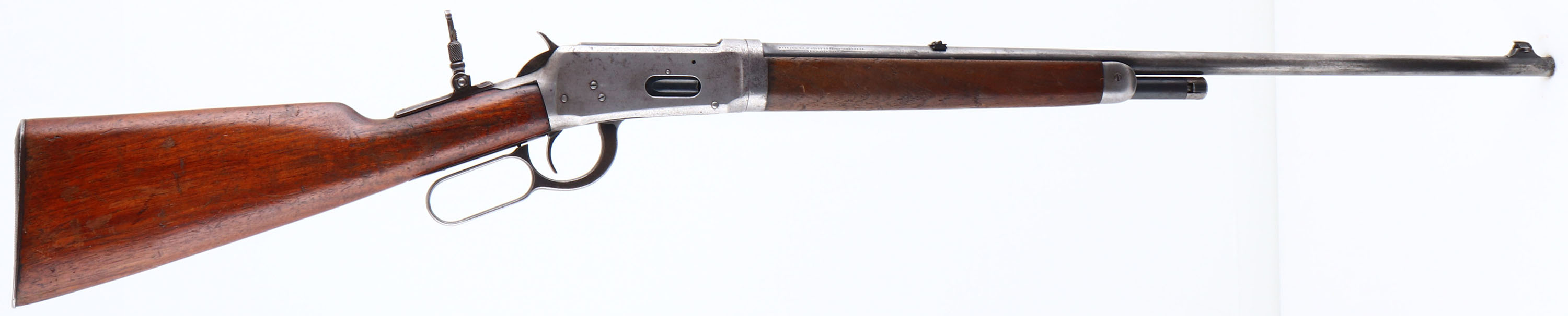 Winchester, Model 55 TAKE-DOWN, marked 30 WCF, MFG: 1925, SN: 2746, Lever Action Take-down Rifle, 24 1/4'' Tapered round barrel, 1/2 mag., The original walnut stocks are very good & solid, with most of the original finish worn from the forend & wearing thin or flaking on the stock. There are scuffs, scrapes & contusions, along with one small chip at the right corner of the wrist & receiver along the top tang. The metal blue finish has worn mostly gun metal gray, with some remains of original blue in protected areas. Bore is excellent. Rifle fitted with a tang sight which has lost its spring, a folding leaf rear sight with a broken leaf & longer blade front sight. Stock carries a metal buttplate. This 2nd year of production model 55 rifle is one only 20,500 model 55 rifles manufactured. FFL or C&R Req. - Value: 800 to 1800