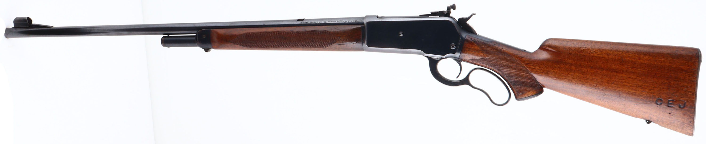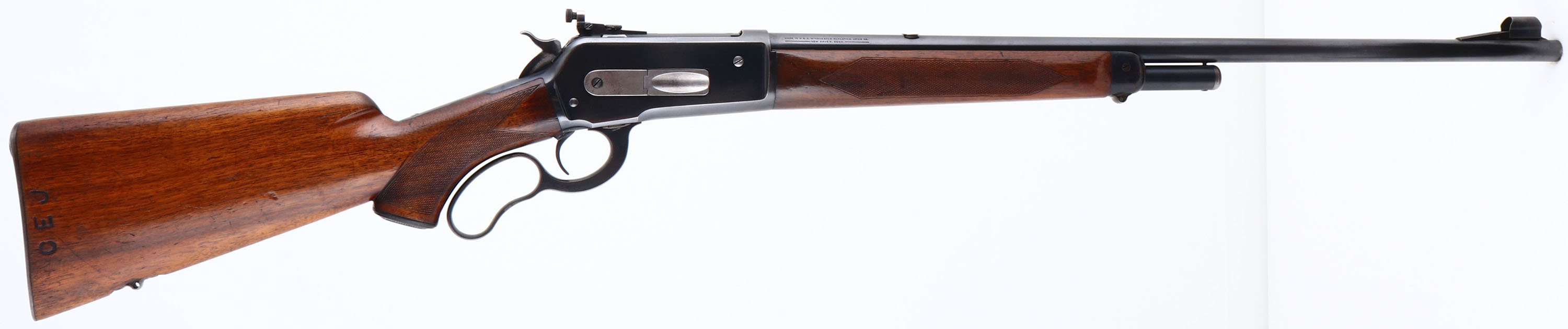 Winchester, Model 71 Deluxe Long Tang, marked 348 W.C.F., MFG. 1936, SN: 2200 (2nd Year Production), Lever Action Rifle, 24'' Round barrel, 2/3 tube mag holds 4 cartridges. Improved model 1886, with just 47,254 made & far fewer as deluxe models which are in high demand amongst collectors & command premium values. The checkered & capped pistol grip wood stocks are near excellent, solid & original. They are stamped with ''CEJ'' on both sides of the stock near the buttplate. It is well done & may be an organizational stamping, but the origin is unknown. The stocks do show thinning wear of the original finish at the carry points & around toe & buttplate. Stocks also have several minor scratches & contusions. Metal finish is 90% coverage of original blue on barrel & mag., 80% on receiver with loss on the belly due to carry wear. Lever & cap show flaking, retaining 50% on lever, 70% on forend cap. The rifle carries the rare 100 & 200 yard adjustable breech bolt peep sight, with a blank filled rear dovetail & hooded ramp front sight. Factory checkered metal buttplate. Excellent bore. Factory sling mounts. Nice looking & original early long tang Deluxe 71 rifle.* FFL or C&R Req. - Value: 2500 to 3500