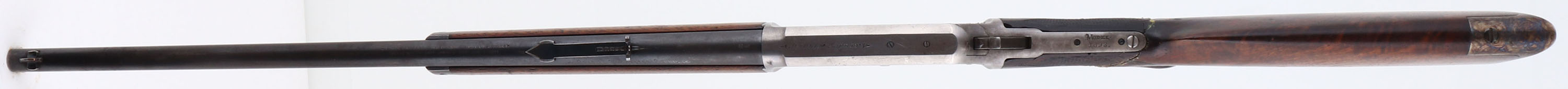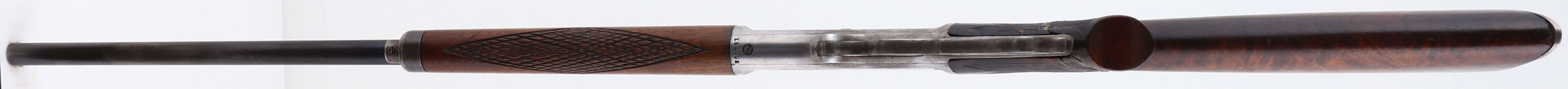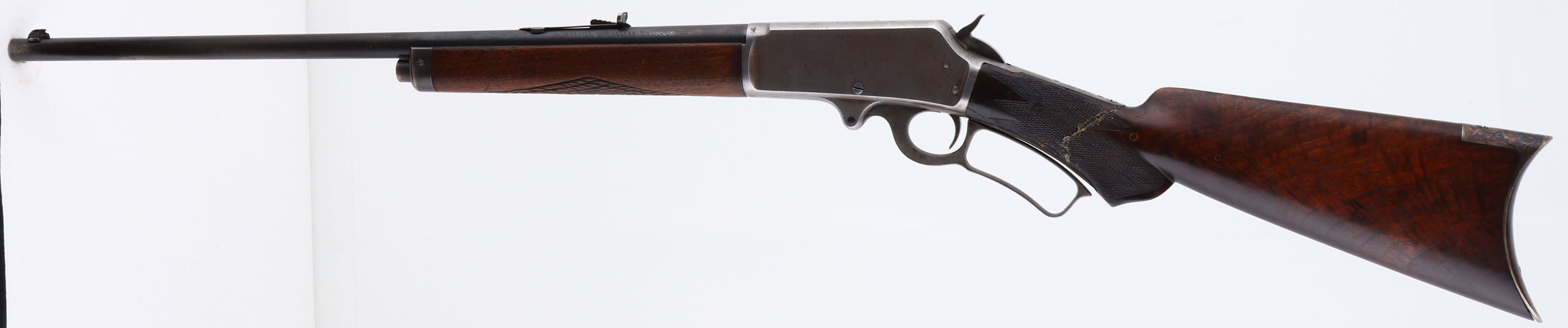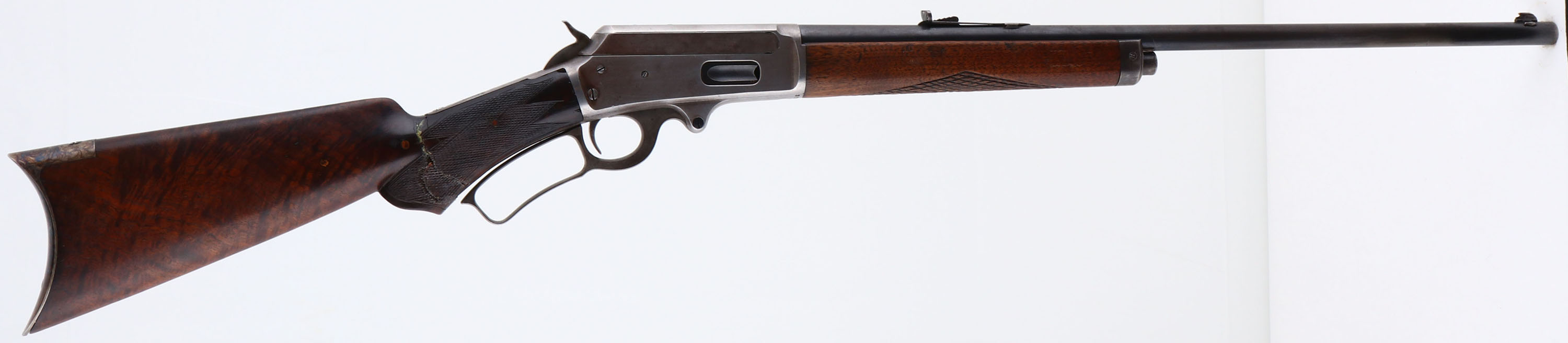 DELUXE Marlin, Model 1893, CAL; 32-40, MFG: 1904, SN: 309731, Lever Action Rifle, 22'' round barrel, 1/2 mag. The original deluxe checkered & scalloped pistol grip wood stock rates only fair due to a full break & attempted repair at the wrist. The repair shows glue at the repaired break, along with three dowels, one within the checkering & two running parallel behind the wrist. Stock is pretty solid & could be cleaned up more to make the repair less noticeable. The rippled grain on the stock is fantastic. The forearm is likely a model replacement & was non-factory hand checkered. There are minor scrapes & dings to the wood.. The original metal blue finish on the barrel has worn to 60%, with areas of thinning developing a brown patina & some worn to gun metal gray. The receiver is case-hardened & has fully worn gun metal gray, with a very thin layer aged patina & remnants of case-colors remaining in protected areas. The bottom of the barrel 4'' from muzzle has an odd filled dovetail. Bore is excellent, with light visible wear. The barrel holds an adjustable rear sight & blade front sight. Stock carries a smooth crescent metal buttplate with added case-colors. The top tang screw is a more recent replacement. A neat old gun that needs further restoration to bring it back to glory. FFL or C&R Req. - Value: 600 to 1500