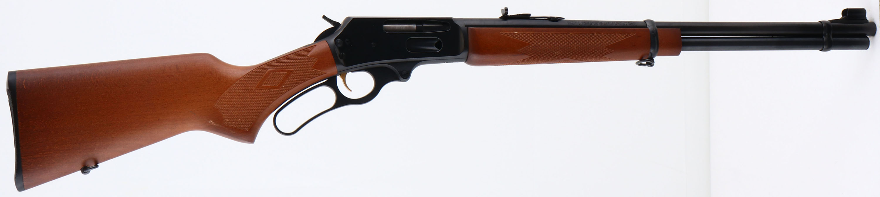 Marlin, Model 336W, CAL: 30-30, MFG: Modern, SN: 93031297, Lever Action Rifle, 20'' barrel, Full Mag. The checkered & flat pistol grip wood stocks are excellent & minty, with original finish. The metal blue finish rates 99% overall. Bore is excellent, with strong rifling. The barrel carries the original adjustable rear & ramp elevated hooded front sights. Receiver is factory tapped & drilled for scope mounts. Stock carries a Marlin checkered plastic buttplate. Factory sling loops present. Gold tone trigger. An excellent lever action hunting rifle. FFL Req. - Value: 400 to 800