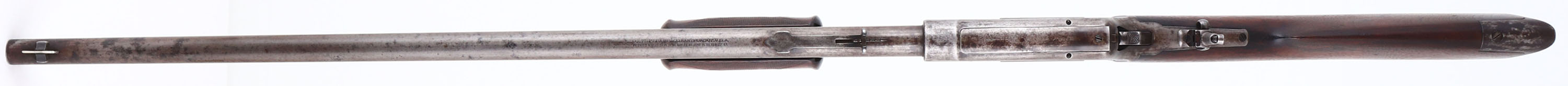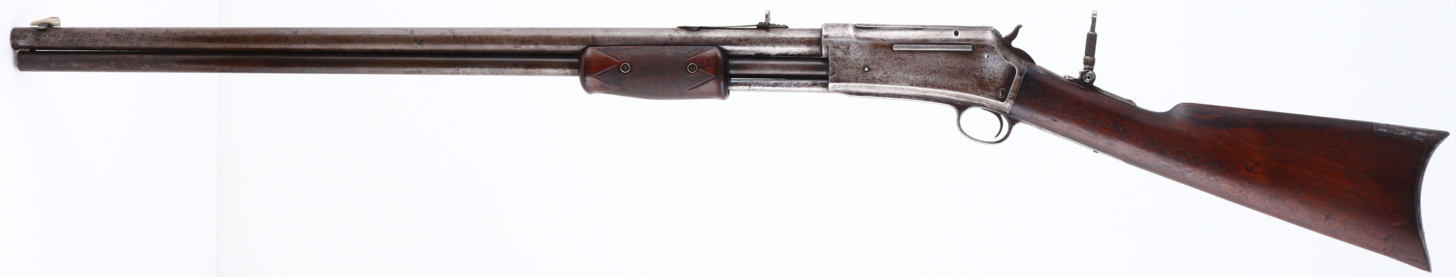 RARE Colt Lightning, Large Frame, Marked .45-85-285 CAL., MFG. 1888, SN: 1470, Slide Action Rifle, 28 1/4'' Round barrel, Full mag. Early, second year rifle. The factory stocks are excellent, with the correct checkered forend & non-checkered stock. The stock has a couple of tightly repaired 1'' cracks at the toe. The checkering on the forend remains very good, with a couple of small 1/2'' hairline cracks & edge nicks. The stocks appear to carry the original finish, with several small dings & minor scratches. The metal finish on barrel, mag & receiver has worn mostly gun metal gray, with spotty areas of brown patina. Rifle fitted with a Lyman flip-up adjustable tang sight, while the barrel carries an adjustable buckhorn rear & Rocky Mountain silver blade front sights. Bore is very good, with strong rifling & some light roughness. Crescent metal buttplate. Smooth tight action. One of only 6,496 large frame rifles were produced from 1887-94. Overall, a very nice example & fairly rare rifle. Antique, No FFL Req. - Value: 2000 to 4000