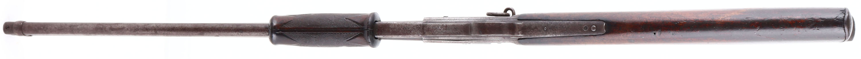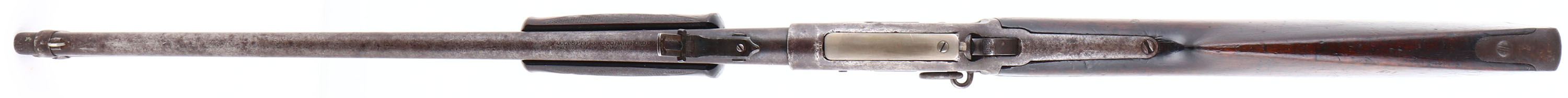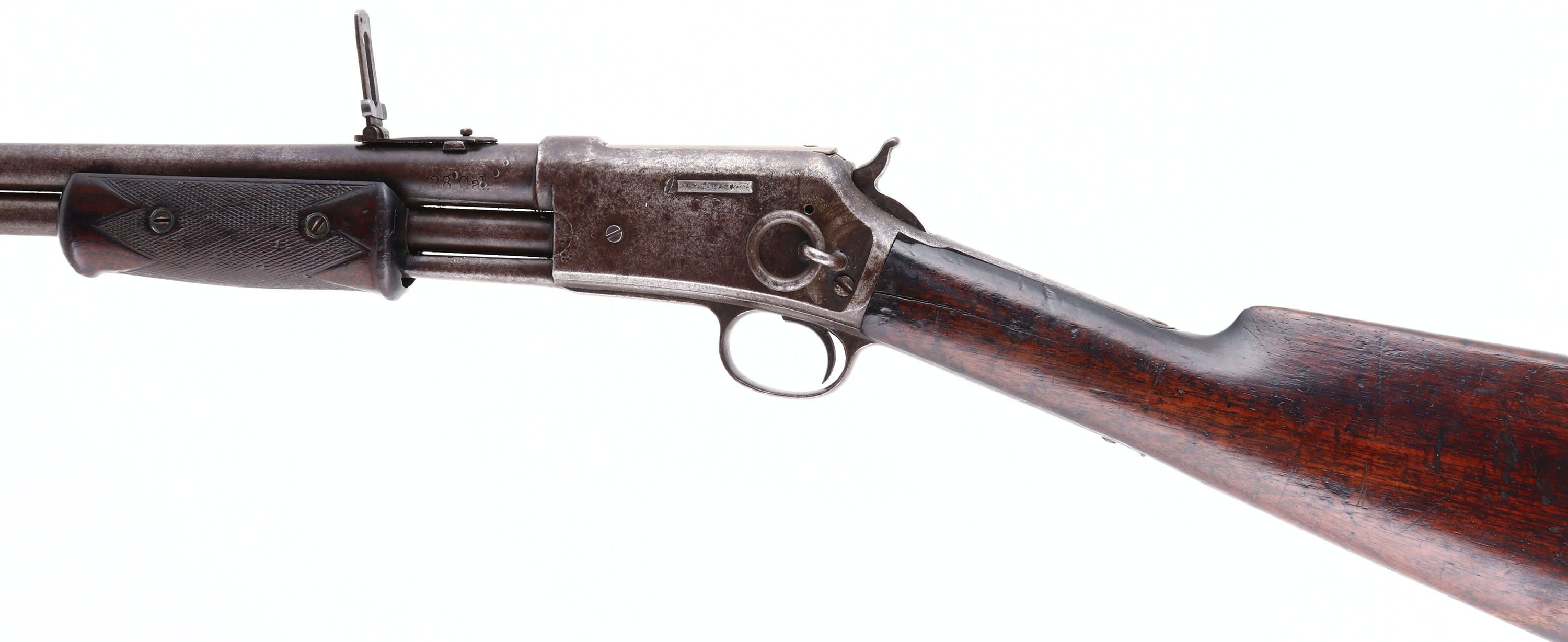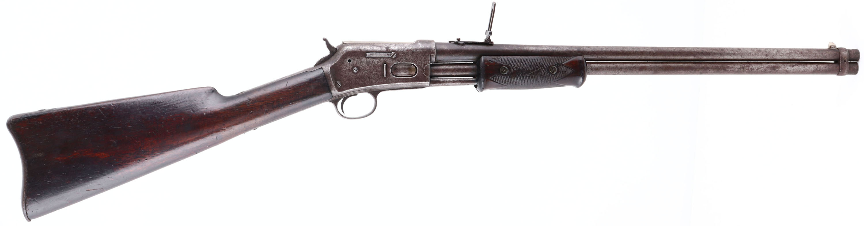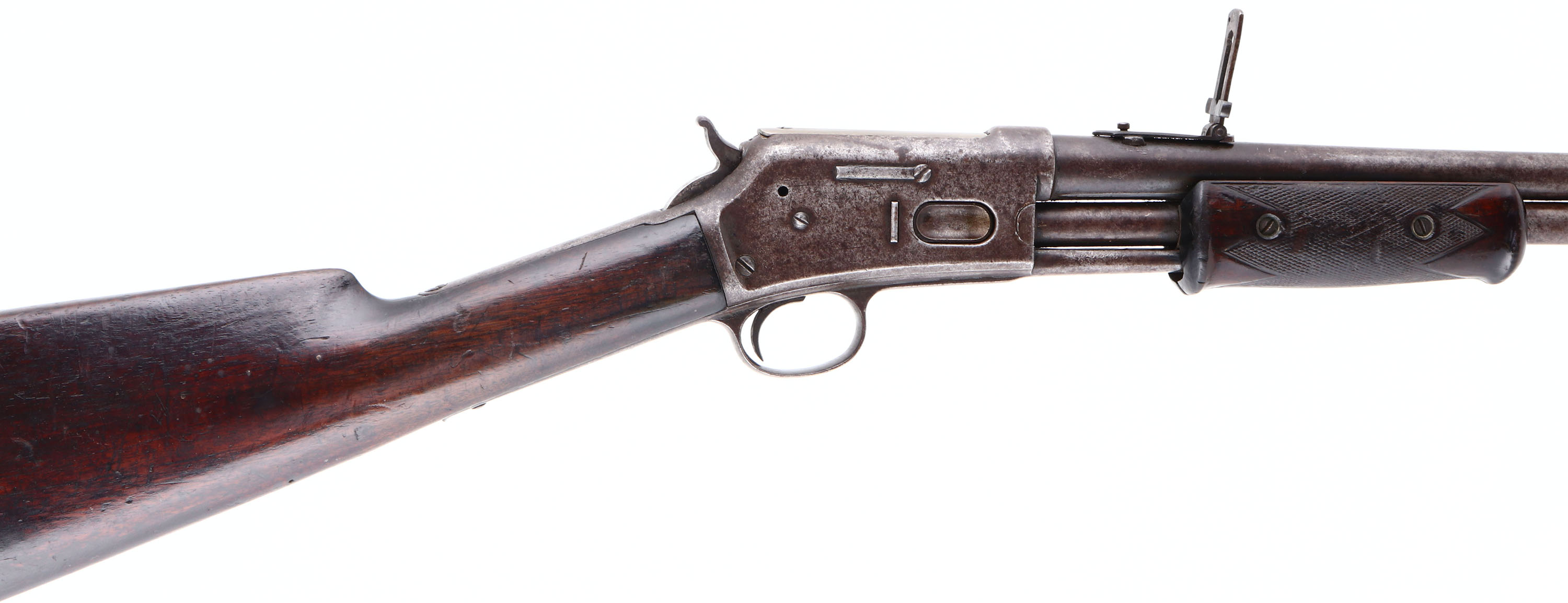 Colt Lightning, Medium Frame Saddle Ring Carbine, CAL: 38, MFG: 1889, SN: 33051, Pump Action Rifle, 20'' Round barrel, Full mag. The factory straight grip wood stock & checkered forend are very good. The stocks carry the original finish, with some darkening from use & added waxes or oils. The is a 2'' crack at the left side of the wrist & a tight grain crack emanating from the upper tang & another short tight grain crack on the forearm. There is some tiny edge chipping at the toe & a small chip at the front edge of the forend. There are also other small dings, scratches & contusions. The checkering is very good, but with smoothing from use. The original metal finish has worn mostly gun metal gray, with a spotty brown layer of patina & some remains of original finish in protected areas. Bore is fair, with spotty areas of roughness amongst strong rifling. Rifle is fitted with a flip-up ladder rear sight & a small silver blade front sight. Original saddle ring. Stock carries a carbine metal buttplate. Dust cover appears to be a replacement. A mostly original & rare example of a Colt saddle ring carbine. Antique, No FFL Req. - Value: 1000 to 2000