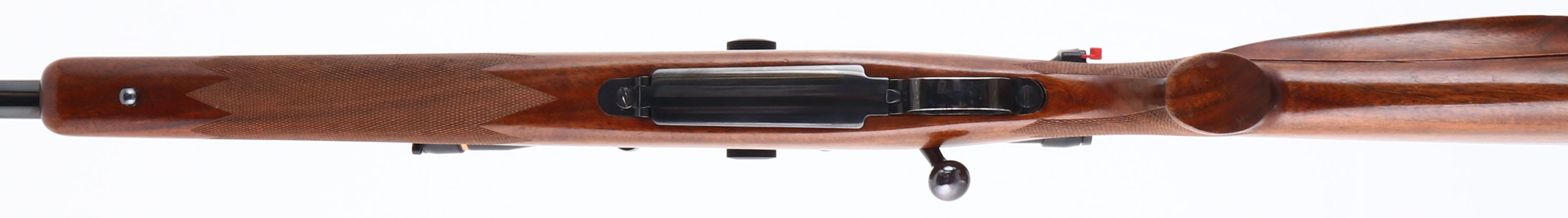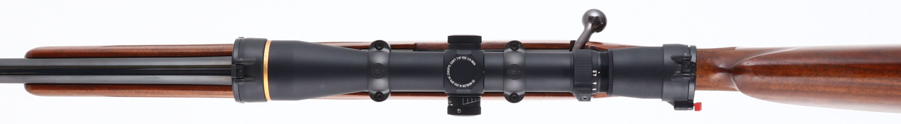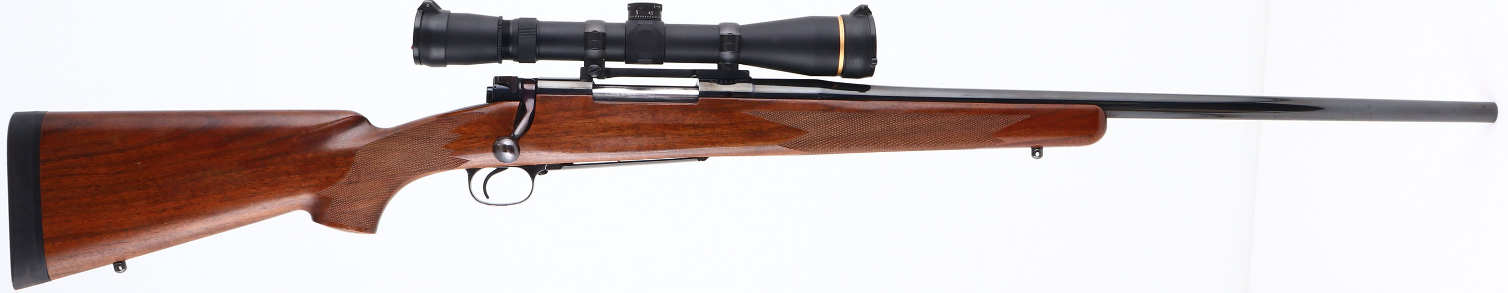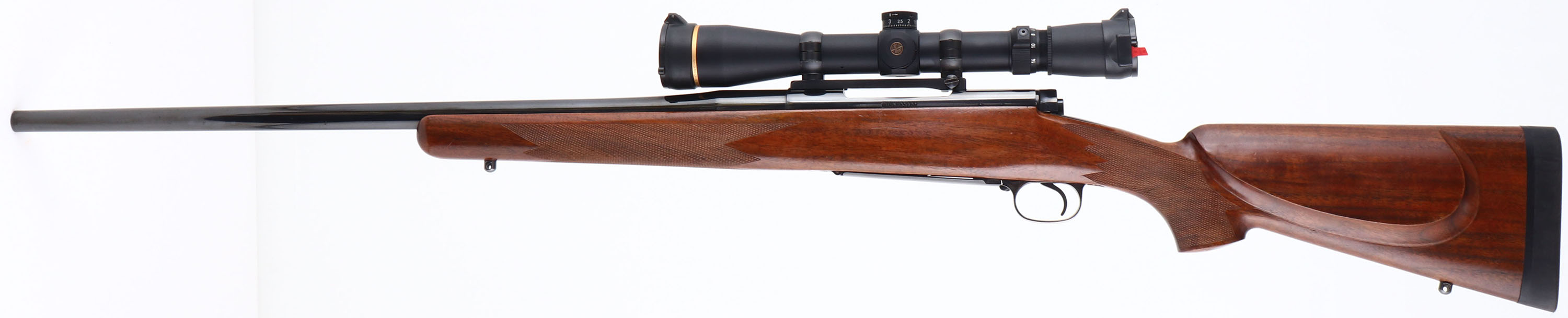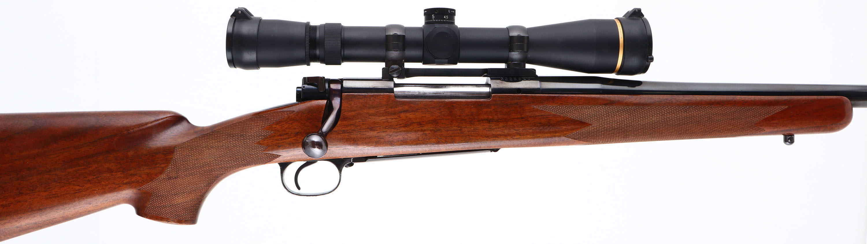 Winchester, Model 70, CAL: 35 Whelen Ackley Improved (not marked), MFG: Late 1960's, SN: G225220, Bolt Action Rifle, 24'' Heavy barrel. The original checkered flat pistol grip wood stock, with beaded cheek is excellent. There are light handling & storage marks to the original finish. The metal blue finish on the unmarked barrel is excellent, rating 97%. The receiver blue also rates 97%. There are no visible proof stampings on the barrel or receiver. There is no barrel address or legend stamped on the barrel, nor is there a visible caliber marking. Bore is excellent. The receiver holds a Leupold VX-3i 4.5-14x40mm scope, held by Leupold rings on a Redfield base. The top dial is factory marked with 35 Whelen caliber & bullet specs. No open sight provisions on barrel. Stock carries a solid black rubber recoil pad. Sling studs present. An excellent condition customized Model 70, with a high quality scope ready for the hunt. FFL or C&R Req. - Value: 800 to 1500