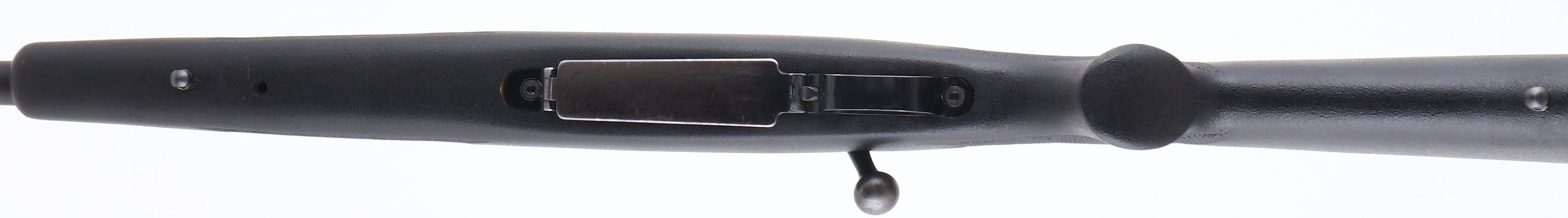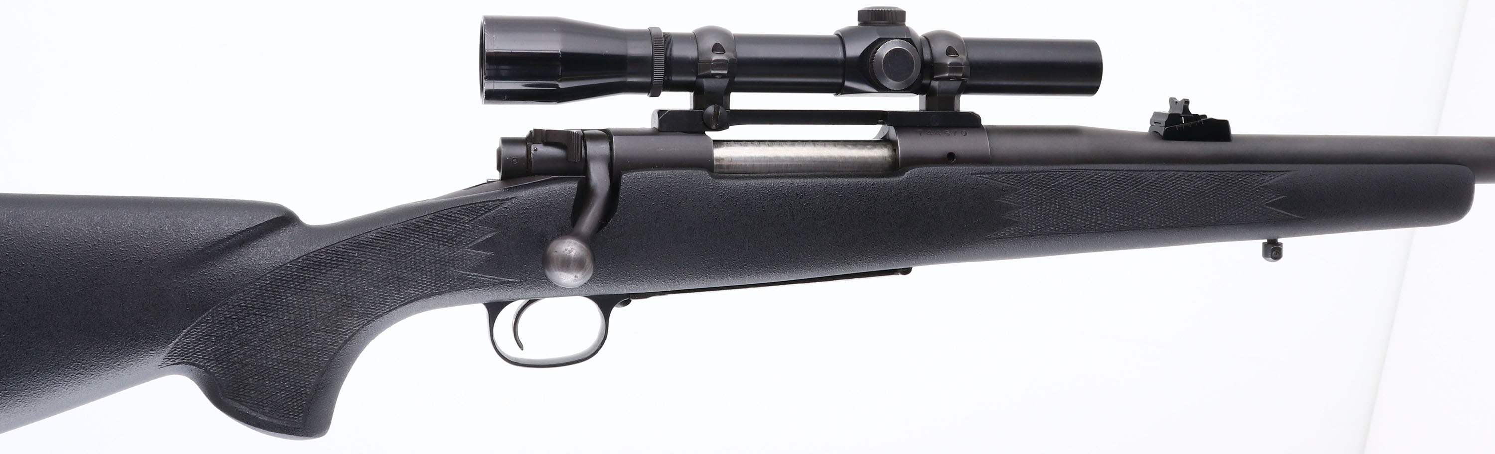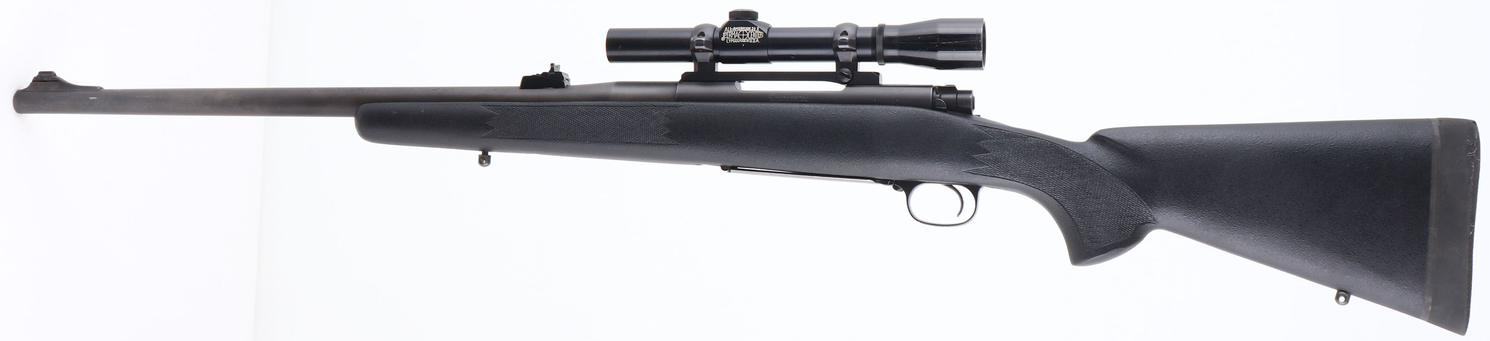 Winchester, Model 70, CAL: 375 H&H MAG, MFG: 1965, SN: 744670, Bolt Action Rifle, 21'' barrel. The checkered & flat pistol grip synthetic stock is excellent. There is an extra hole in the forend belly of the stock behind the front sling stud. The satin metal gray finish on the barrel is excellent. The satin black finish on the receiver rates 98%. 30% original blue left on trigger guard & floorplate. Bore is excellent. The receiver holds a Lyman All-American 2 1/2X scope, mounted on Redfield mounts. The barrel has a Williams adjustable rear sight & ramp elevated tall blade front sight. One additional screw filled hole in barrel just ahead of rear sight. Solid rubber recoil pad. Sling studs. FFL or C&R Req. - Value: 400 to 800