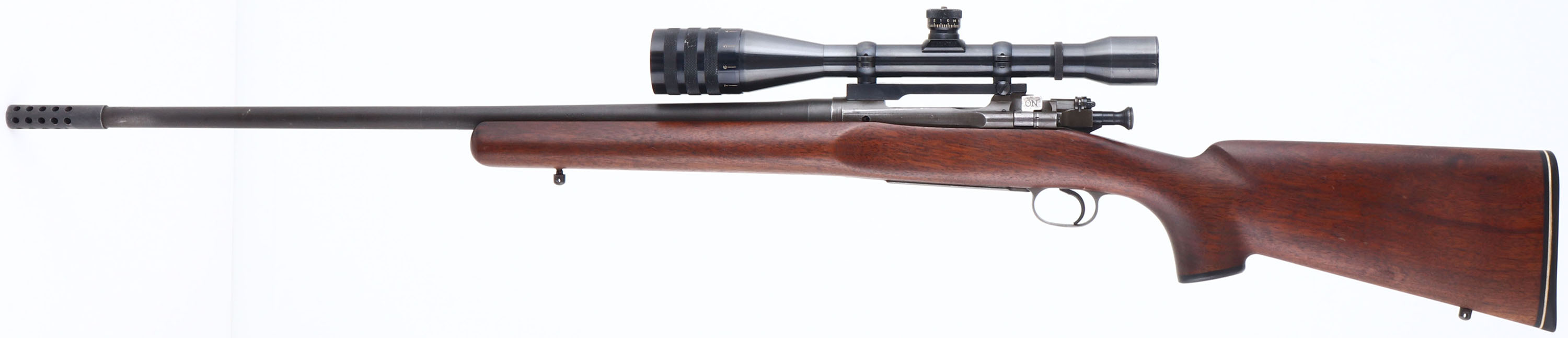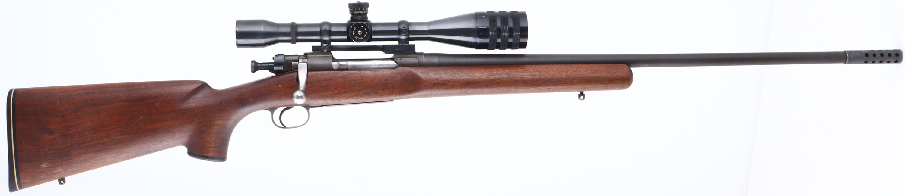 Custom Rifle, Remington, Model 03-A3, CAL: 30-06, MFG: 1942 (Receiver), SN: 3563133, Bolt Action Rifle, 26'' barre including the muzzle break. The capped pistol grip wood stock, with beaver tail forend is excellent. There are minor contusions & scrapes to the finish. The original military style metal finish is excellent, with light spotting. Bore is excellent. Barrel marked ''RA'', a fire bomb ''12 43'' at muzzle end, ''XA60'' half way down the barrel & some proof stamping at the receiver end. The receiver holds a Weaver Micro-Trac T-10 scope. No open sight provisions. Pachmayr solid recoil pad. Sling studs. FFL or C&R Req. - Value: 300 to 600