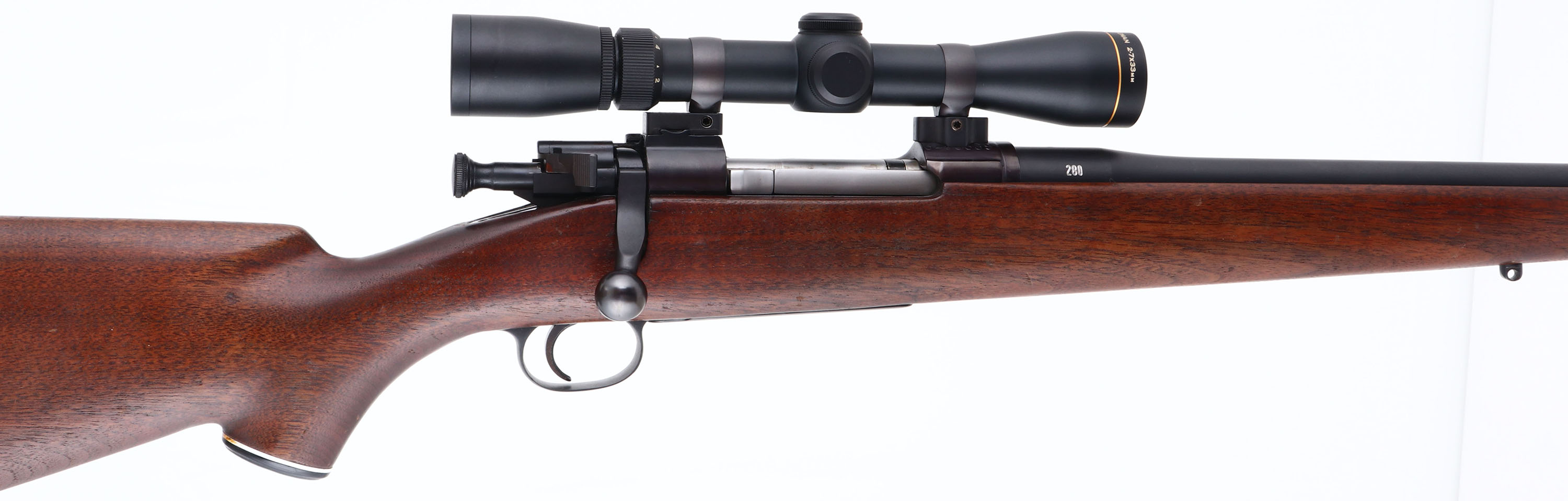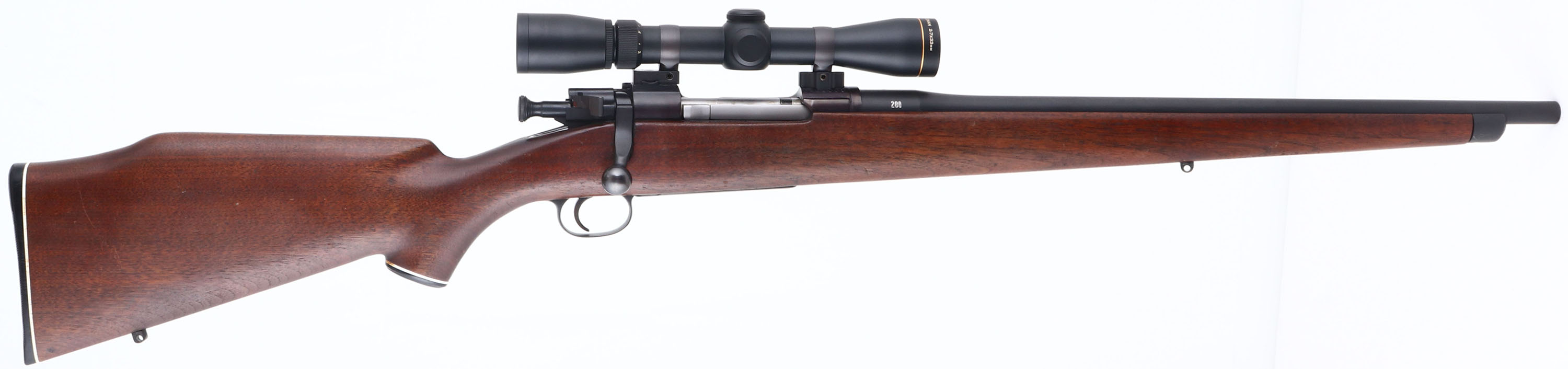 Custom Rifle, Remington, Model 1903A3, CAL: 280, MFG: 1942 (Receiver), SN: 3465339, Bolt Action Rifle, 20'' barrel. The full length, cheeked & capped flat pistol grip wood stock is excellent. There are minor surface scrapes & dings to the finish. There is a tight 1'' stress crack coming off the back of the receiver. The satin black finish on the barrel, floor plate & trigger guard rates 99%. The metal blue finish on the receiver rates 97%, toned to a plum patina. Bore is excellent. The receiver holds a Leupold Rifleman 2-7x33mm scope. No open sight provisions. Sling studs present. A very nice customized rifle built off a 1903A3 receiver. FFL or C&R Req. - Value: 400 to 800