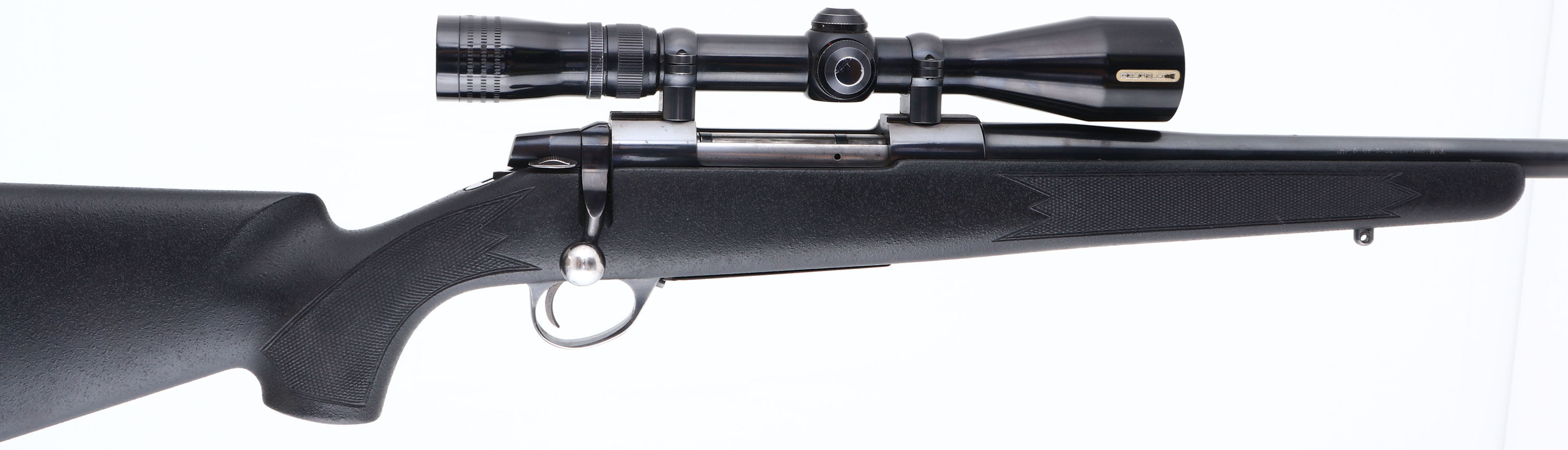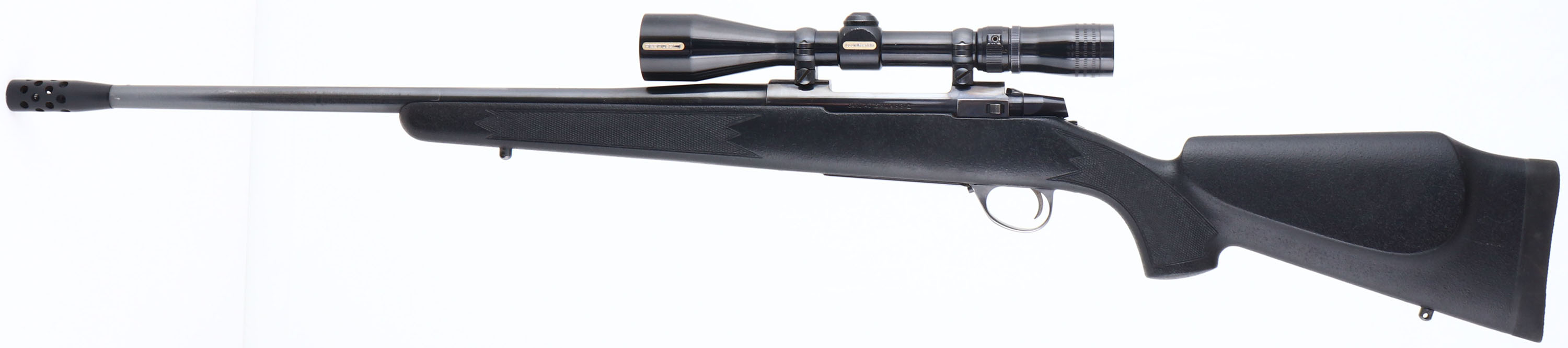 Sako, Model ''AV'' CAL: 338 WIN MAG, MFG: Modern, SN: 5904963, Bolt Action Rifle, 22 1/2'' threaded barrel, with muzzle brake. The checkered, cheeked & pistol grip Monte Carlo synthetic stock is excellent. The textured matte finish shows very little use. The metal blue finish rates 90% overall. Bore is excellent, with strong rifling. The receiver carries a Redfield Illuminator 3x9 scope. The barrel has open sight provisions, with 3 of 4 screw holes are screw filled. Stock carries a solid black rubber recoil pad. Sling studs present. This would make an excellent all weather hunting rifle. FFL Req. - Value: 500 to 1000