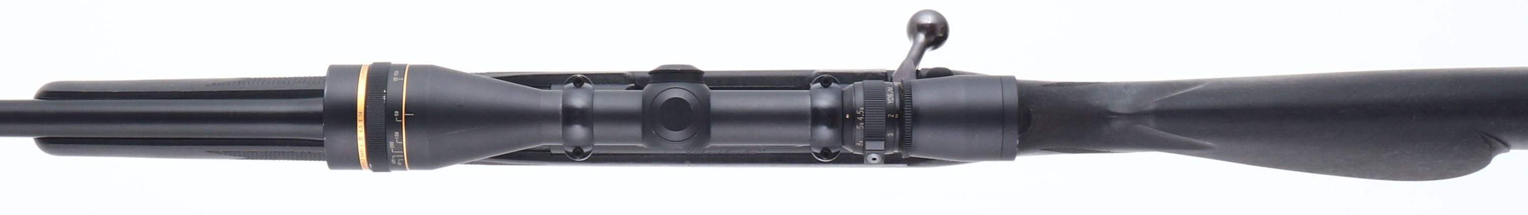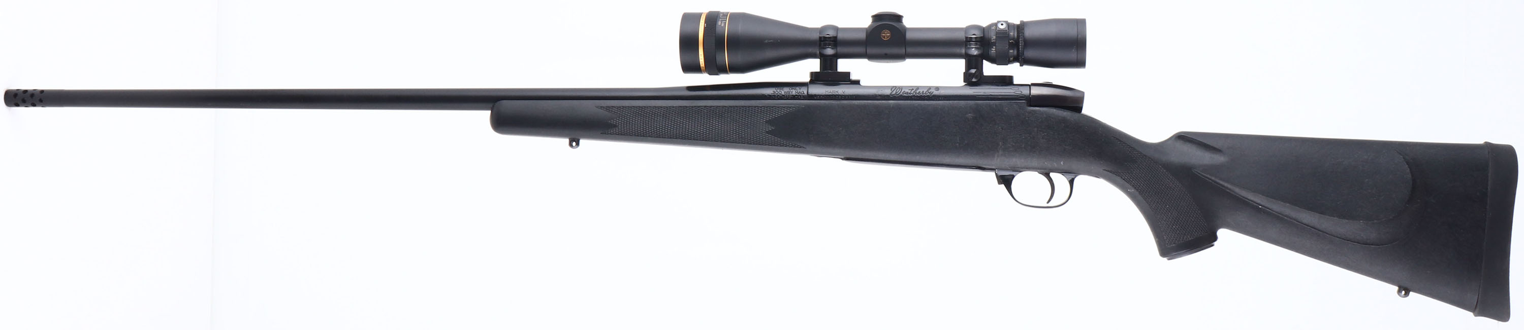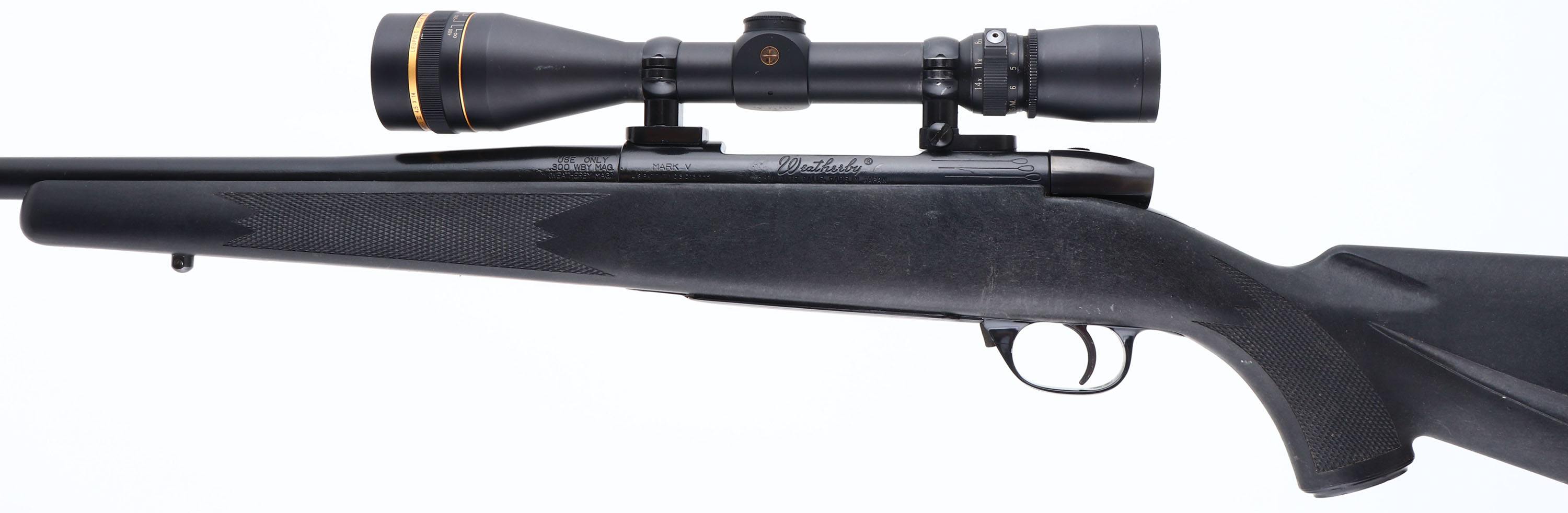 Weatherby, Mark V, CAL: 300 WBY MAG, MFG: 1973-95, SN: H263664, Bolt Action Rifle, 26'' barrel, 27 1/2'' w/ muzzle brake. The original checkered, cheeked & capped synthetic stock is very good, with light scratches & scrapes from light use. The aftermarket black metal finish or coating is very good, with small spots on the receiver. Bore is dark from metal coating process, but still very good, with spotty roughness amongst strong rifling. The receiver carries a Leupold Gold Ring Vari-X III 4.5 x 14 scope, held by Burris scope mounts. No open sight provisions. Stock carries a solid black rubber recoil pad. Sling studs present. FFL Req. - Value: 600 to 1100