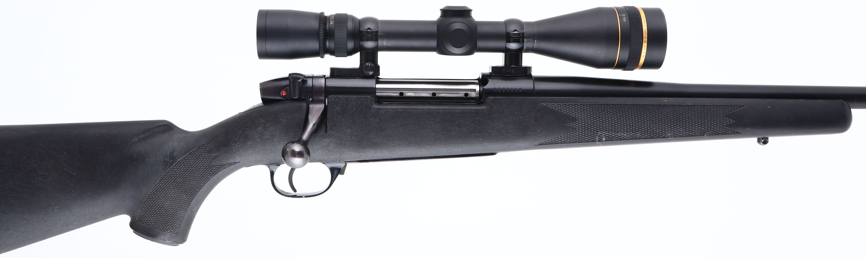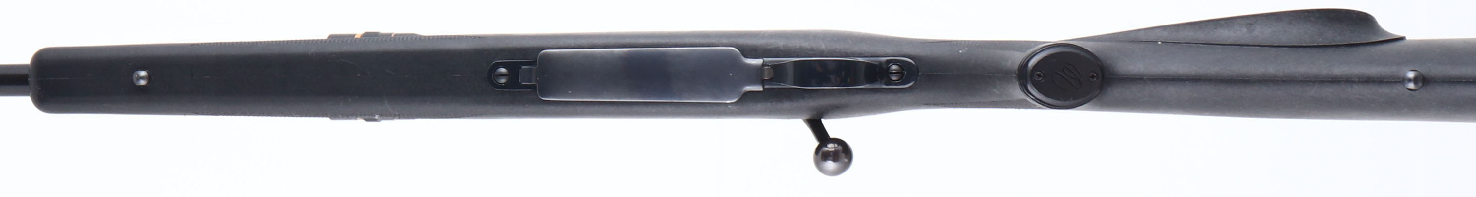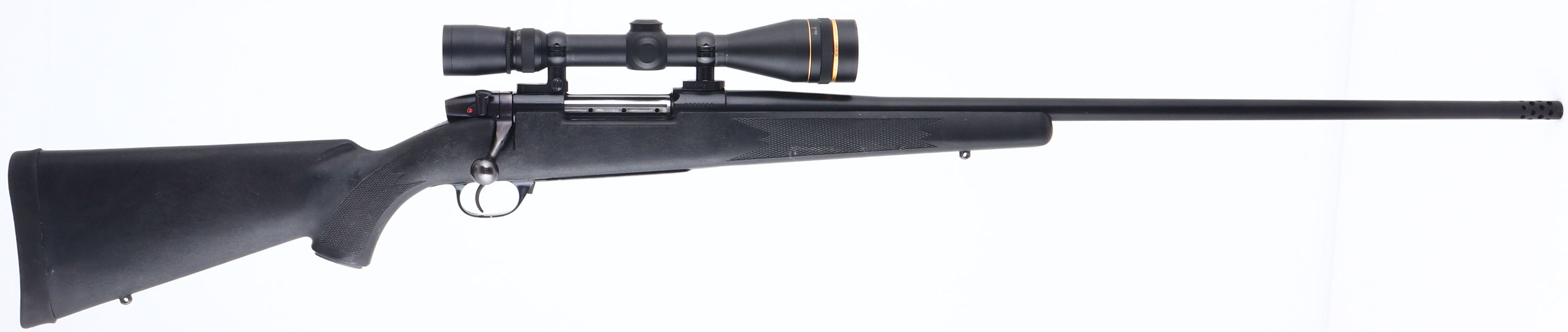 Weatherby, Mark V, CAL: 300 WBY MAG, MFG: 1973-95, SN: H263664, Bolt Action Rifle, 26'' barrel, 27 1/2'' w/ muzzle brake. The original checkered, cheeked & capped synthetic stock is very good, with light scratches & scrapes from light use. The aftermarket black metal finish or coating is very good, with small spots on the receiver. Bore is dark from metal coating process, but still very good, with spotty roughness amongst strong rifling. The receiver carries a Leupold Gold Ring Vari-X III 4.5 x 14 scope, held by Burris scope mounts. No open sight provisions. Stock carries a solid black rubber recoil pad. Sling studs present. FFL Req. - Value: 600 to 1100