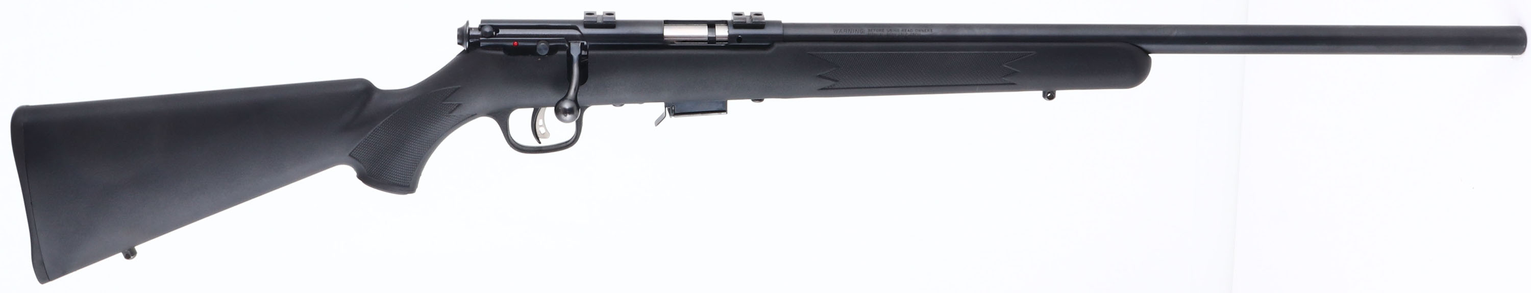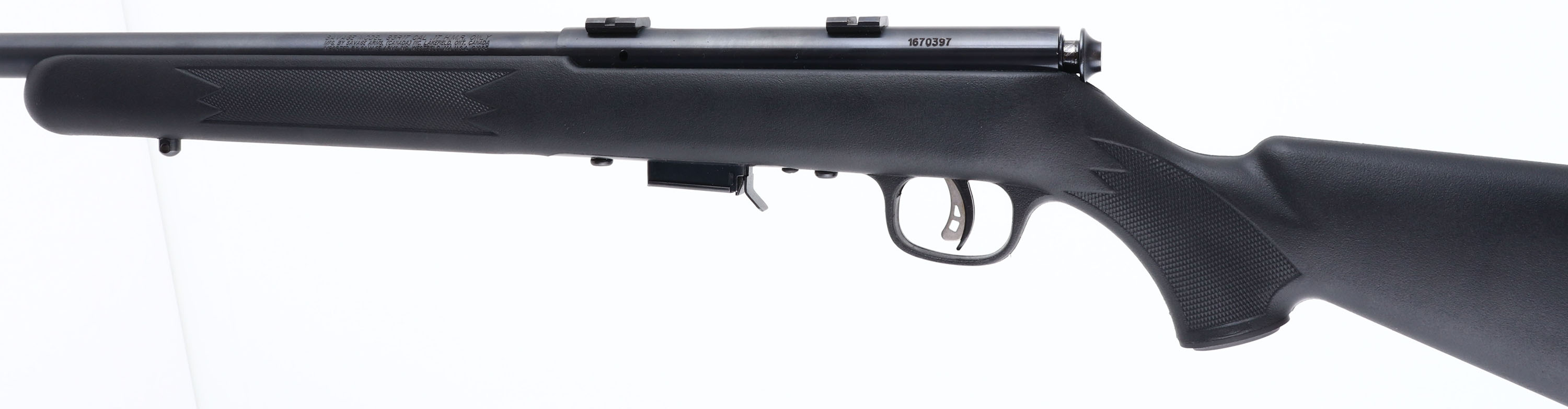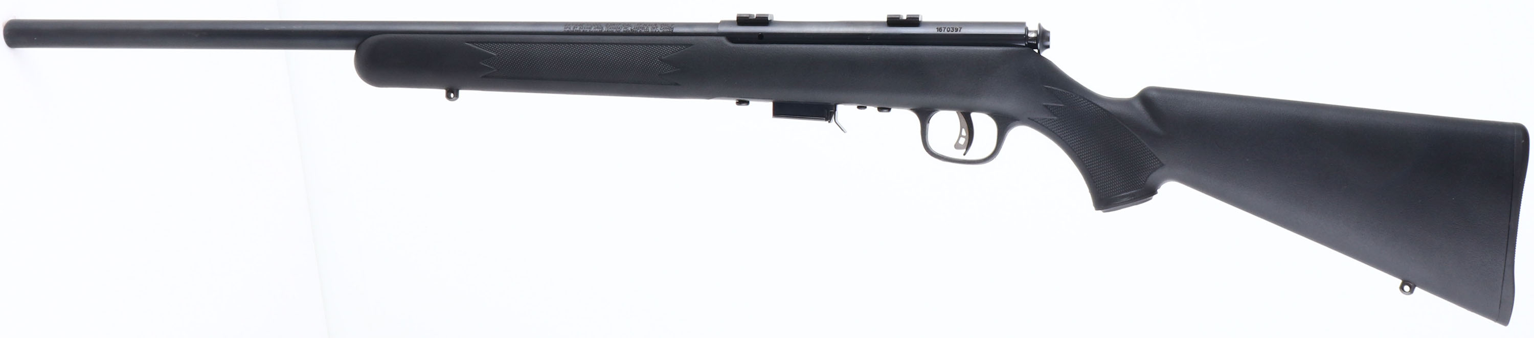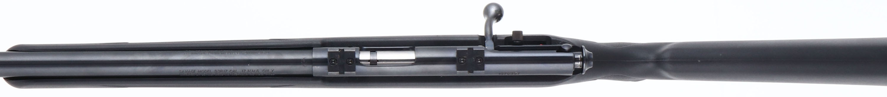 Savage, Model 93R17, CAL: 17 HMR, MFG: Modern, SN: 1670397, Bolt Action Rifle, 21'' barrel. The checkered & capped pistol grip black synthetic stock is excellent. The factory metal blue finish rates 99% overall. Bore is excellent. The receiver holds a set of factory installed scope blocks. No open sight provisions. Stock carries a Savage plastic buttplate. Sling studs present. Adjustable AccuTrigger. Detachable mag. A nearly new varmint rifle. FFL Req. - Value: 200 to 400