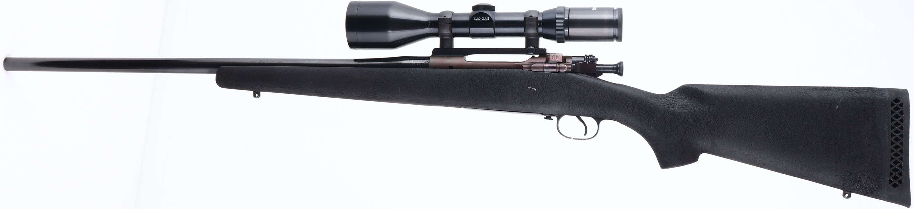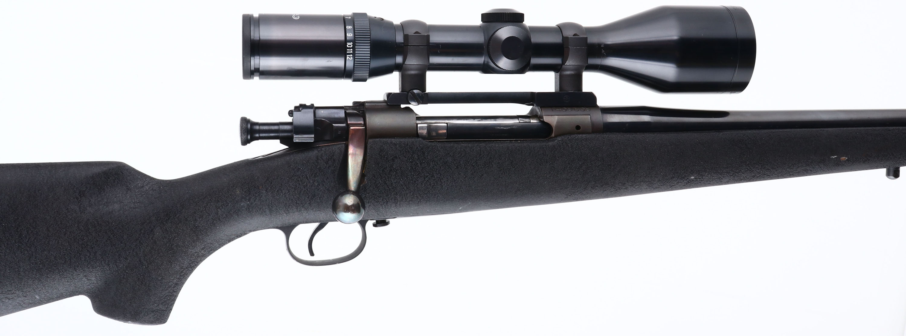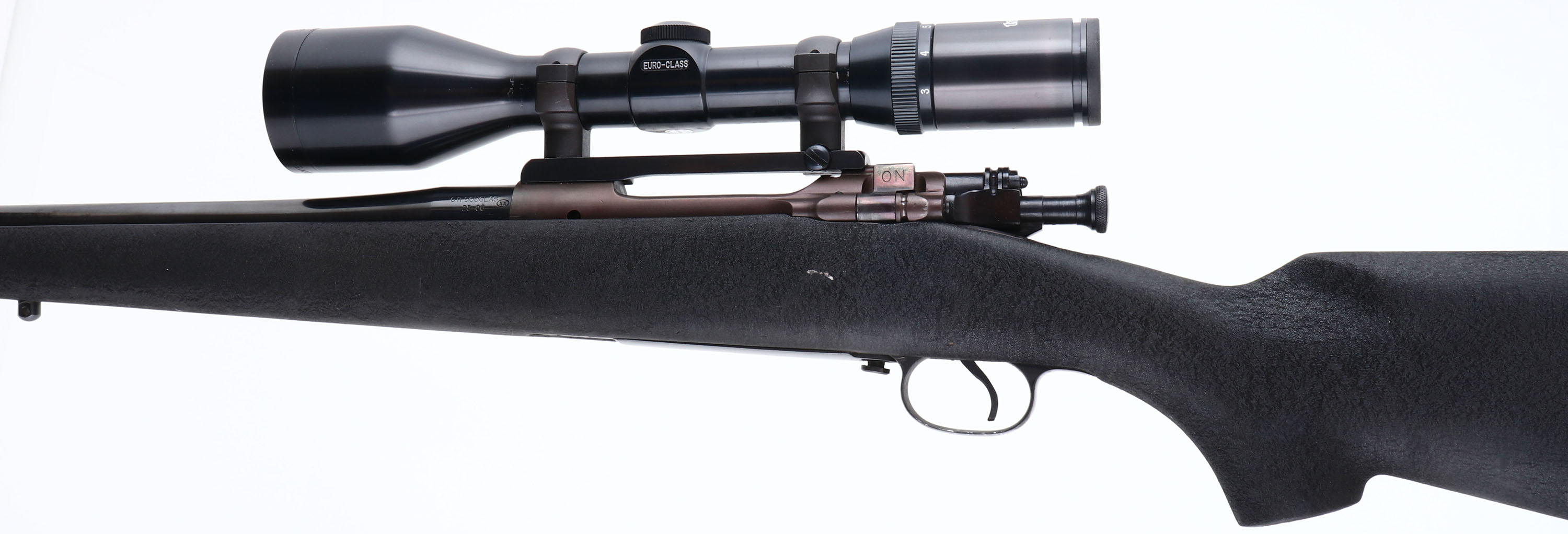 Custom Rifle, Springfield, Model 1903 Action, CAL: 25-06, MFG: 1933, SN: 1439839, Bolt Action Rifle, 22 1/2'' GR Douglas barrel. The textured flat pistol grip composite stock is excellent. There are minor nicks & dings to the textured finish. There are also chips missing from the edge of the bolt notch. The metal blue finish on the barrel rates 97%. The receiver has a military style gray finish, toning to a plum patina mostly on the left side.. Bore is excellent. The receiver holds a Tasco Euro Class 3-12x52 scope, on a Redfield scope mount. No open sight provisions. Sling studs. Pachmayr ventilated recoil pad. A nice custom hunting rifle built off a 1903 action. FFL or C&R Req. - Value: 400 to 800