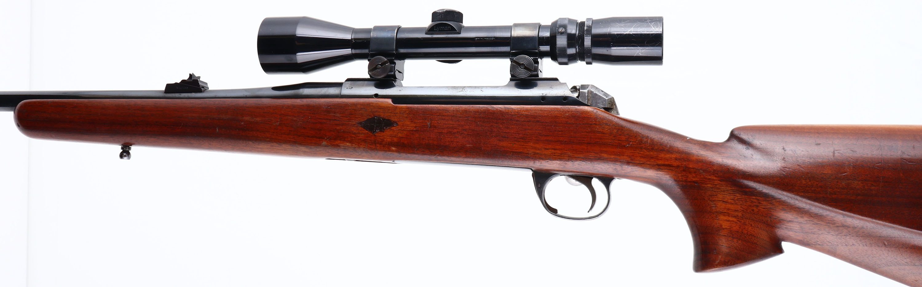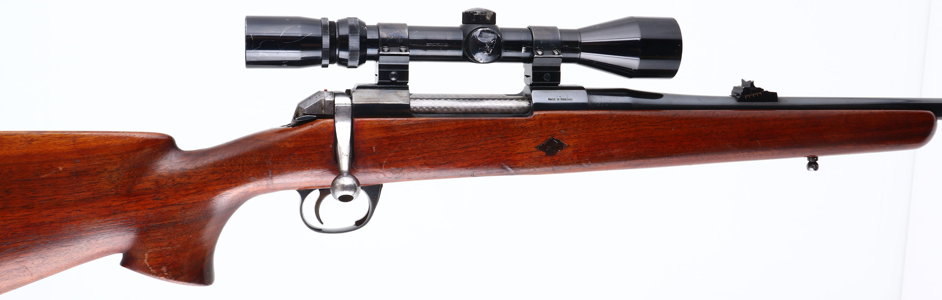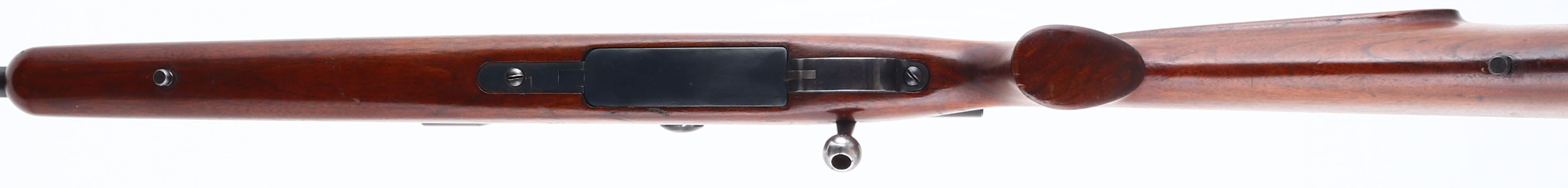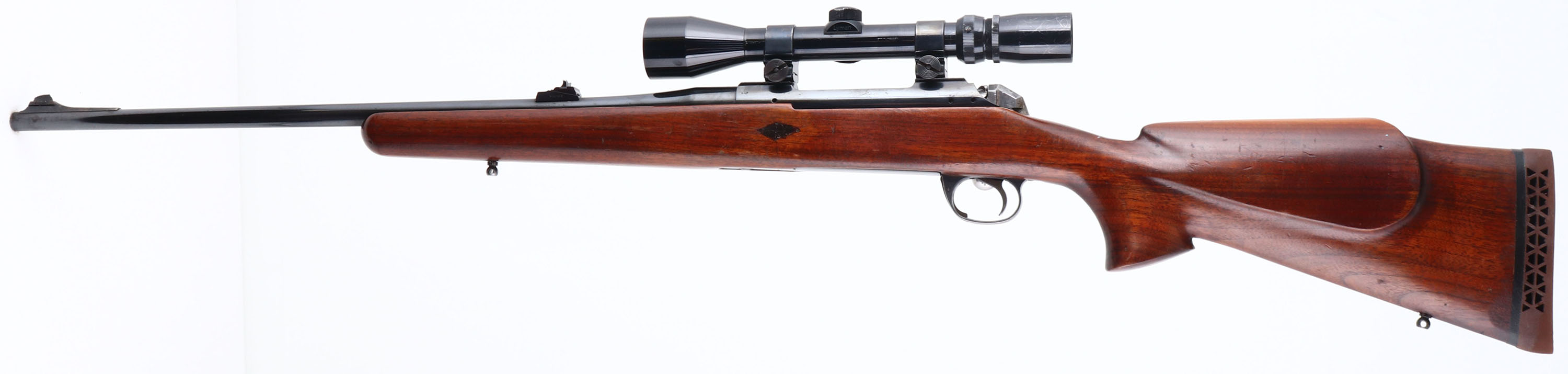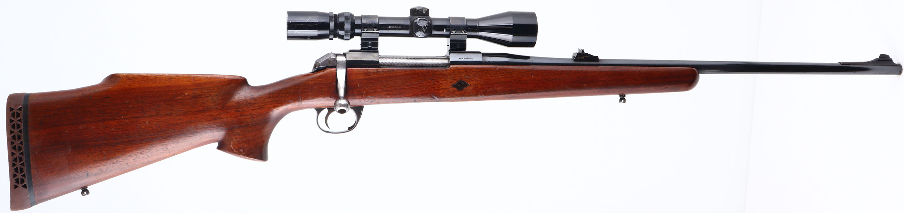 Custom Rifle, English Bolt Action Rifle, CAL: 338, MFG: N/A, Made in England, SN: NSN, Bolt Action Rifle, 23'' barrel. The raised cheek & flat pistol grip Monte Carlo wood stock is excellent. There are minor contusions, scrapes & dings, with areas of thinning to the finish. Diamond shaped inlays on the forend sides of the stock. The metal blue finish rates 90% overall, with some spotting & speckling. Bore is excellent, with light visible wear from normal use. The receiver carries a Lyman scope & has two open holes for a receiver sight. The barrel holds a Williams sliding rear sight & a ramp elevated blade front sight. Pachmayr ventilated recoil pad. Sling studs. FFL or C&R Req. - Value: 300 to 600
