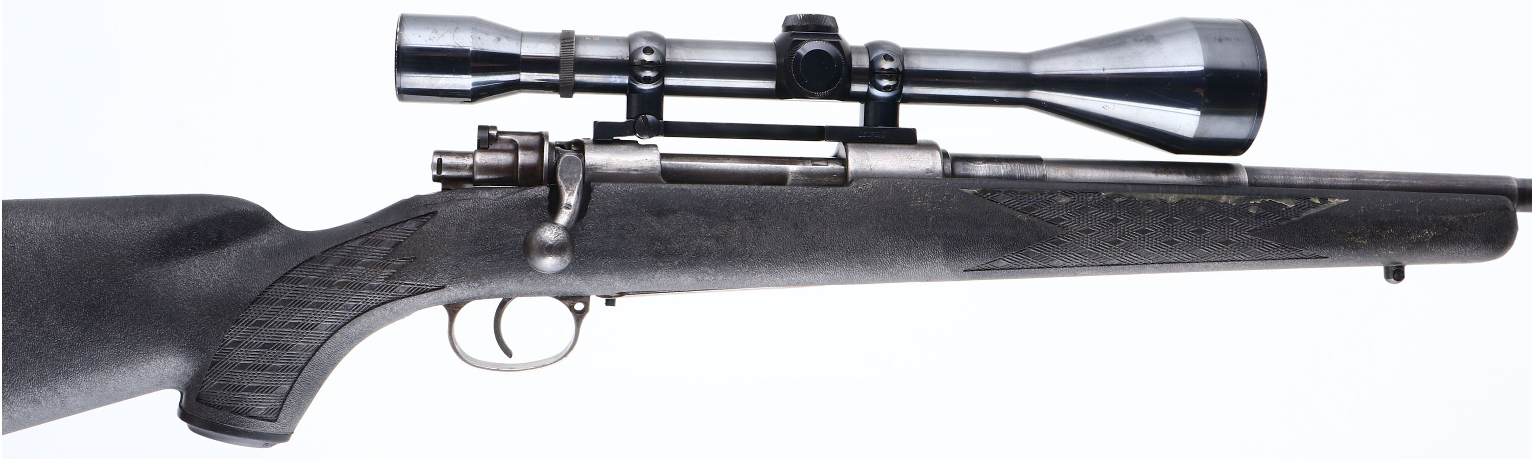 Custom Rifle, CZ, Model VZ24, CAL: 7.92x57mm, MFG: 1924-42, SN: 38931 (Receiver), Mauser type Bolt Action Rifle, 26'' step-down barrel. The Ram-Line checkered & flat pistol grip composite stock is very good, with minor scrapes & dings. There is a glue or epoxy substance on the right side of the fore grip in the checkering. The bolt notch was carved out. The metal finish has worn mostly gun metal gray, with remnants of remaining blue. Bore is very good, with strong rifling & visible light wear from honest use. The receiver holds a Weaver Micro-Trac K-856 scope. No open sight provisions. Sling studs. Ventilated recoil pad. FFL or C&R Req. - Value: 300 to 600