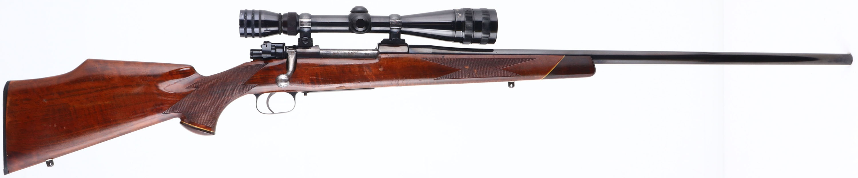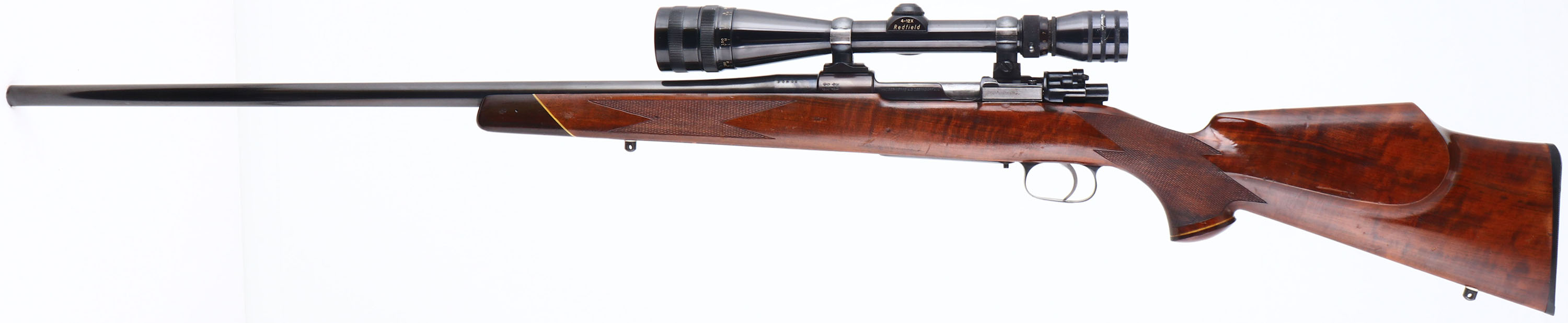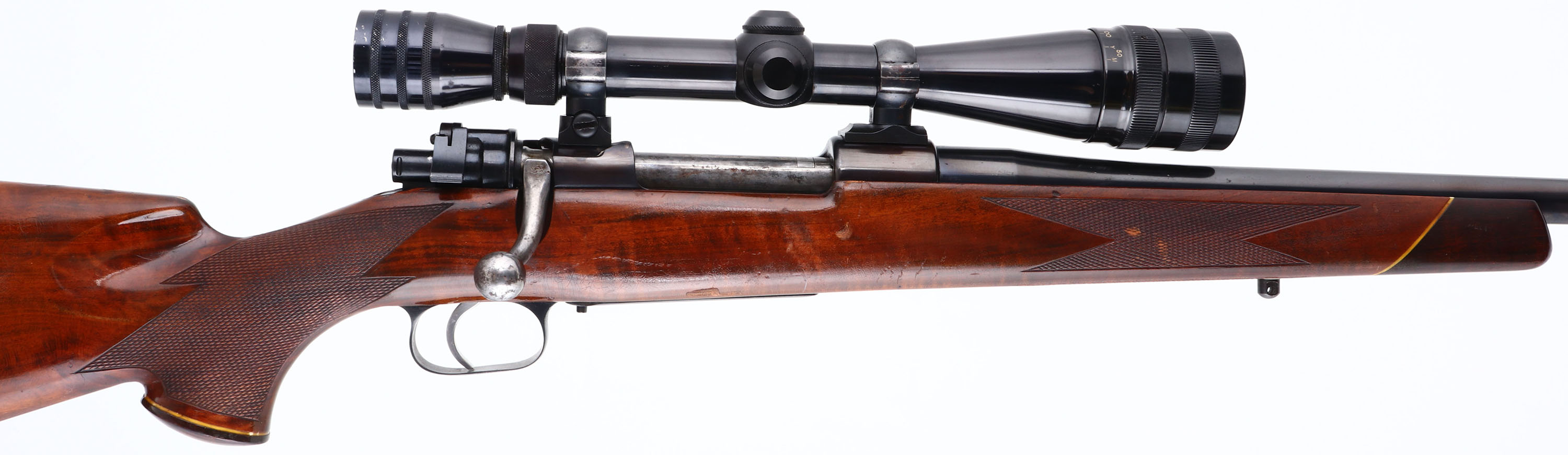 Custom Rifle, Mauser, K98K Action, CAL: 30-06, MFG: N/A, SN: 20132, Bolt Action Rifle, 26 1/2'' barrel. The checkered, cheeked & flat pistol grip Monte Carlo wood stock, with redwood forend tip & pistol grip cap, is excellent. There are contusions, scrapes & dings to the applied high gloss finish, which shows some crinkling or spiderwebbing. The metal blue finish on the barrel rates 95%. The 90% receiver finish has toned plum. Bore is excellent. The receiver holds a Redfield 4-12x scope. No open sight provisions. Sling studs. Checkered plastic buttplate. A customized hunting rifle built on a Mauser 98 action. FFL or C&R Req. - Value: 400 to 800