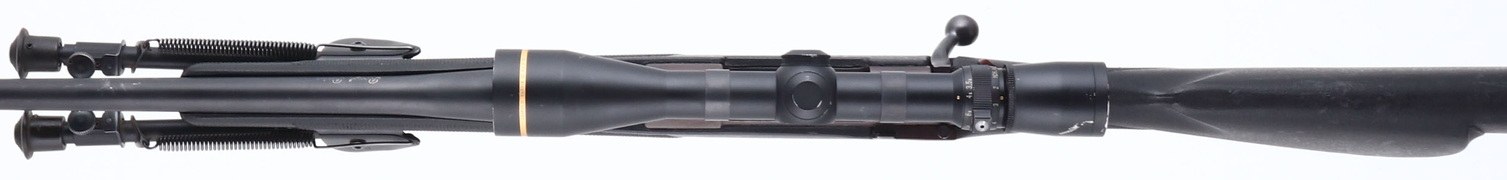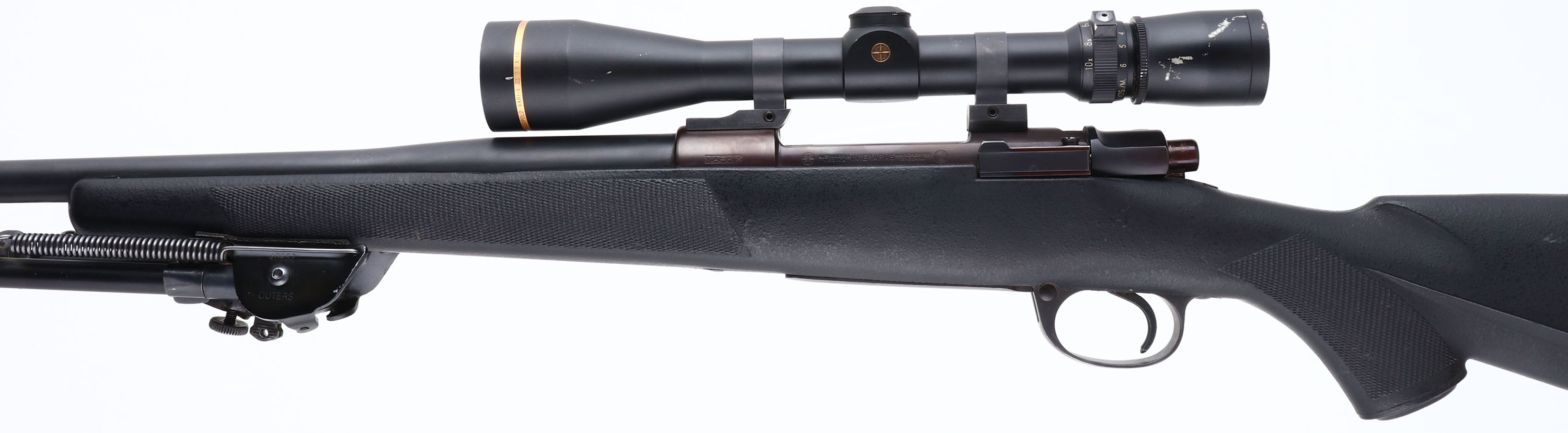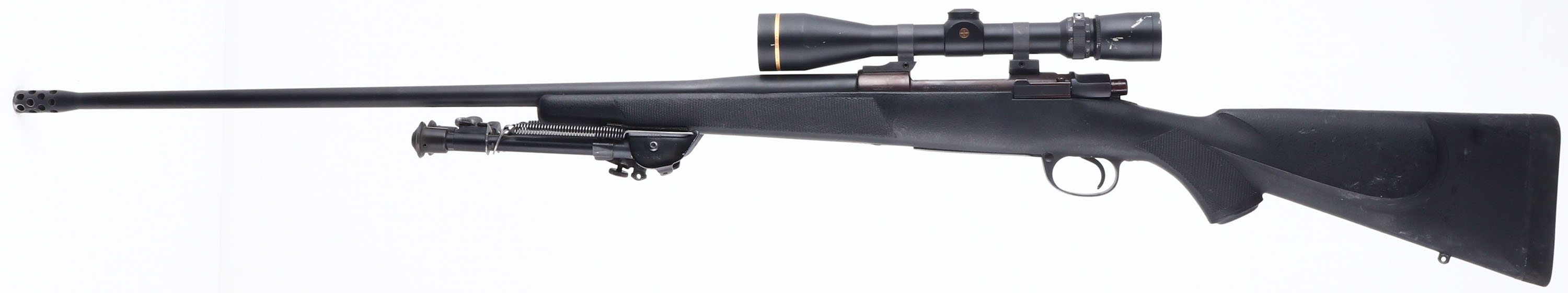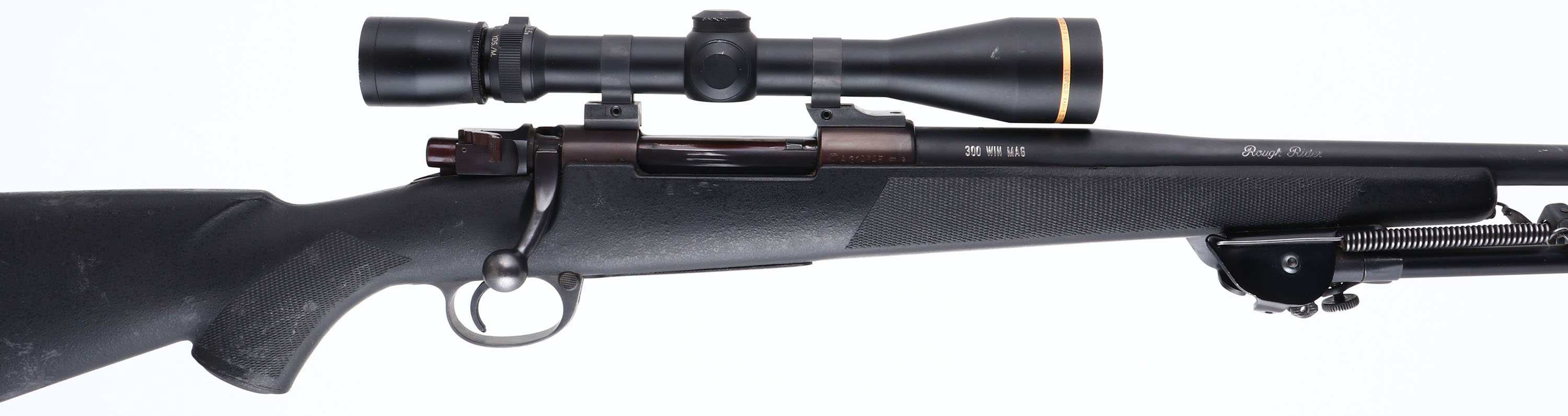 Custom Rifle, Interarms, Mark-X, CAL: 300 WIN MAG, MFG: modern, SN: A314645, Bolt Action Rifle, 26'' barrel, (27 1/2'' w/ muzzle brake). The checkered, capped, cheeked & pistol grip composite stock is very good, with small scuffs, dings & scrapes. The matte black finish on the barrel rates 97%. The right side of the barrel is marked ''Rough Rider'' in cursive. The finish on receiver rates 90%, toned to a plum patina. Bore is excellent & bright. The receiver holds a Leupold Vari-X III 3.5x10 scope. No open sight provisions. Stock carries a Outers bipod & solid black recoil pad. Single rear sling stud. A rifle of Yugoslavian origin, imported by Interarms in the 1990's. FFL Req. - Value: 400 to 800
