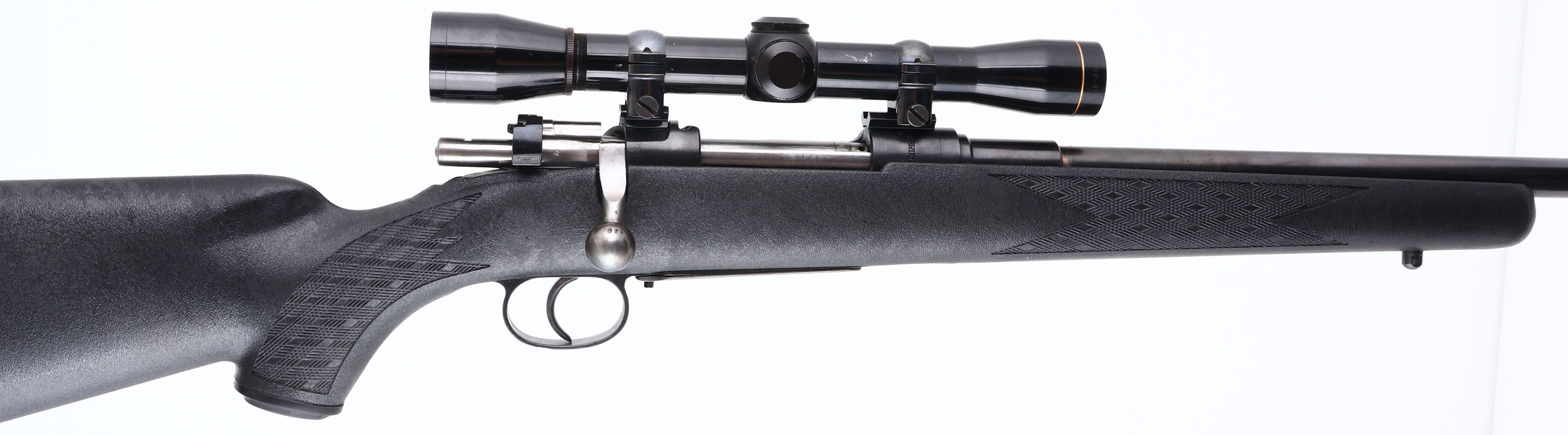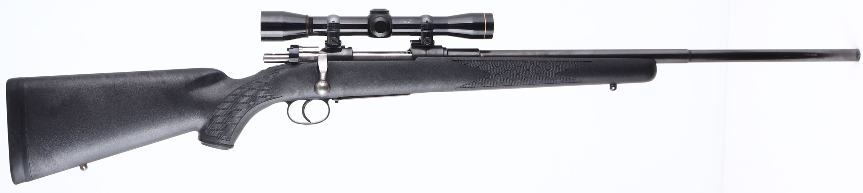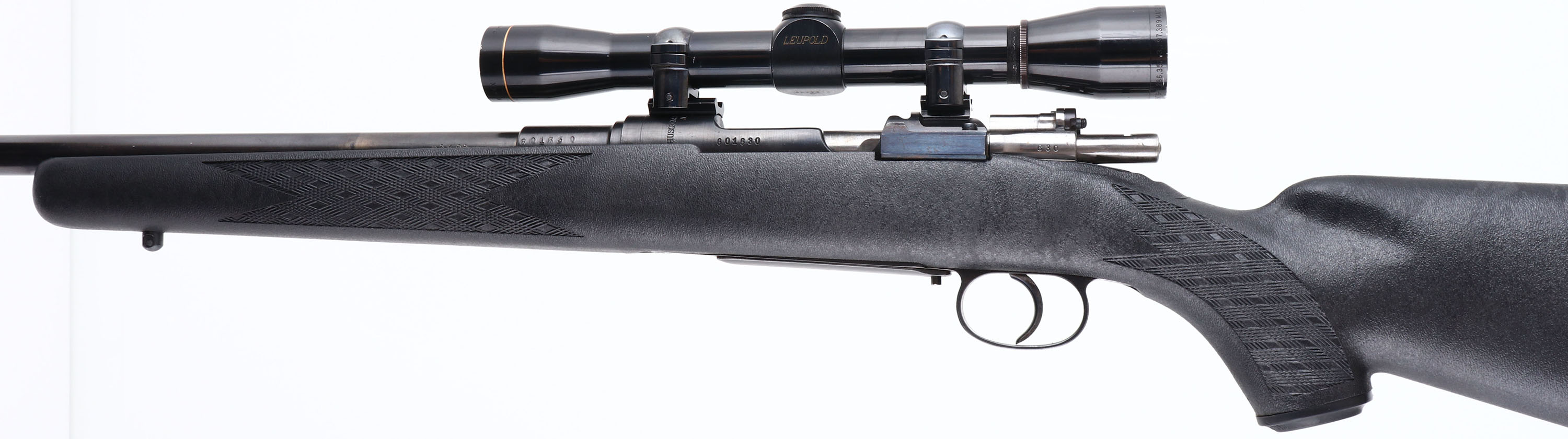 Custom Rifle, Husqvarna, Model M38 Swedish Mauser Action, CAL: 6.6x55, MFG: 1941, SN: 601630, Bolt Action Rifle, 23'' step-down barrel. The RAM-Line checkered & capped synthetic stock is excellent. The metal blue finish on barrel rates 80%, with scuffs, scrapes & areas of wear & thinning. Finish on receiver & floorplate rate 90%. Bore is excellent. The receiver holds a Leupold M8-4X scope. No open sight provisions. Solid black recoil pad. Sling studs. A Nicely built custom hunting rifle. FFL or C&R Req. - Value: 300 to 600