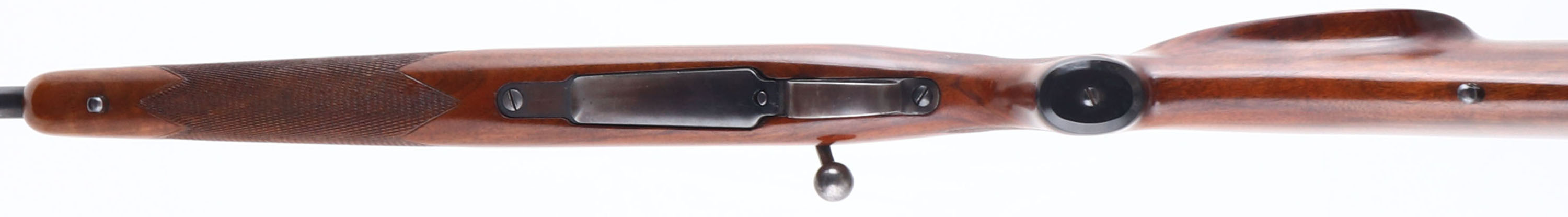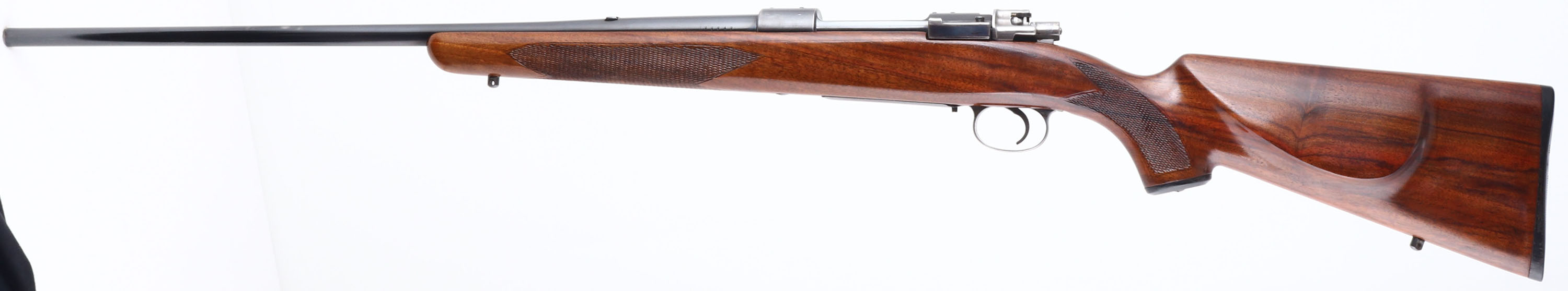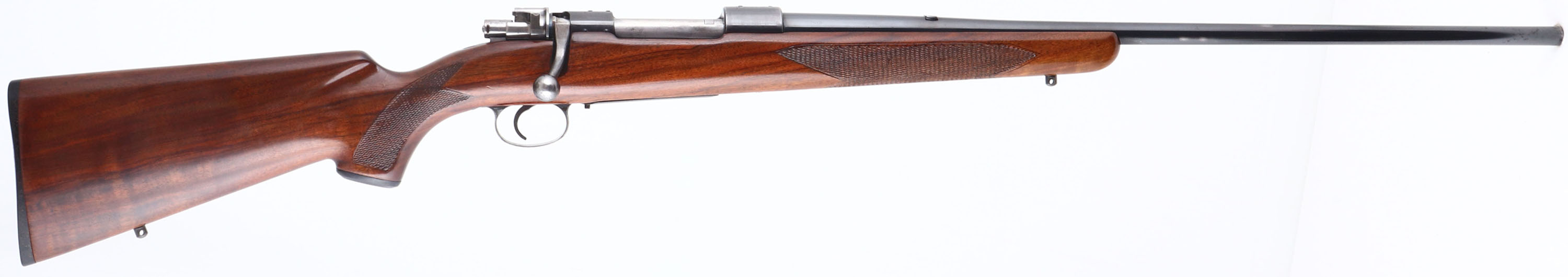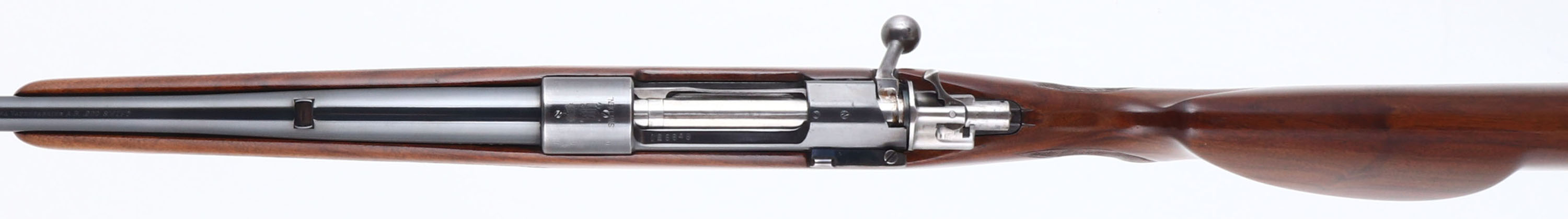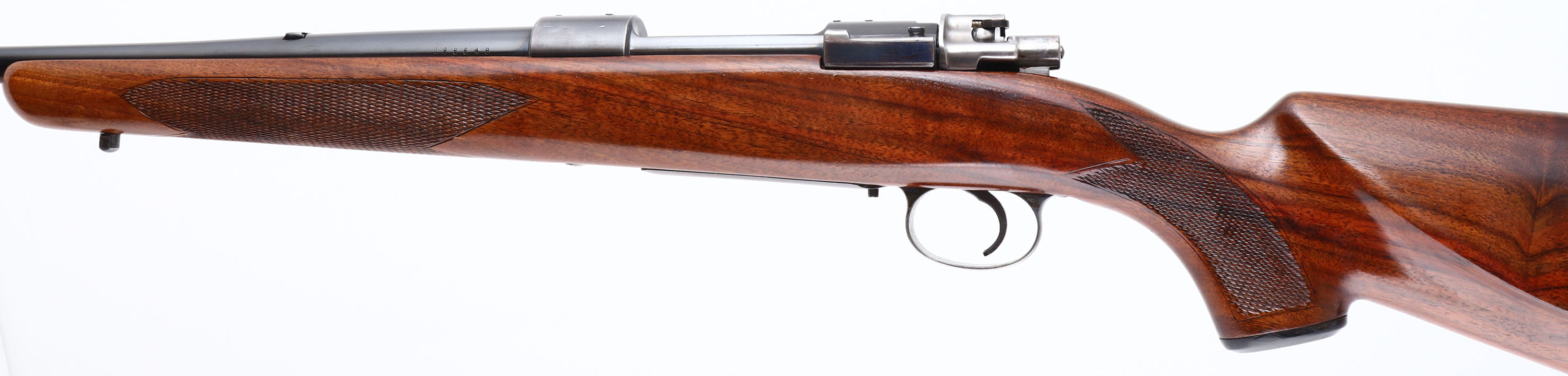 Husqvarna, Hi-Power Sporting Mauser, CAL: 220 Swift, MFG: 1946-51, SN: 126648, Bolt Action Rifle, 24'' barrel. The checkered, cheeked & capped pistol grip wood stock is excellent. There are very few handling marks to the excellent finish. The metal blue finish on the barrel rates 90%, with spotty areas of finish loss. The metal blue finish on the receiver rates 80%, toning a bit plum & with areas worn to metal grey. Finish on the floorplate & trigger guard has worn & tone to 30% of a thin brown patina. Bore is excellent. The receiver is tapped & drilled for scope mounts, with (4) screw filled holes. The barrel has a blank filled rear dovetail. Stock carries sling studs & a J.C Higgins plastic buttplate. An excellent looking small caliber varmint rifle. FFL or C&R Req. - Value: 400 to 800