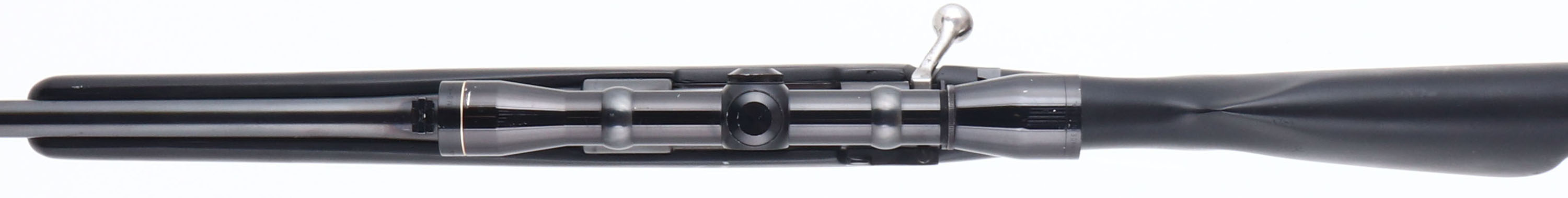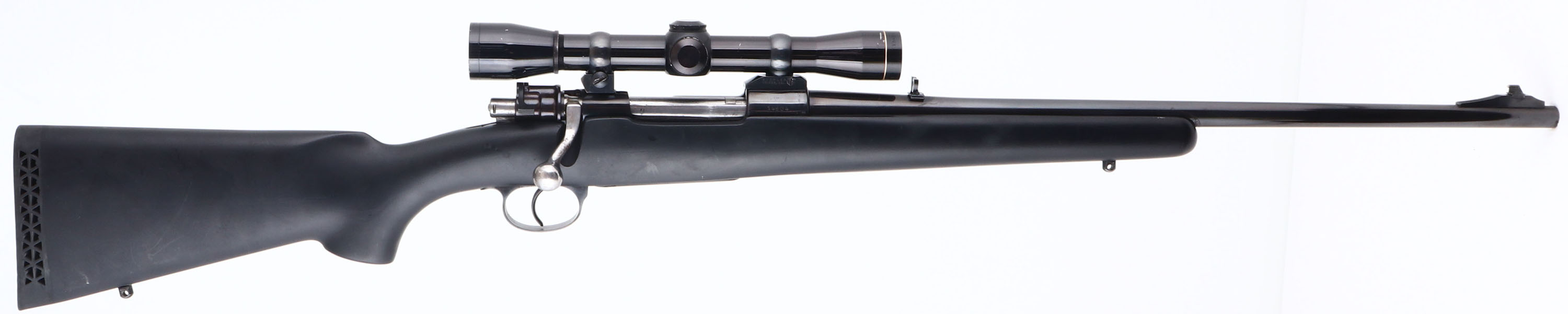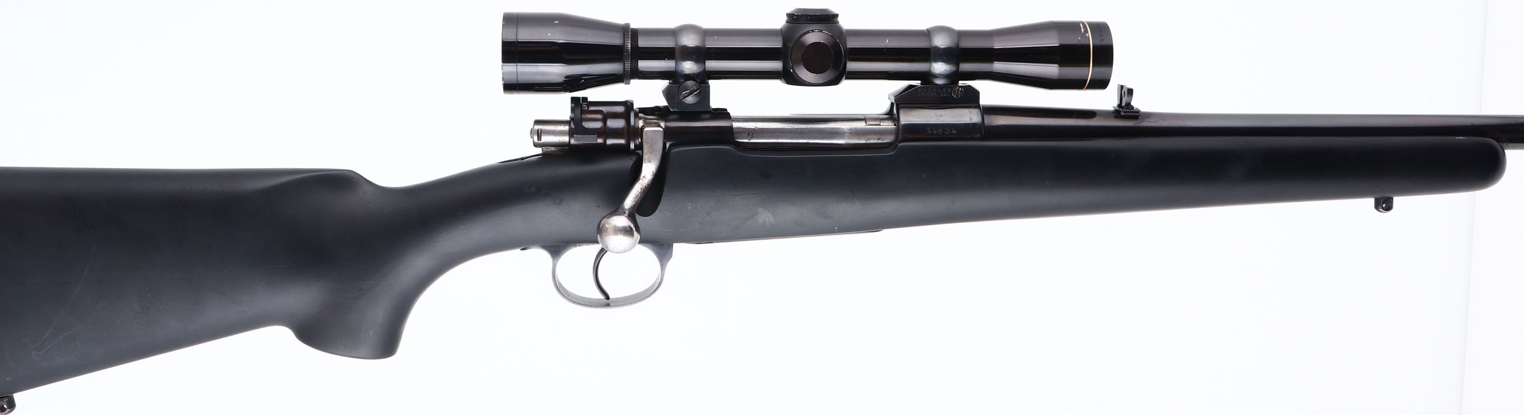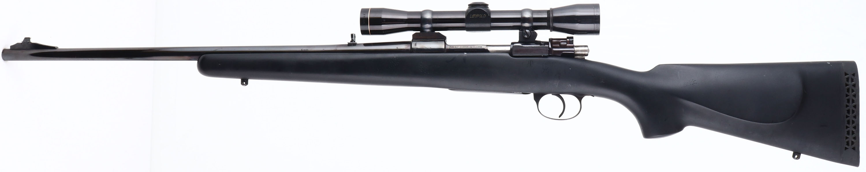 Custom Rifle, Fabrique Nationale d'Armes De Guerre, Columbian Military Mauser action, CAL: 6mm, MFG: N/A, SN: 14834, Bolt Action Rifle, 21'' barrel. The flat pistol grip & raised cheek synthetic stock is excellent, but with several handling marks, scrapes & scuffs. The metal blue finish rates 90%, toning a bit plum & with some spotty areas of wear. Bore is excellent. The receiver carries a Leupold M8-4x scope, while the barrel holds a single leaf flip-up rear sight & ramp elevated blade front sight. Ventilated recoil pad. Sling studs present. A very nice custom built hunting rifle. FFL or C&R Req. - Value: 400 to 800