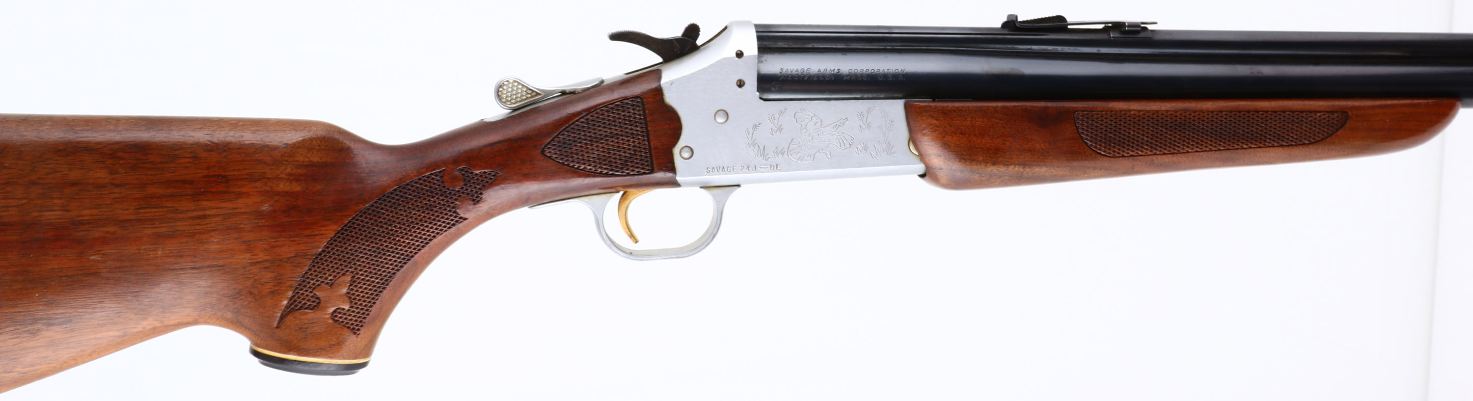 Savage, Model 24J-DL, CAL: 22 WIN MAG R.F. ONLY/ 20 GA, MFG: 1967, SN: NSN, Break Action O/U Combo Gun, 24'' barrels. The checkered & capped pistol grip Monte Carlo wood stocks are excellent & solid, with scrapes, nicks & dings. The original finish is very good, with minor flaking around the wrist. The metal blue finish on the barrels rate 90%, with light scratches & intermittent spotting. The satin silver finish on the receiver is excellent, with minor blemishes. The rifle bore is excellent & bright, with crisp rifling, while the shotgun bore is very good, with normal wear patterns from use. The barrel holds an adjustable rear sight & small ramped front sight. Stock carries a grooved plastic buttplate. Gold tone trigger. A popular combo gun for varmint & bird hunting. FFL or C&R Req. - Value: 300 to 600