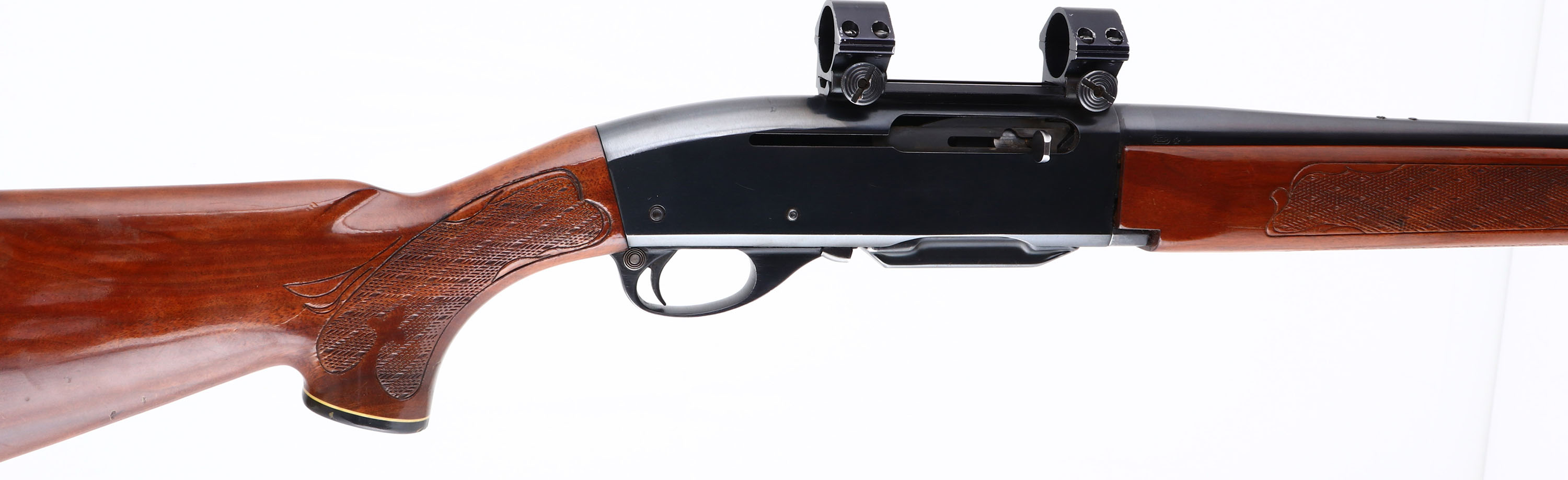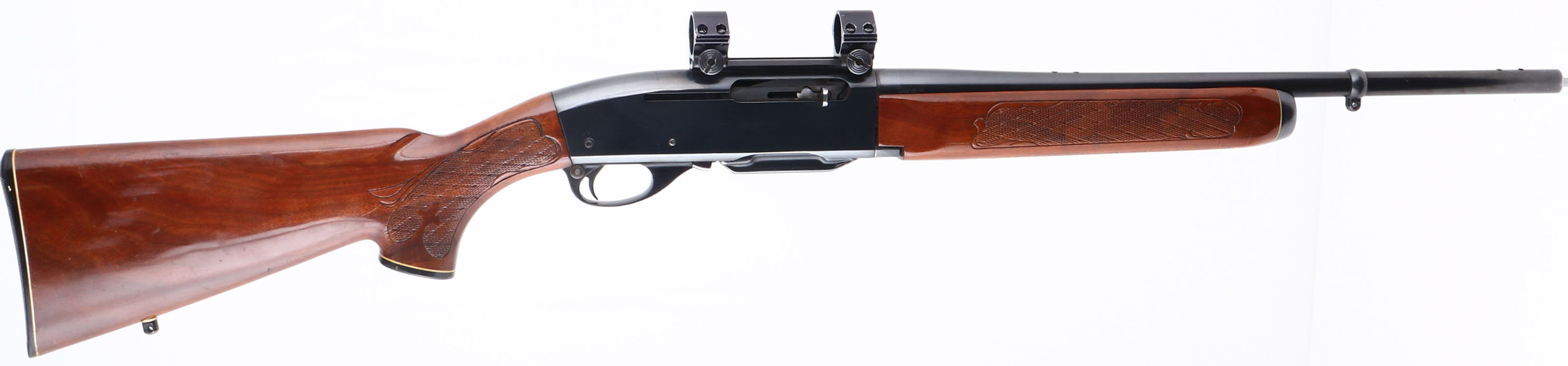 Remington Model 742 Woodsmaster Carbine, CAL 308 Win, MFG: 1968, SN: 349050, Semi-Auto Pump Action Rifle, 18 1/2'' barrel. The high gloss, checkered, capped pistol grip wood stocks are excellent. There is some spotty areas of rub & use wear to the finish. Some finish flaking on the pistol cap. The metal blue finish rates 95%. Bore is excellent. The receiver carries a scope mount & rings, while the barrel holds the screw filled holes from removal of the original sights. Buttstock carries a Remington marked, checkered black plastic buttplate. Removable mag. Sling studs. A very nice example of a newer 742. FFL or C&R Req. - Value: 400 to 800