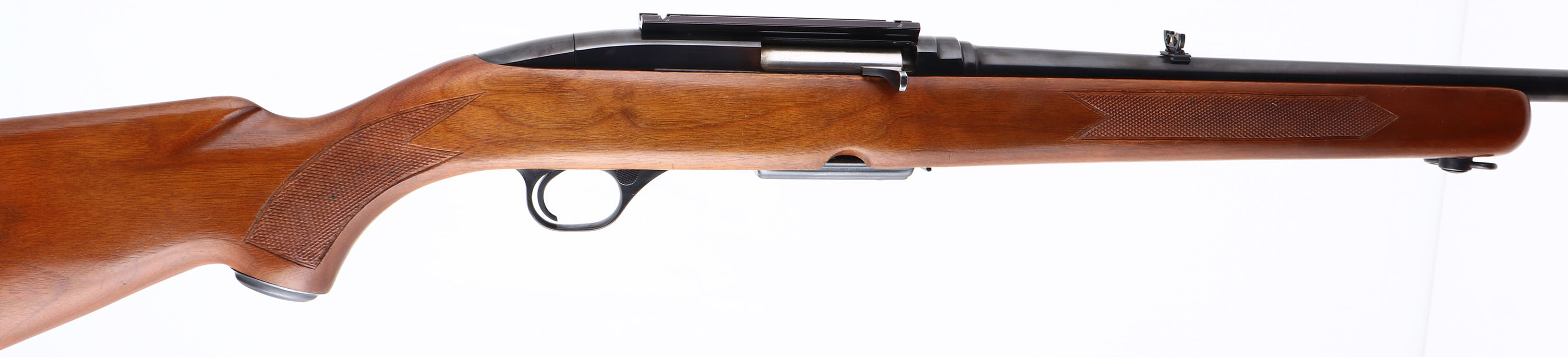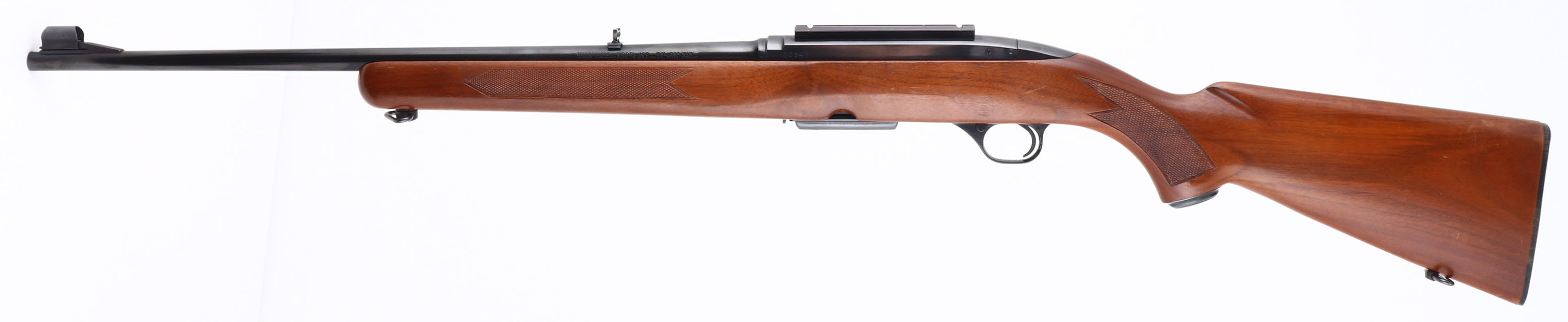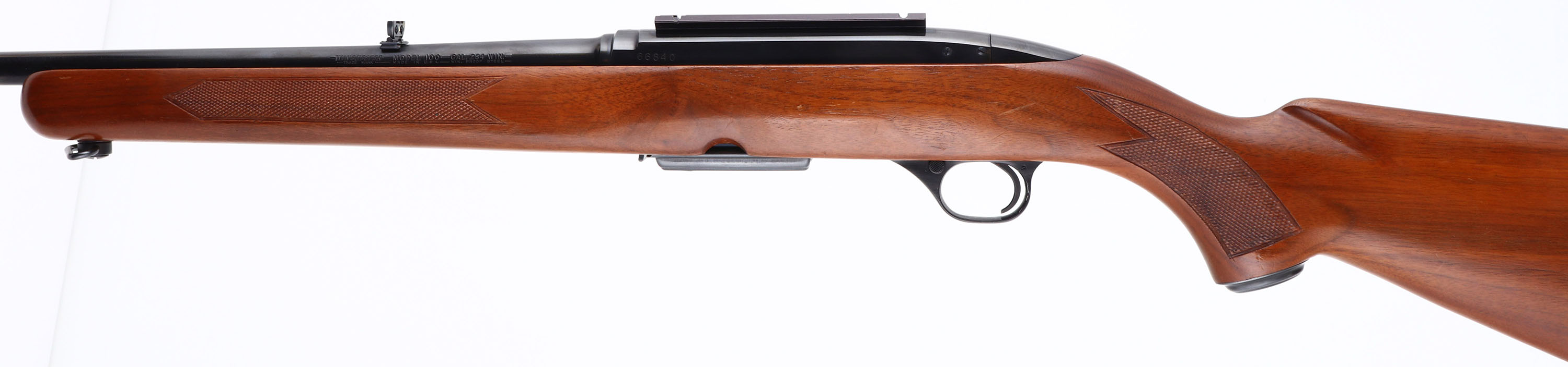 RARE Winchester, Model 100, CAL: 284 WIN, MFG: 1963, SN: 66840, Semi Auto Rifle, 21'' barrel. The Pre-64 hand cut checkered examples in .284 caliber were produced only one year & are the rarest variation & most collectible of Model 100 rifles. The original checkered & capped pistol grip wood stock is excellent, with minor scrapes & dings to the original finish. The metal blue finish rates 98% overall, with some touch ups to scrapes on the base of the trigger guard. Bore is excellent, with strong rifling. The receiver carries a scope base, while the barrel holds a flip-up rear sight & ramp elevated hooded blade front sight. Stock carries a checkered buttplate. Rear sling loop & front sling swivel. Detachable 4 round mag. Comes with a partial box (18rds) of Winchester-Western Super-X Ammo. An overall excellent & collectible example. FFL or C&R Req. - Value: 800 to 1200