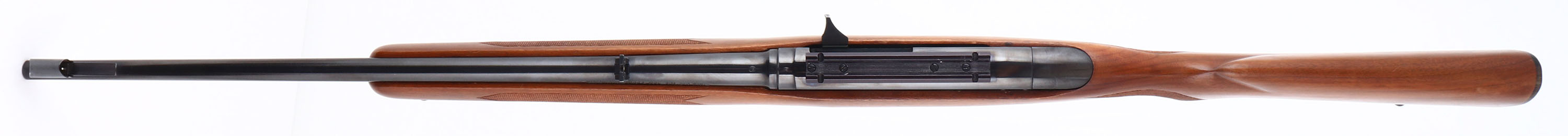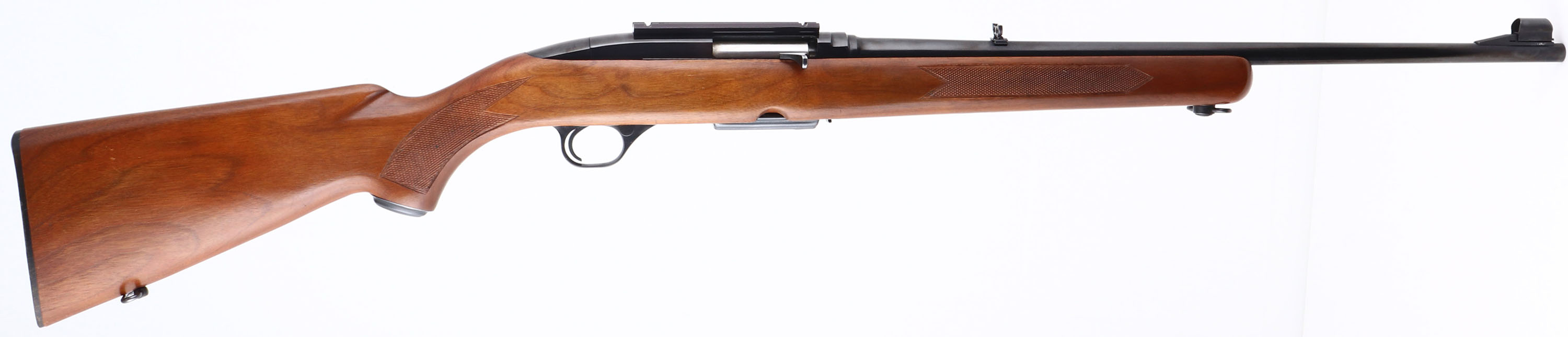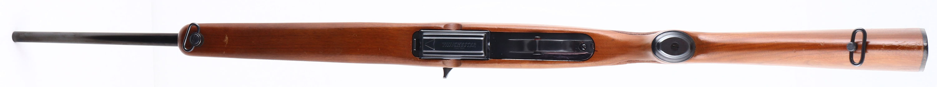 RARE Winchester, Model 100, CAL: 284 WIN, MFG: 1963, SN: 66840, Semi Auto Rifle, 21'' barrel. The Pre-64 hand cut checkered examples in .284 caliber were produced only one year & are the rarest variation & most collectible of Model 100 rifles. The original checkered & capped pistol grip wood stock is excellent, with minor scrapes & dings to the original finish. The metal blue finish rates 98% overall, with some touch ups to scrapes on the base of the trigger guard. Bore is excellent, with strong rifling. The receiver carries a scope base, while the barrel holds a flip-up rear sight & ramp elevated hooded blade front sight. Stock carries a checkered buttplate. Rear sling loop & front sling swivel. Detachable 4 round mag. Comes with a partial box (18rds) of Winchester-Western Super-X Ammo. An overall excellent & collectible example. FFL or C&R Req. - Value: 800 to 1200