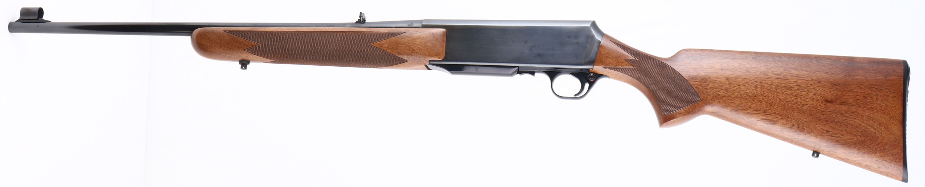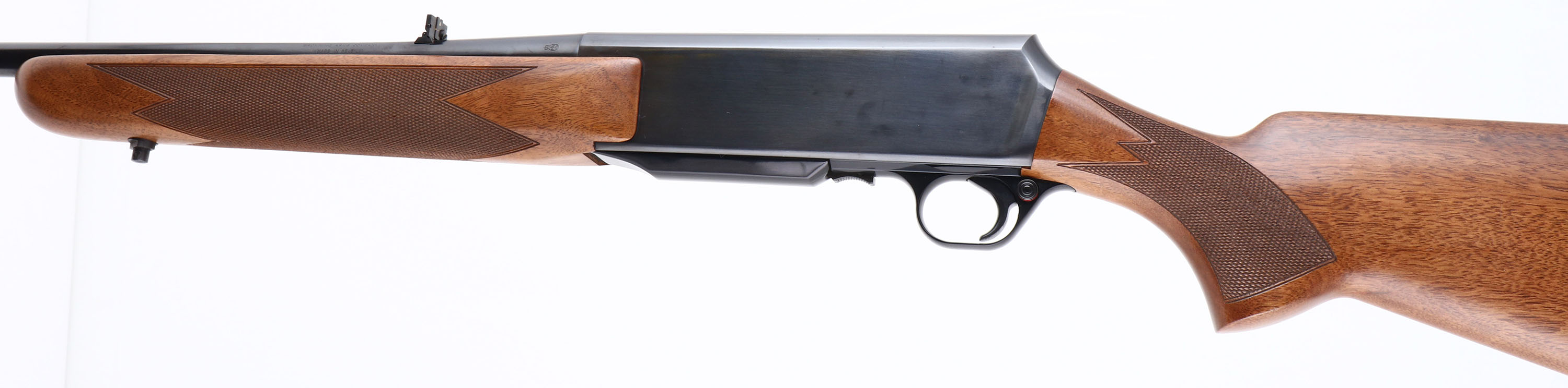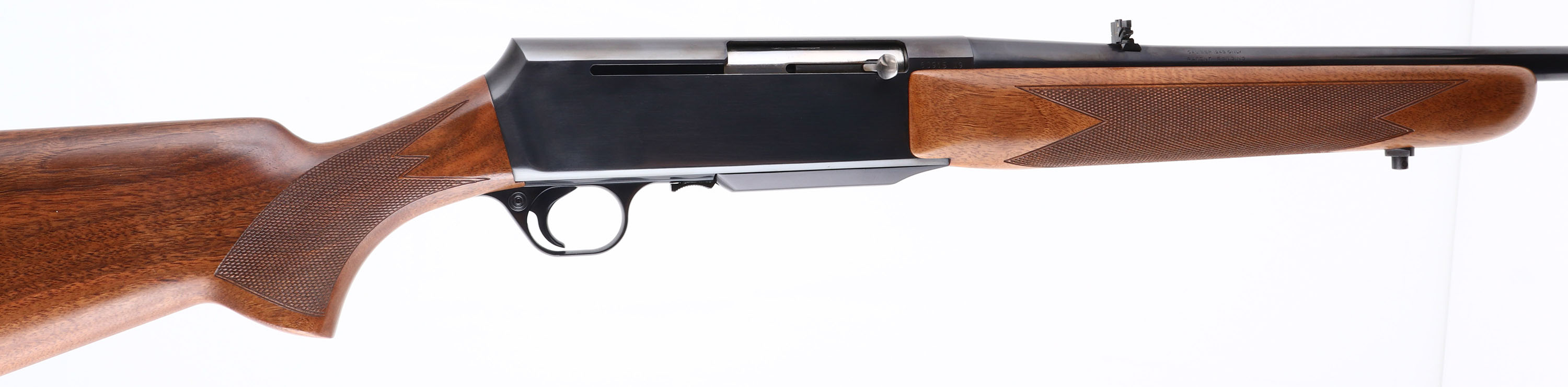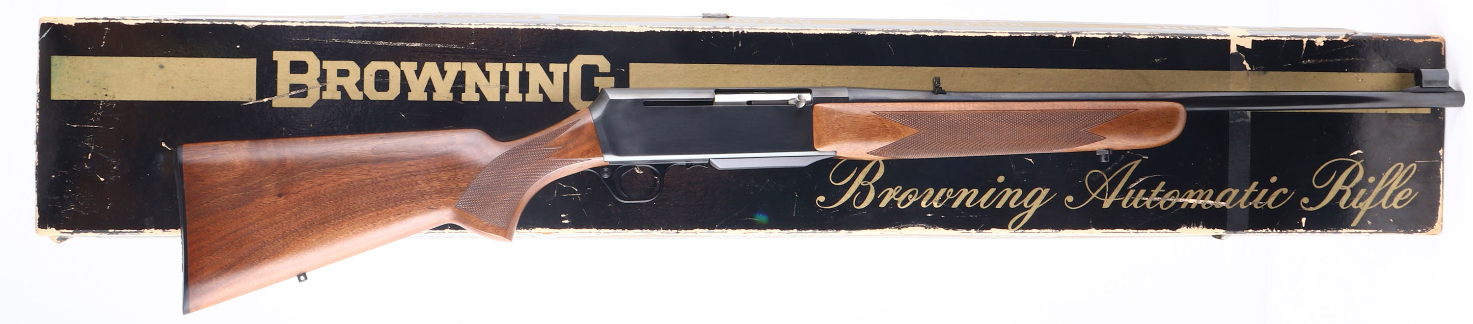 BOXED, Browning, BAR, CAL: .243, MFG: 1969, SN: 60915M9, Semi Auto Rifle, 22'' Barrel. This is a new in box old stock rifle consigned by the original purchaser, that has remained in the original box & was never fired outside the factory test. The original checkered flat pistol grip wood stocks are excellent, basically mint. The metal blue finishes rate 99%+. Barrel carries the original folding leaf rear & hooded from sights. Buttstock carries a factory buttplate. Factory sling studs. Comes in original box, with owners manuals & original packaging. A vintage NIB rifle & a very fine collectible. FFL or C&R Req. - Value: 1500 to 2500